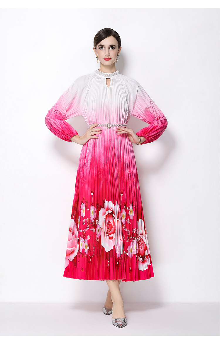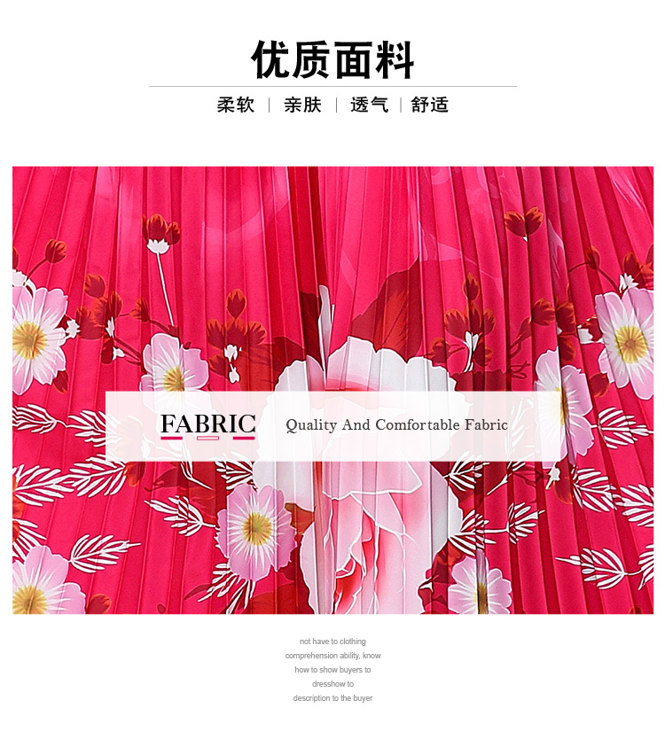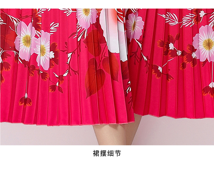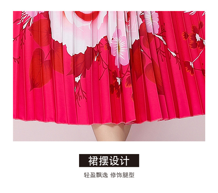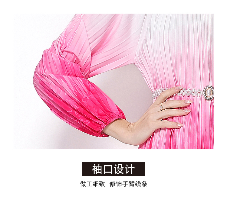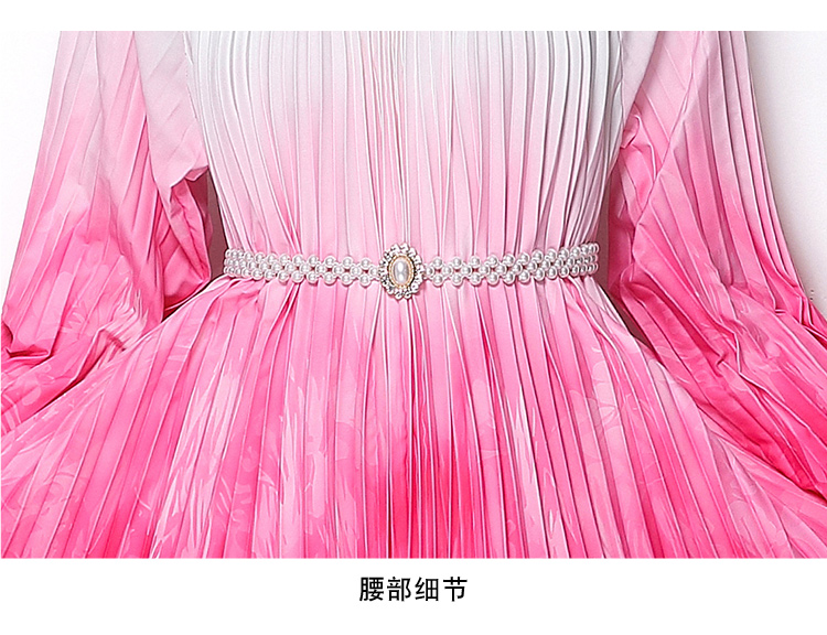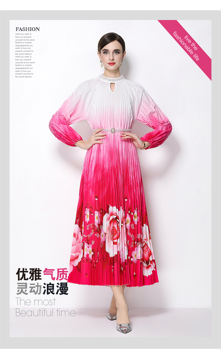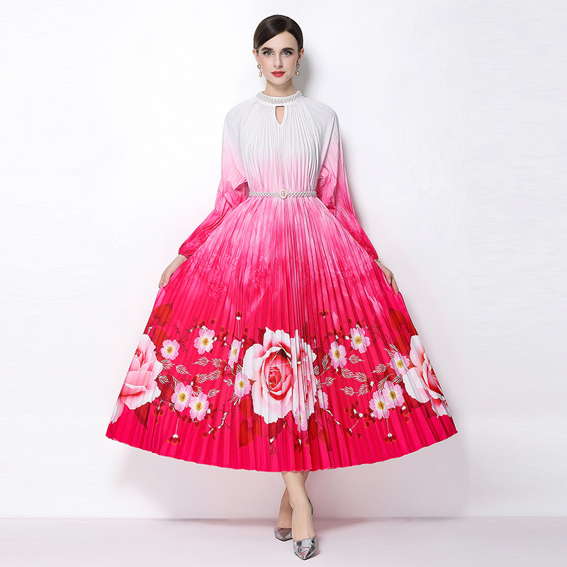 MY16256# 高端钉珠定位印花压褶珍珠扣百褶长裙女裝貨源服裝批發