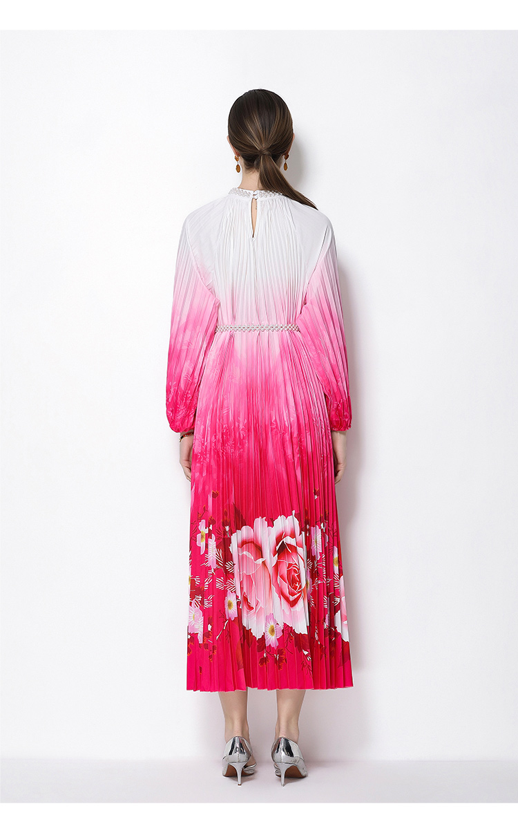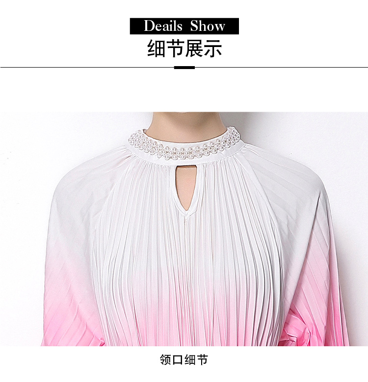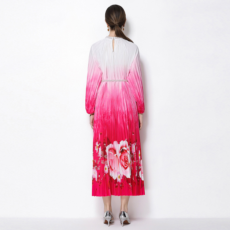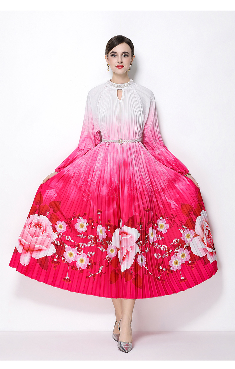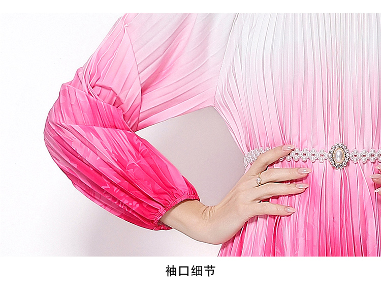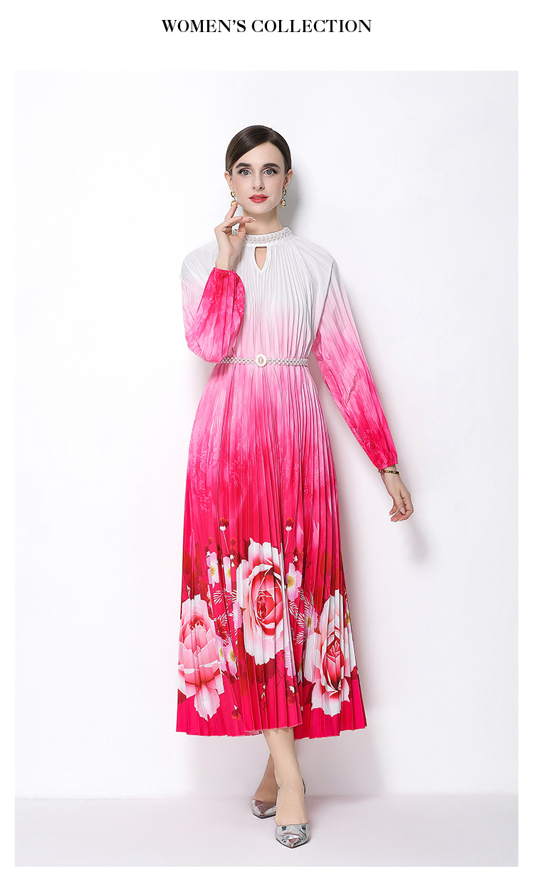 MY16256# 高端钉珠定位印花压褶珍珠扣百褶长裙女裝貨源服裝批發