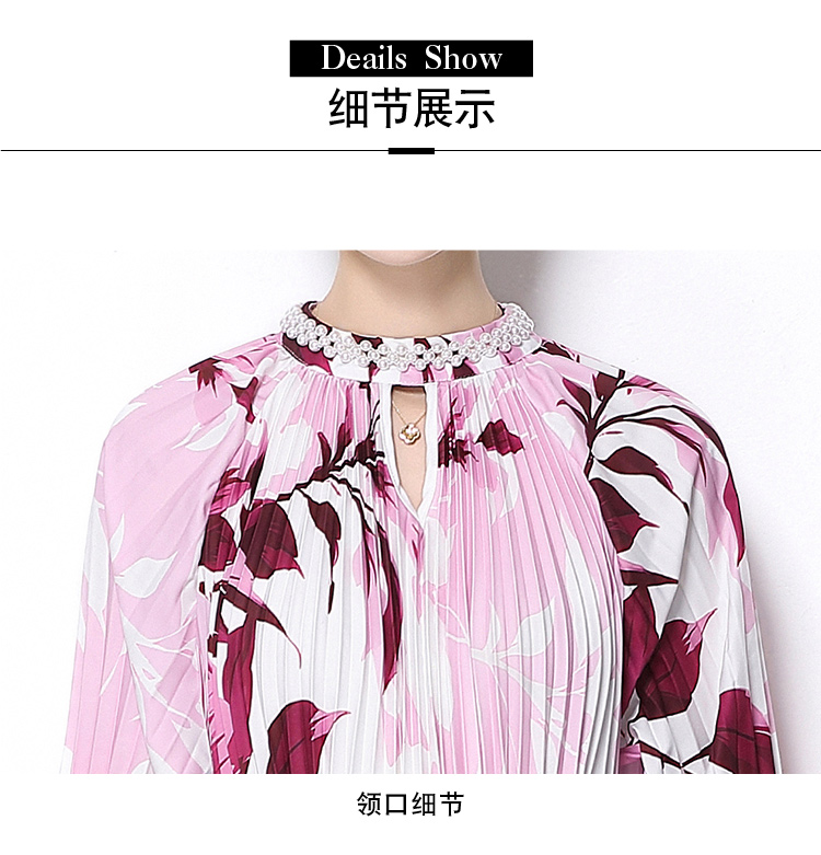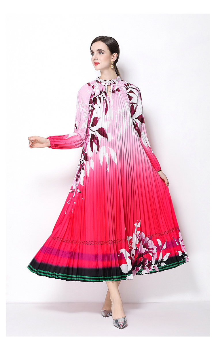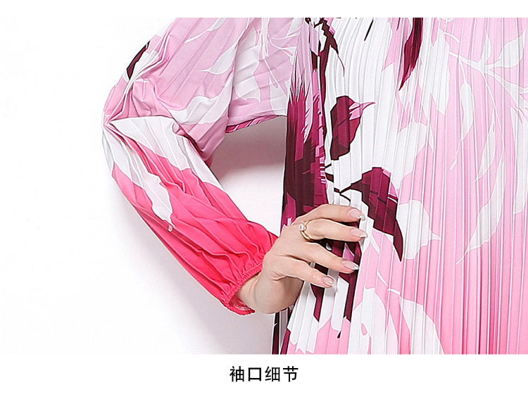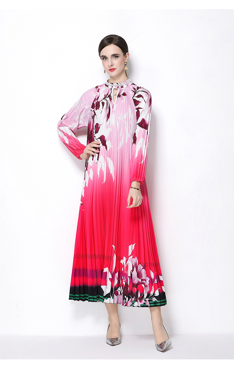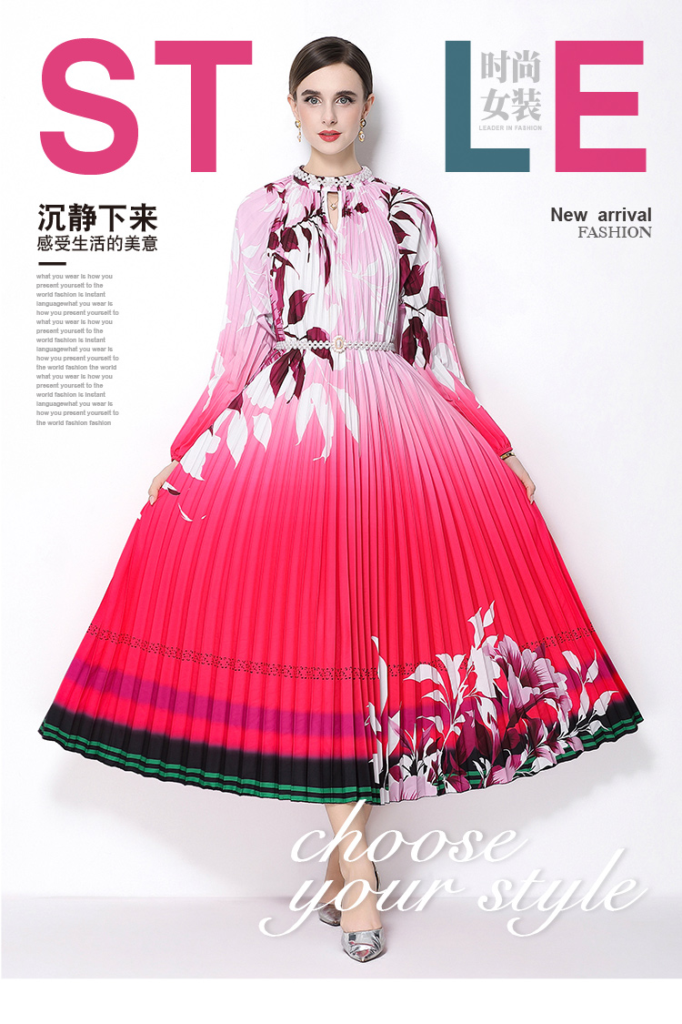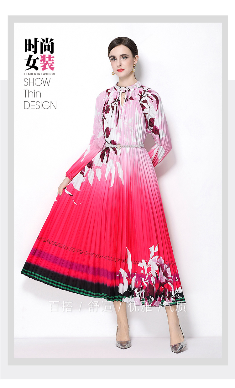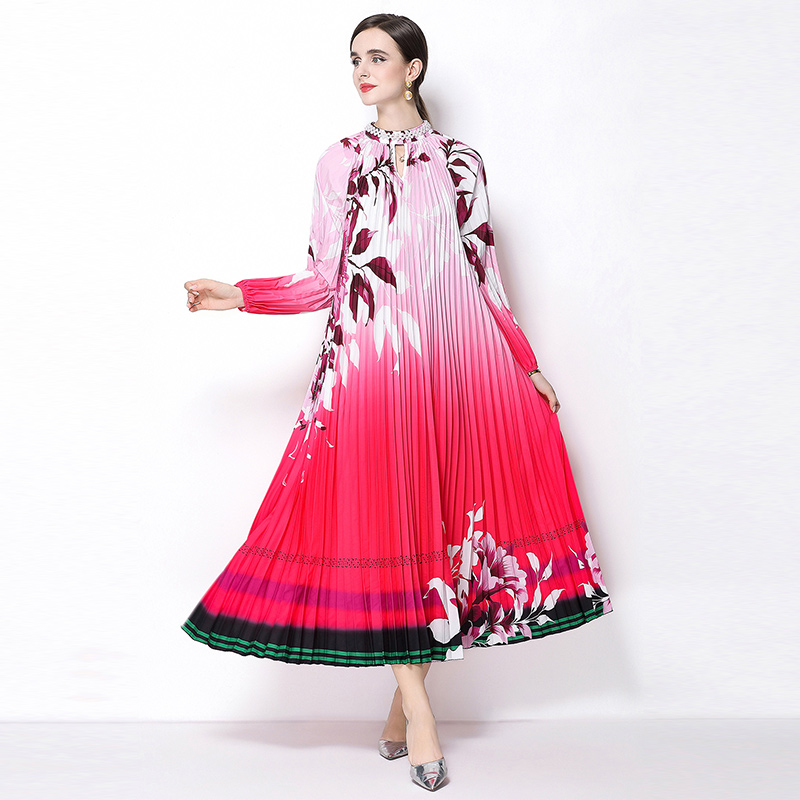 MY16257# 高端钉珠定位印花压褶珍珠扣百褶长裙女裝貨源服裝批發