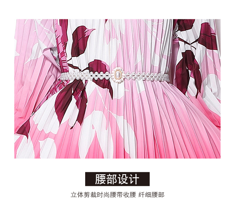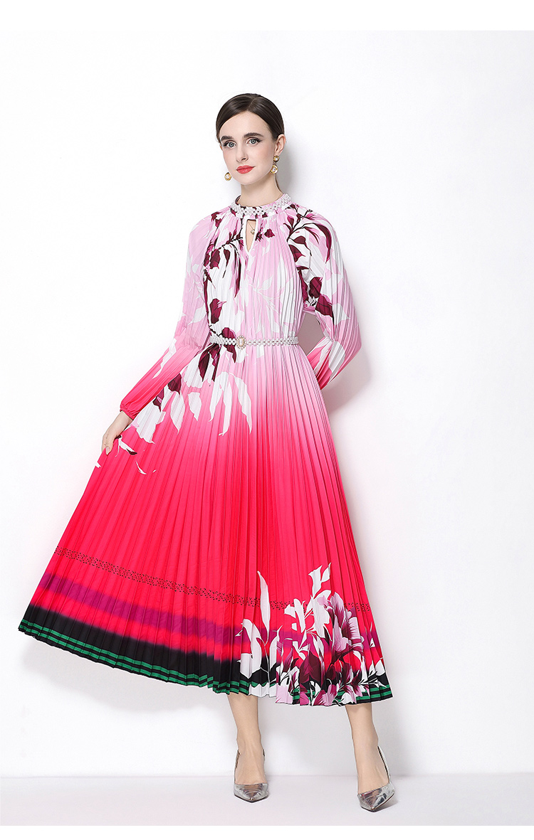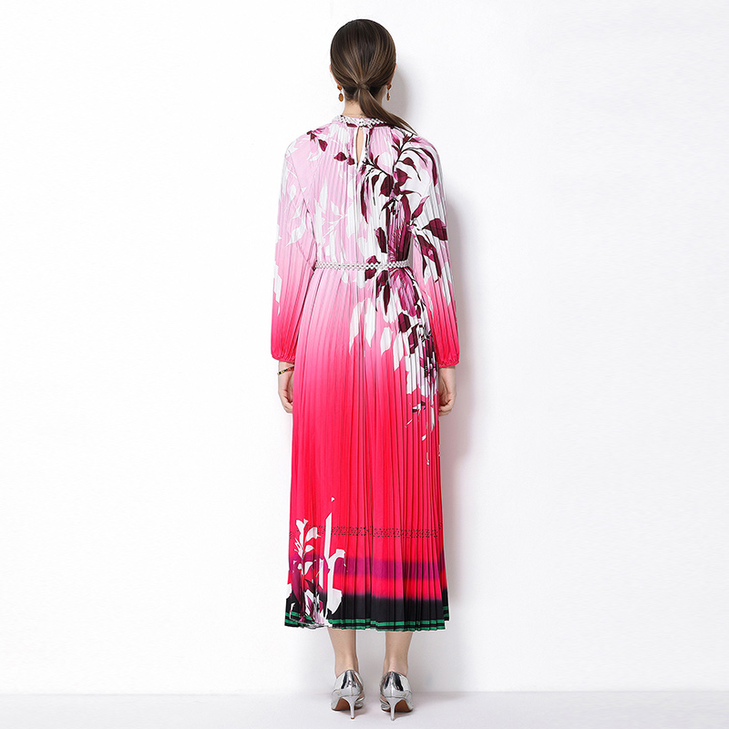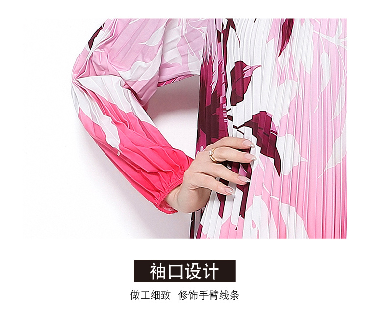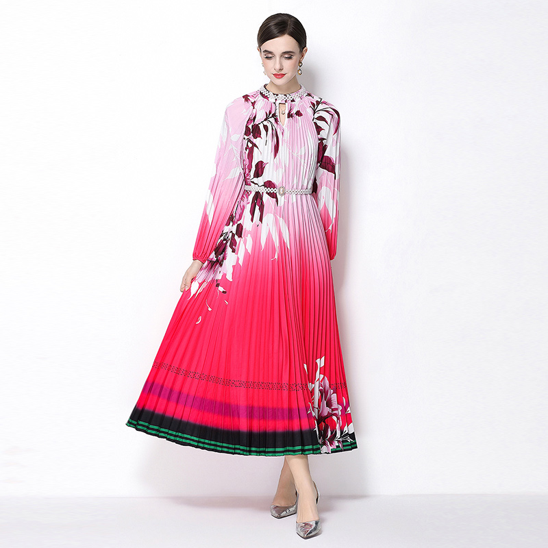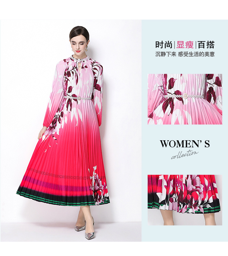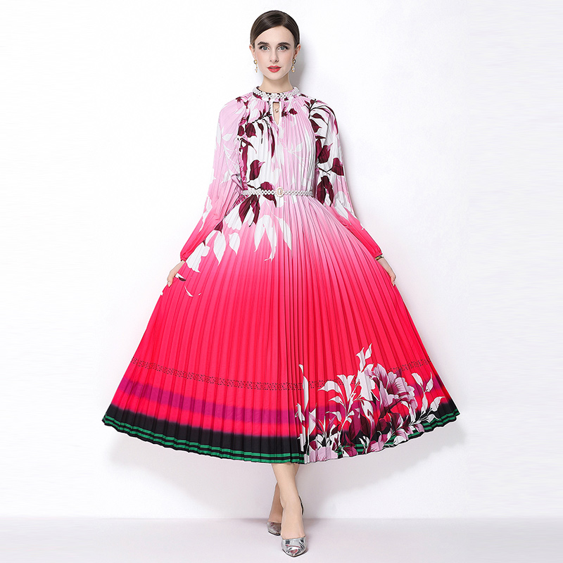 MY16257# 高端钉珠定位印花压褶珍珠扣百褶长裙女裝貨源服裝批發