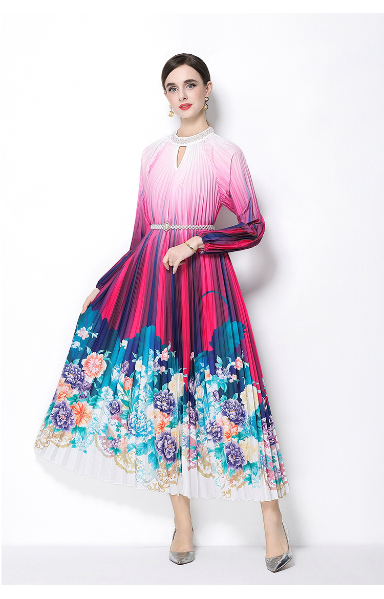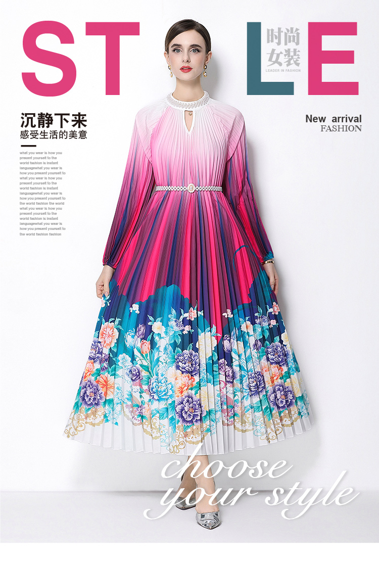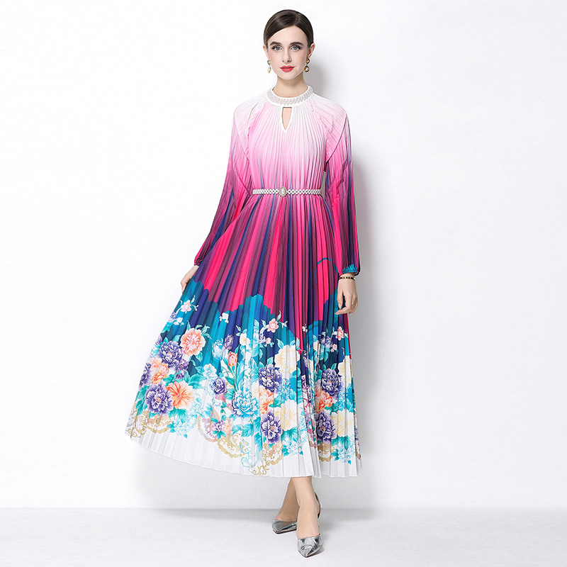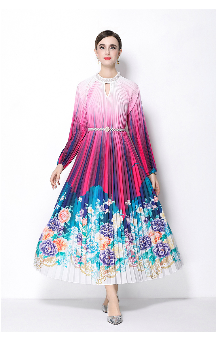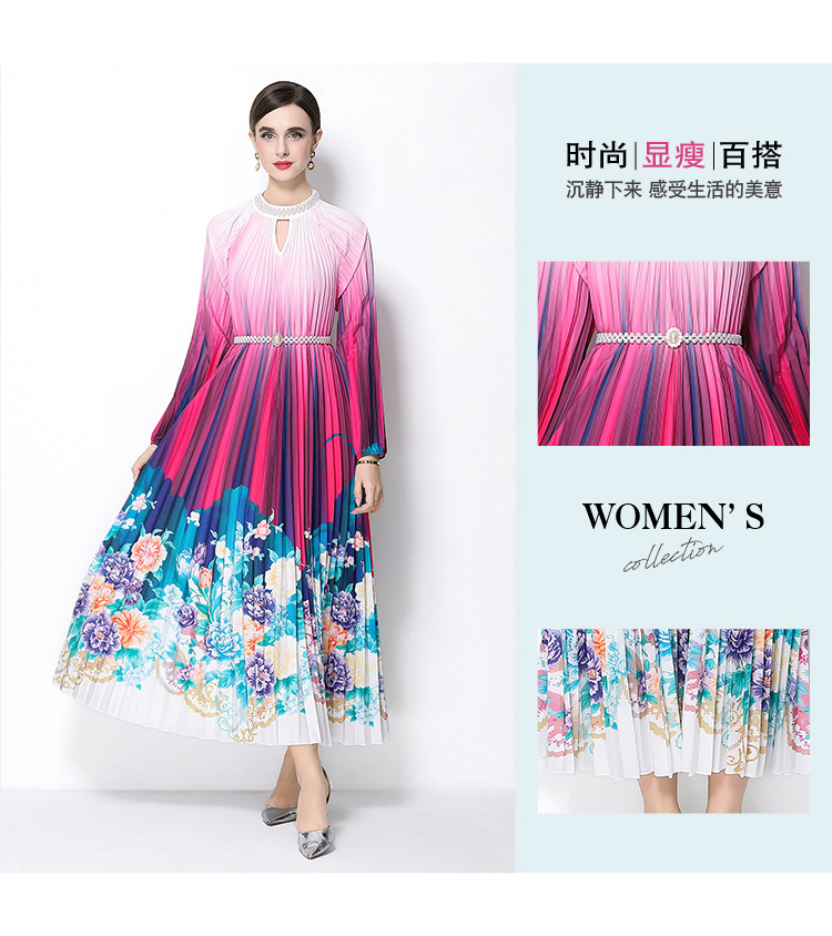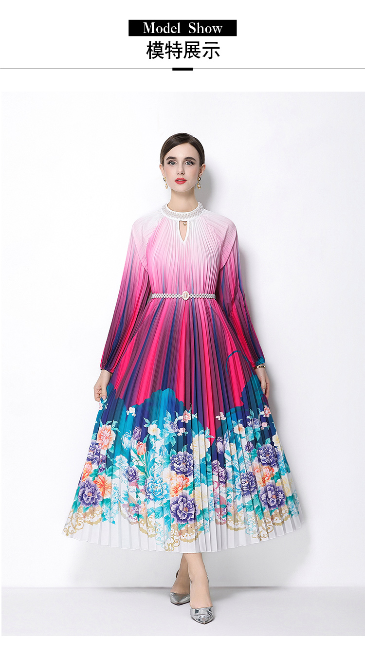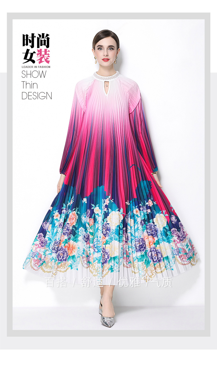 MY16258# 高端钉珠定位印花压褶珍珠扣百褶长裙女裝貨源服裝批發
