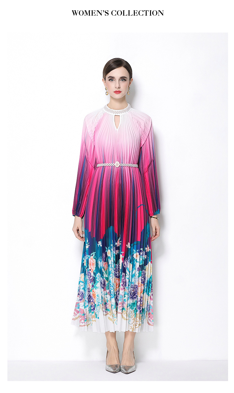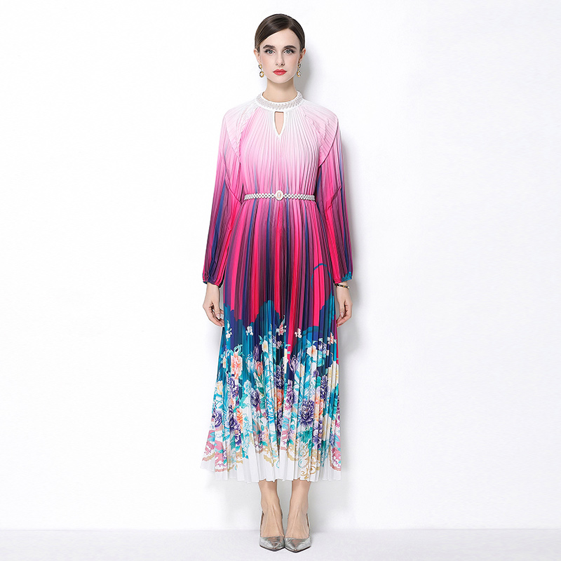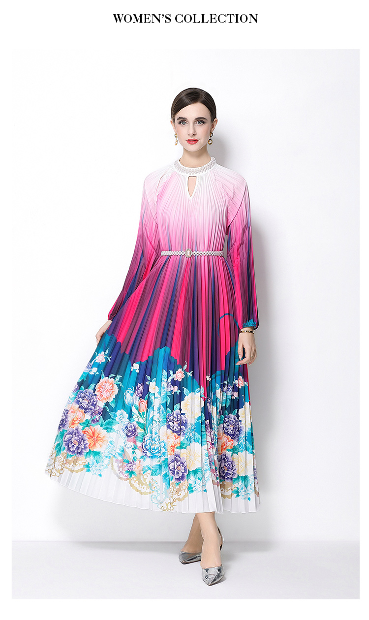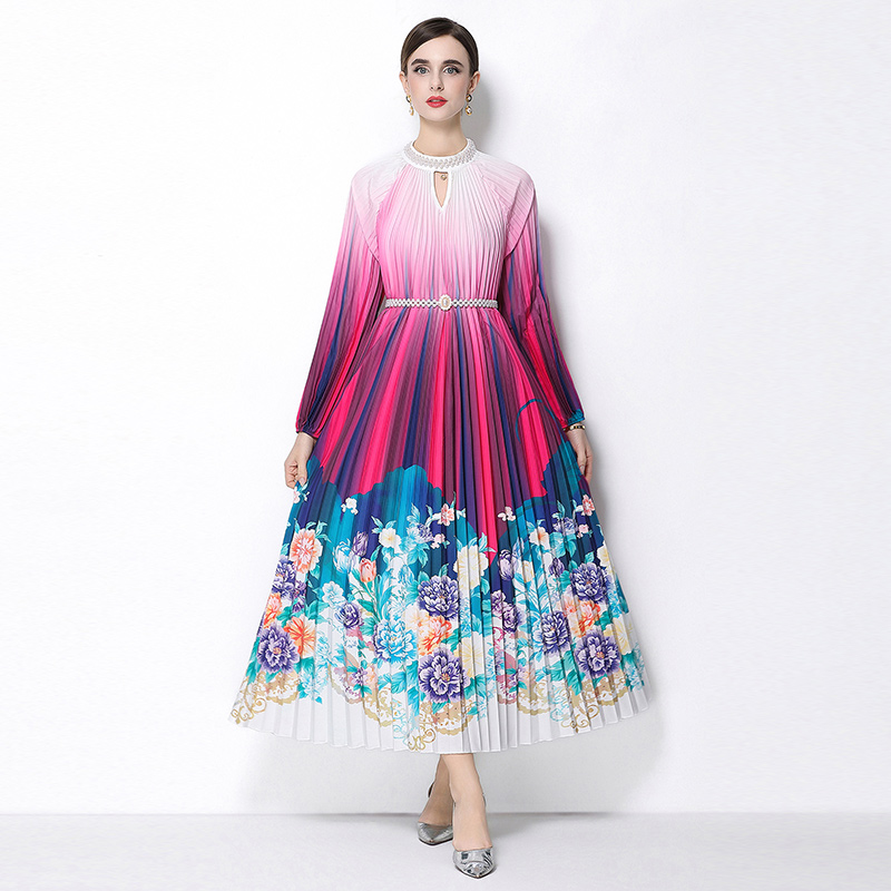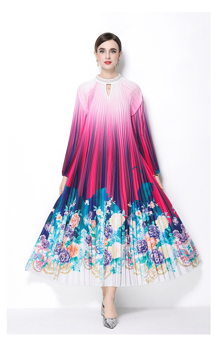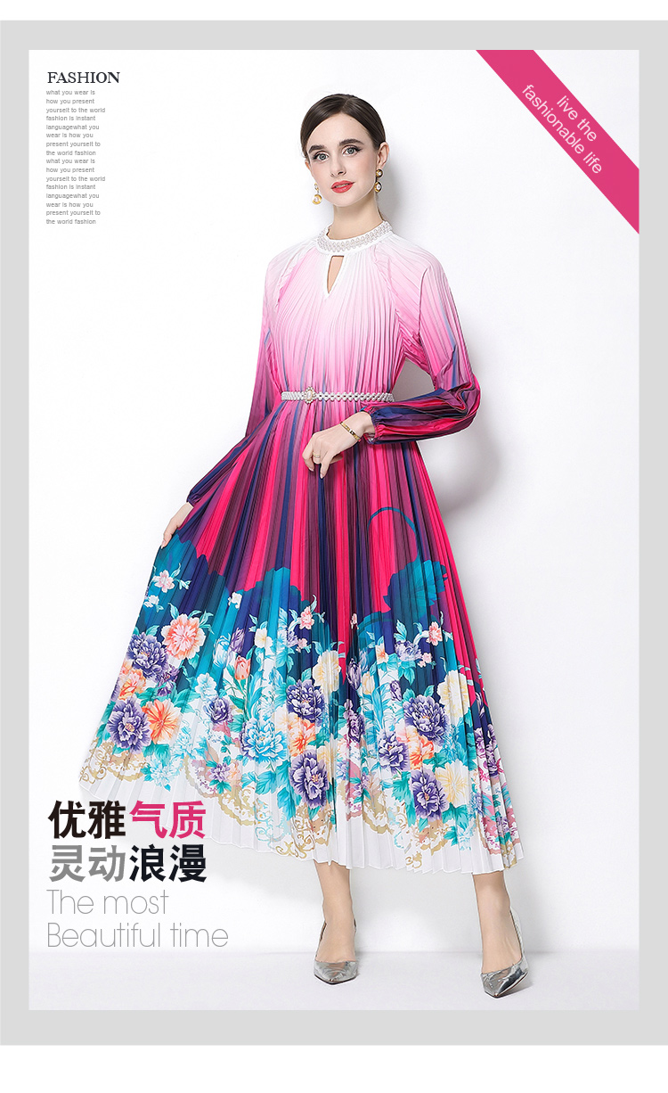 MY16258# 高端钉珠定位印花压褶珍珠扣百褶长裙女裝貨源服裝批發