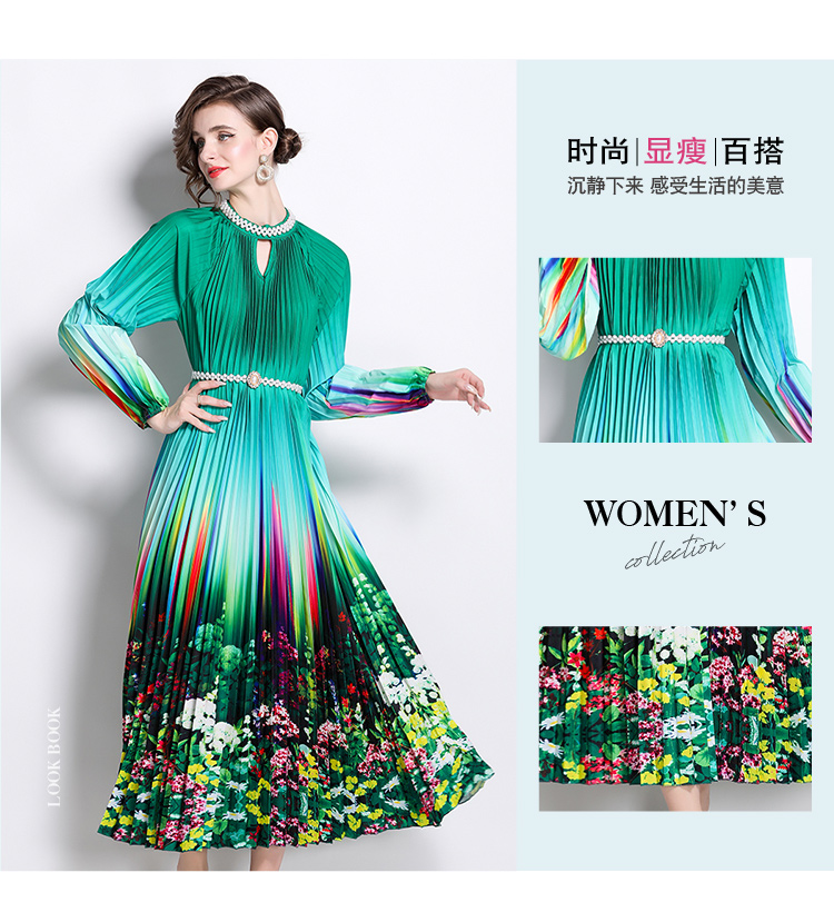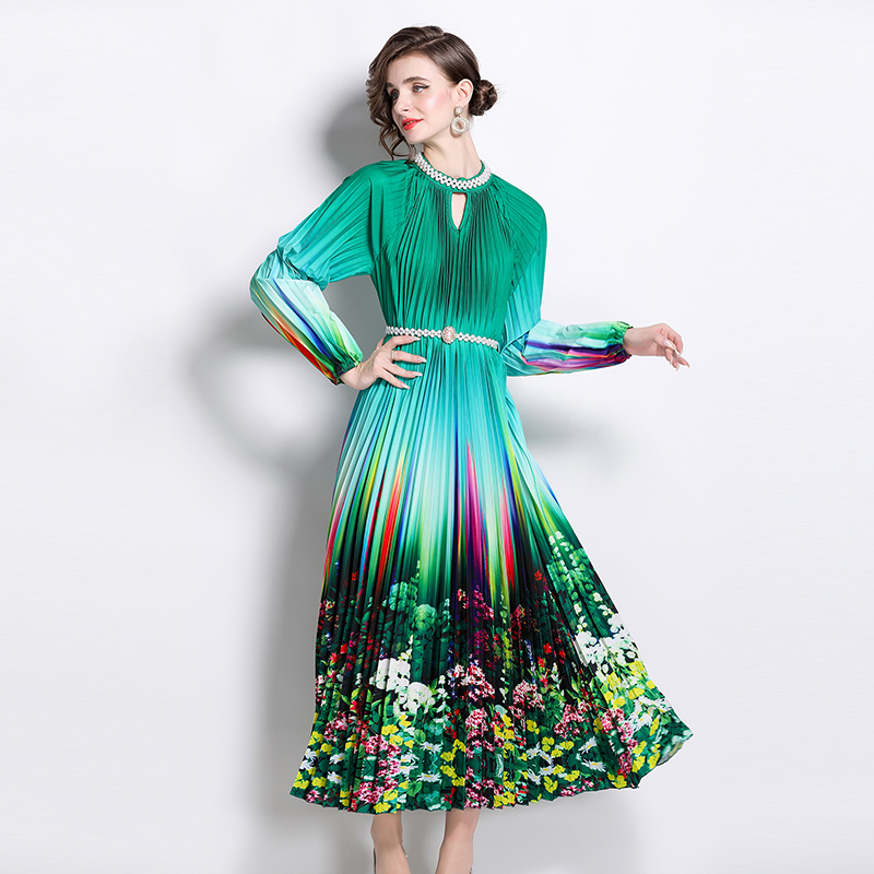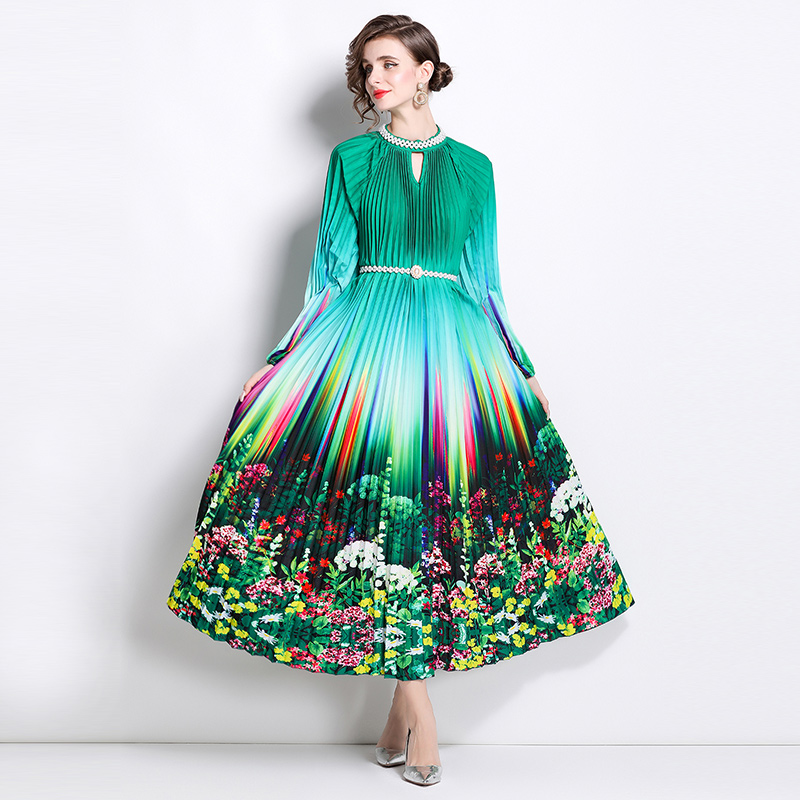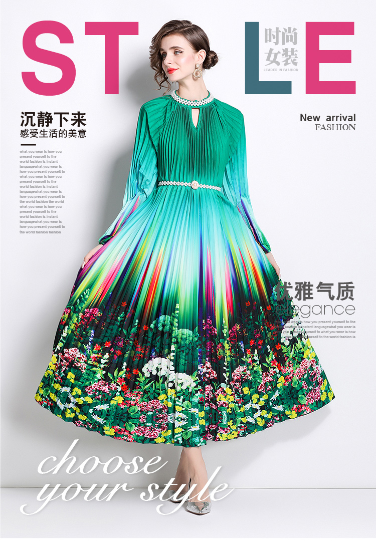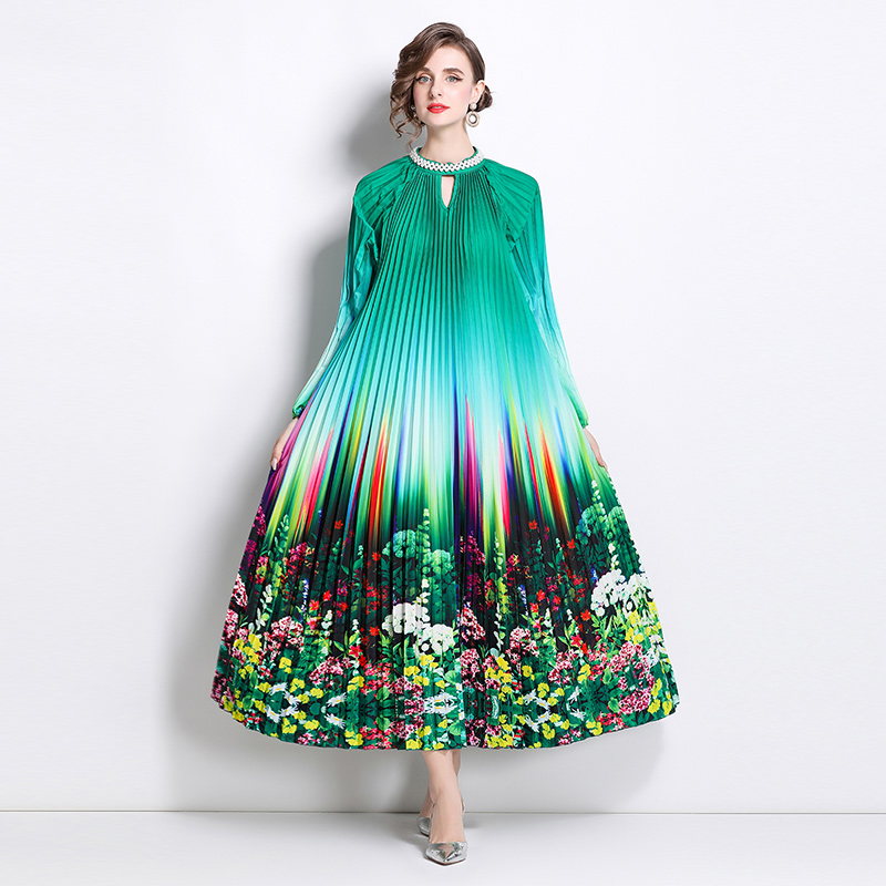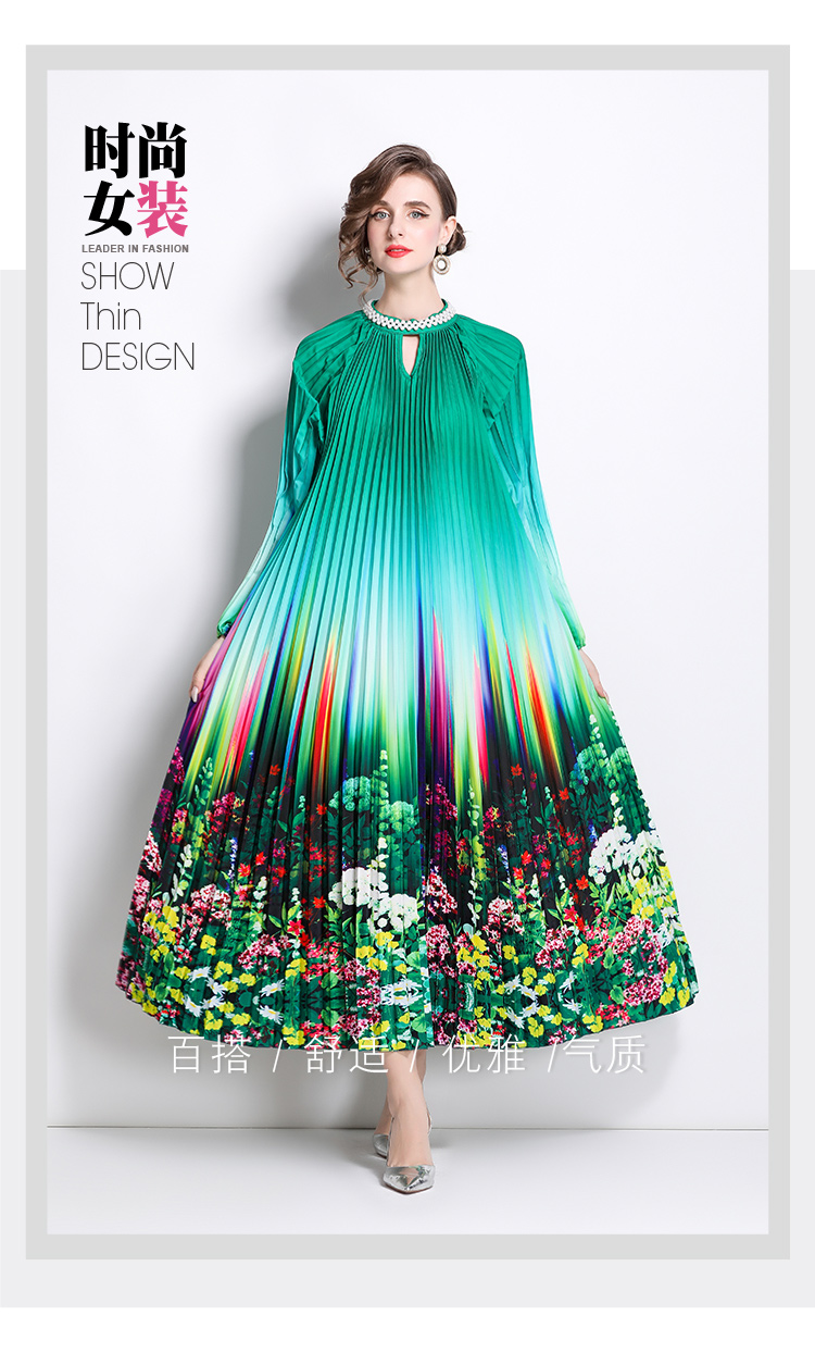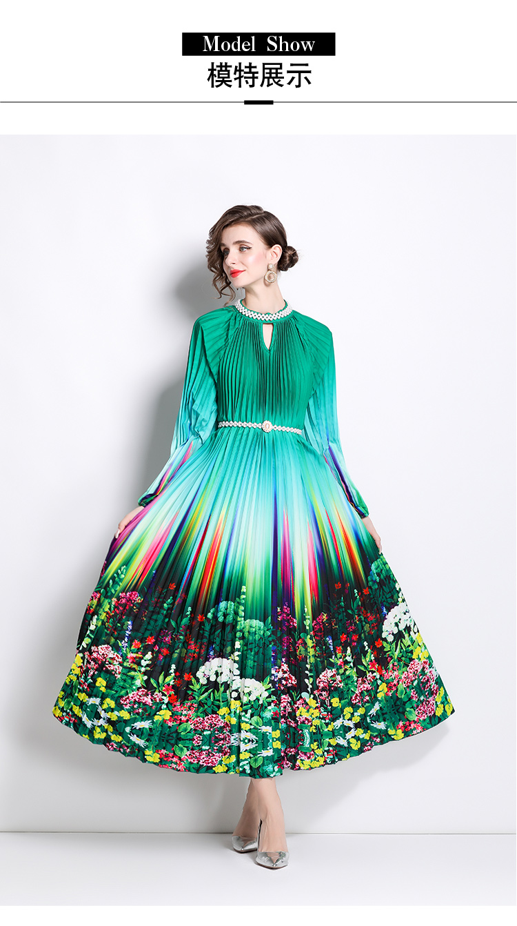MY16260# 高端钉珠定位印花压褶珍珠扣百褶长裙女裝貨源服裝批發