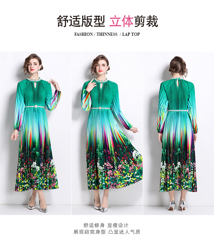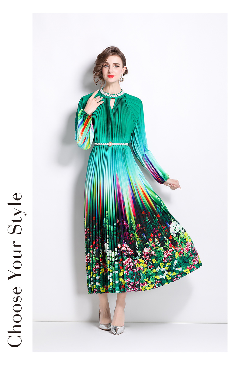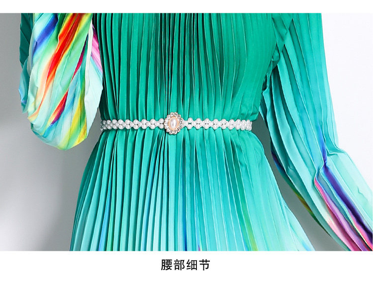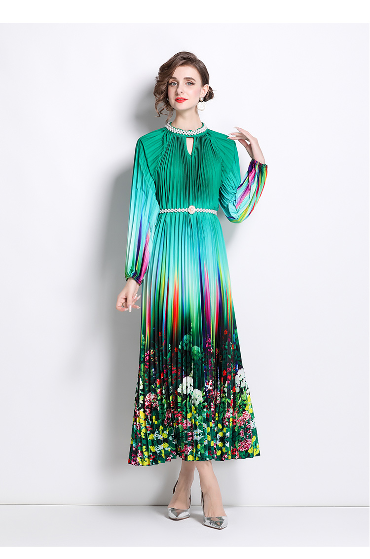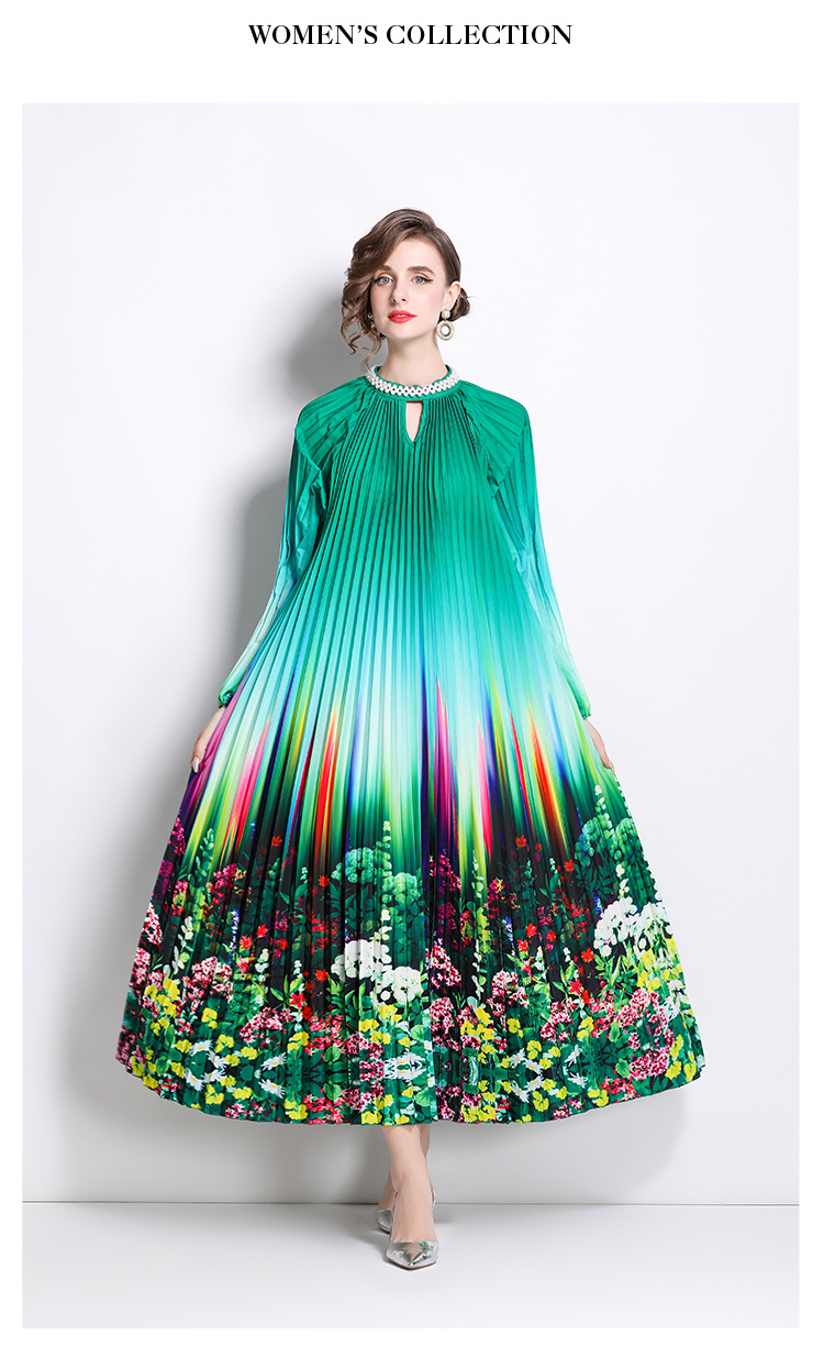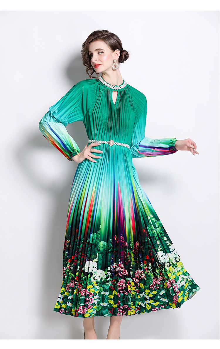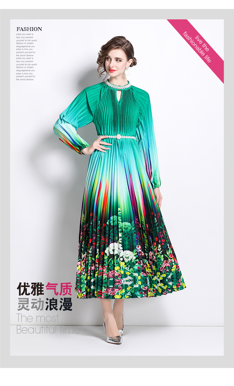 MY16260# 高端钉珠定位印花压褶珍珠扣百褶长裙女裝貨源服裝批發
