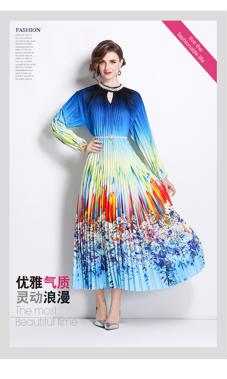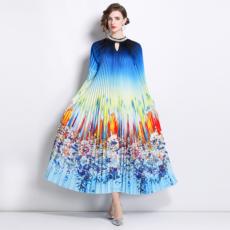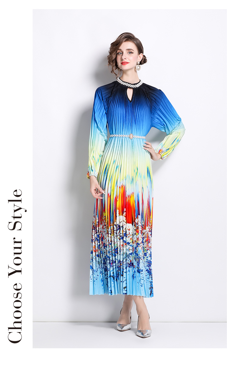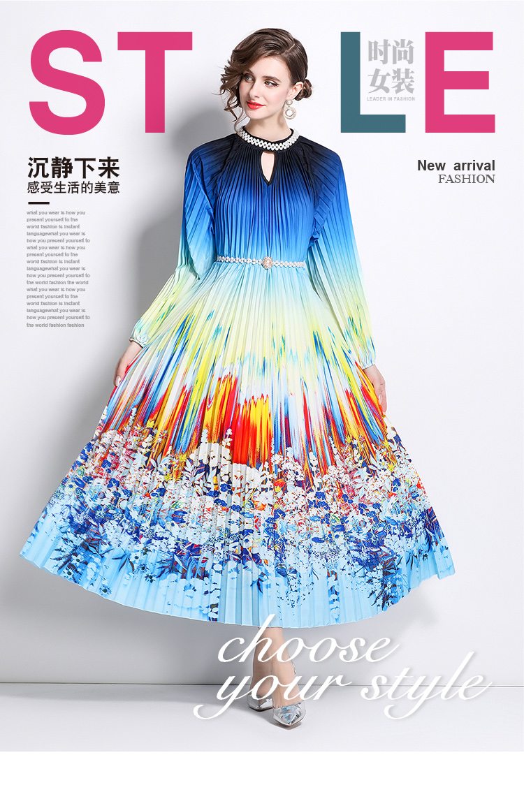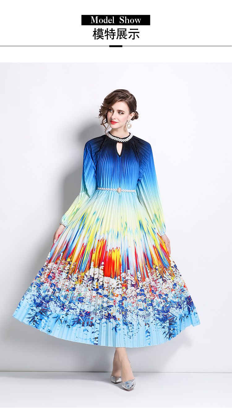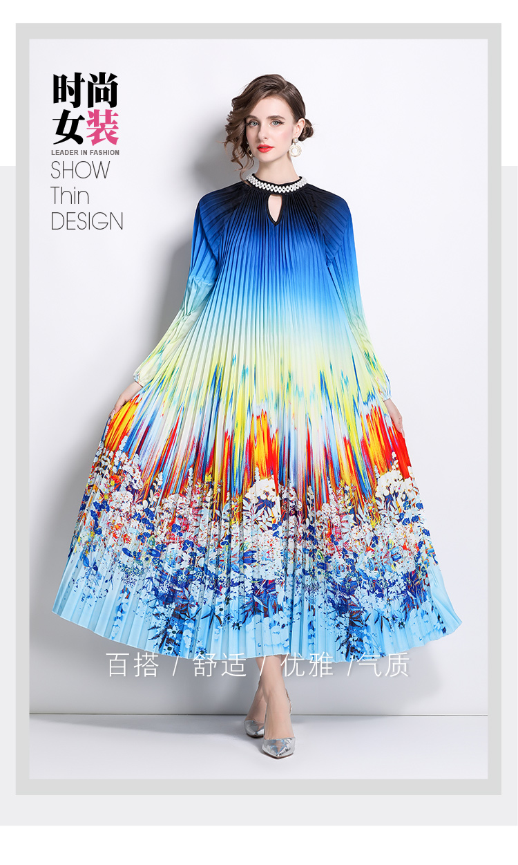 MY16261# 高端钉珠定位印花压褶珍珠扣百褶长裙女裝貨源服裝批發