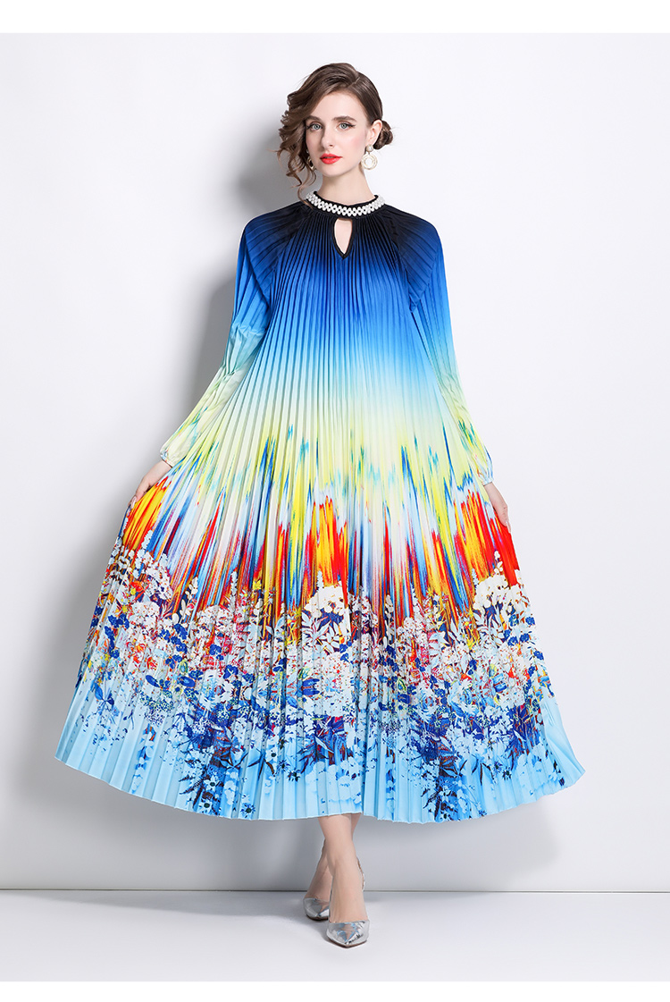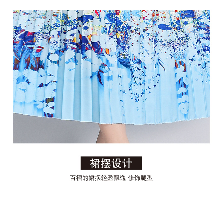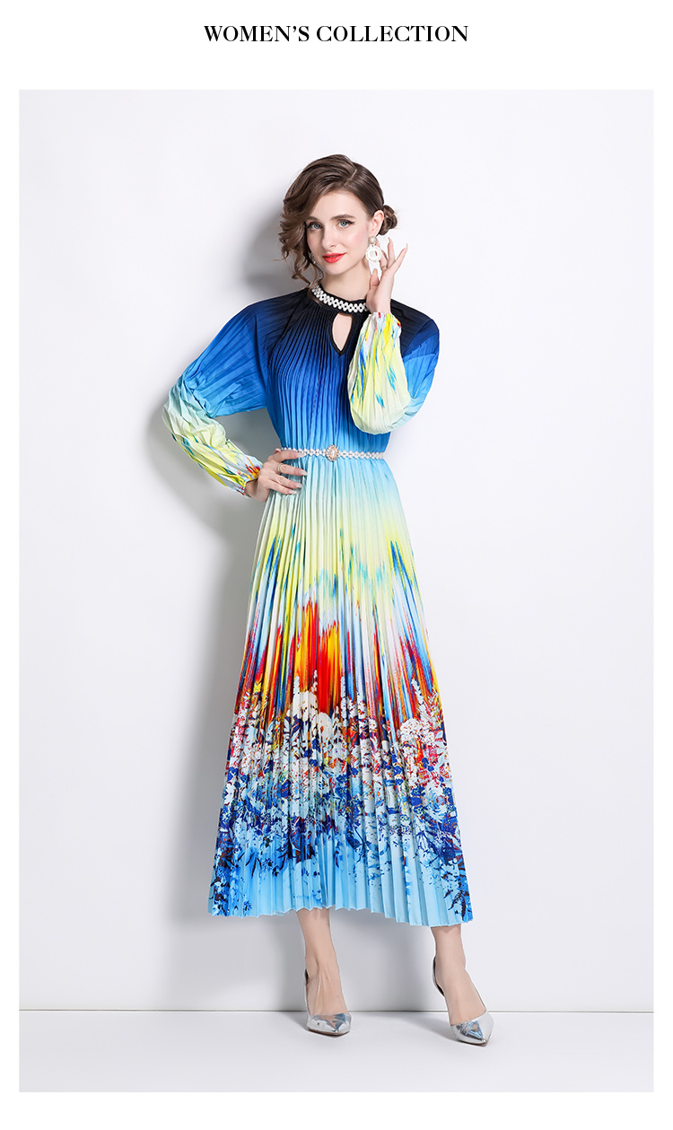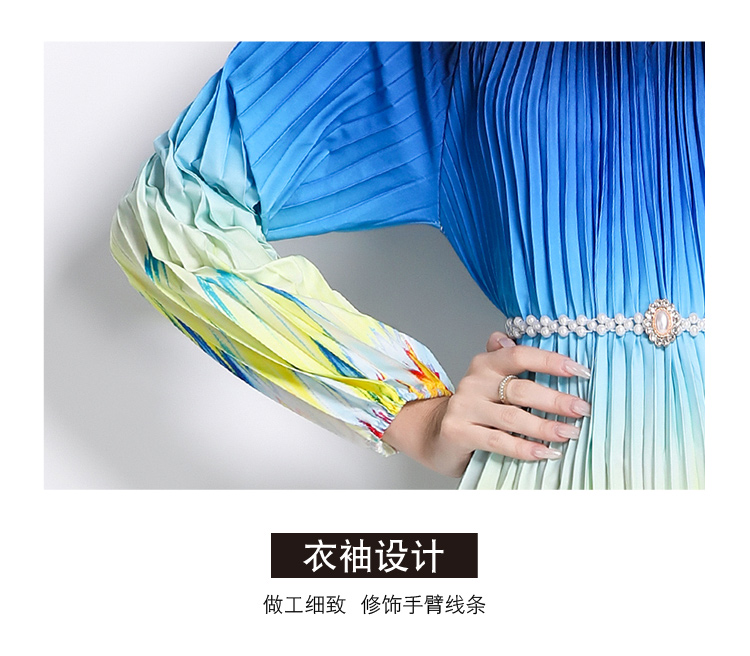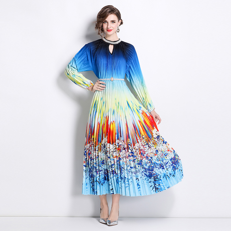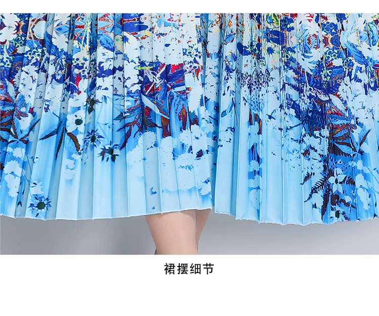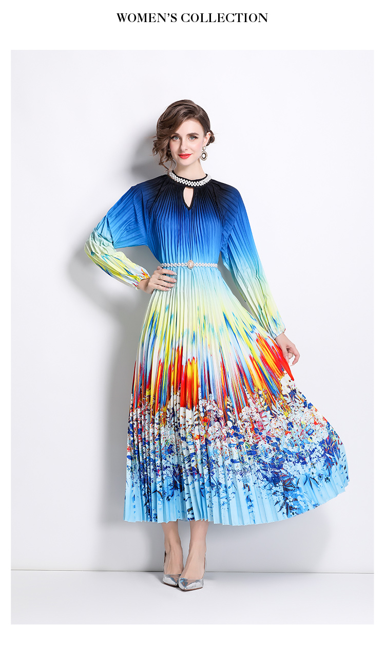 MY16261# 高端钉珠定位印花压褶珍珠扣百褶长裙女裝貨源服裝批發