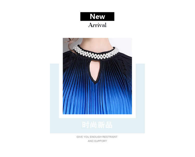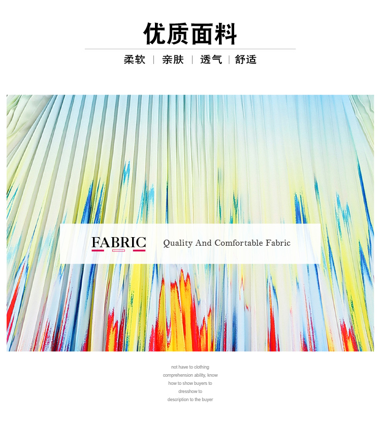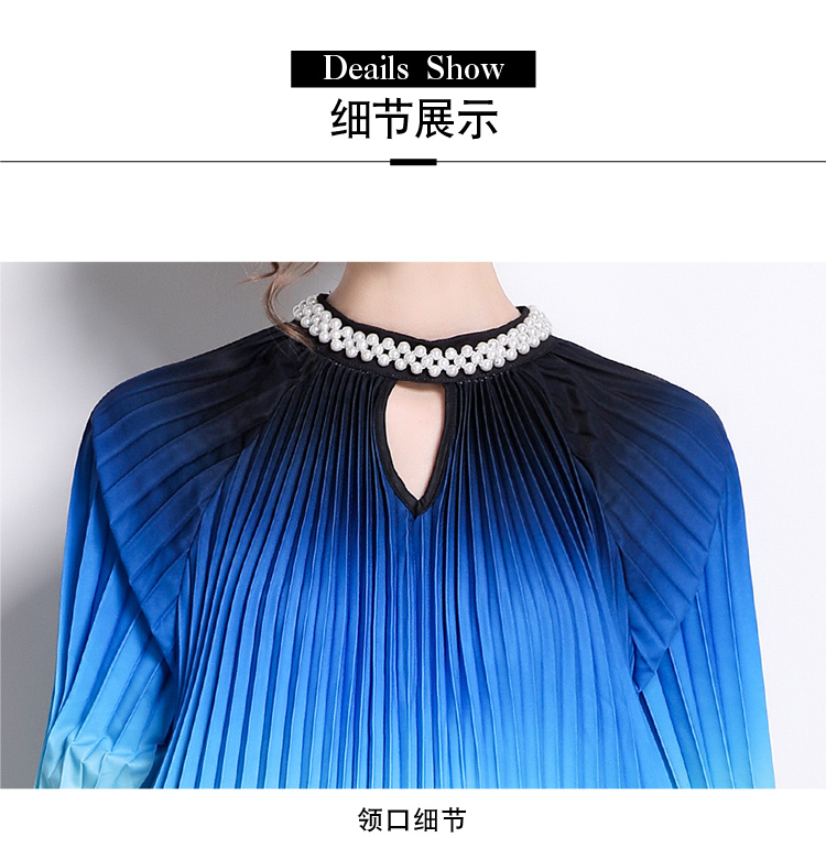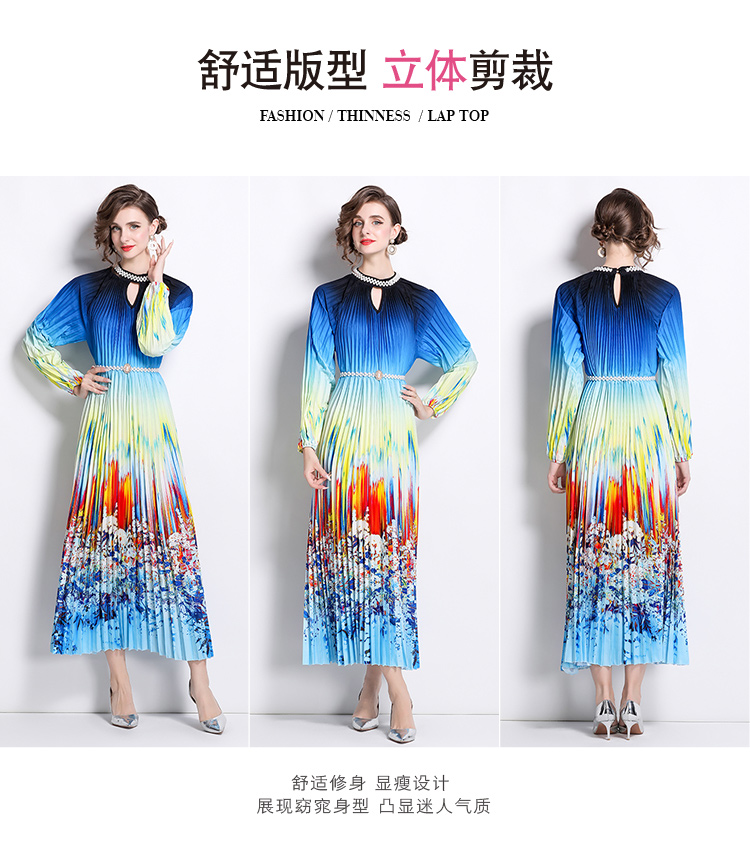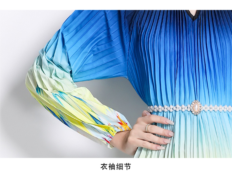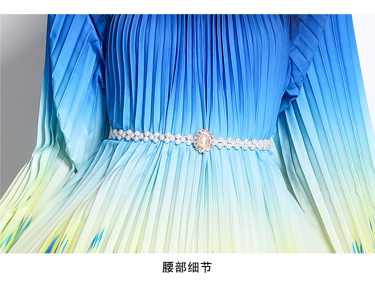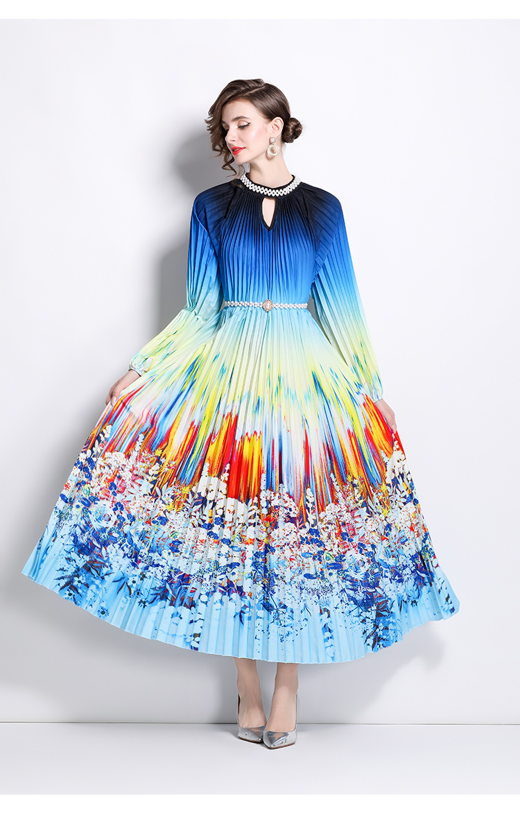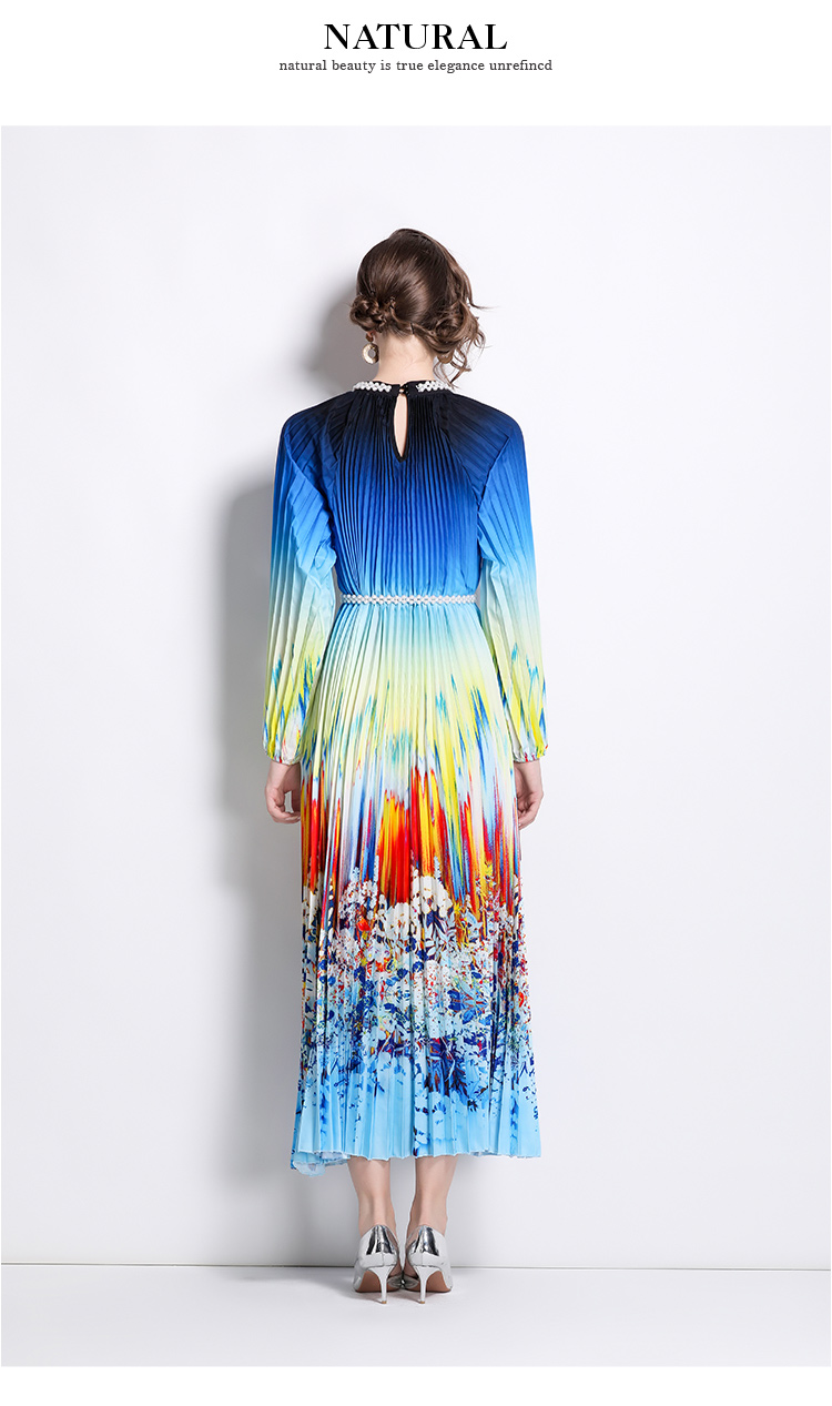 MY16261# 高端钉珠定位印花压褶珍珠扣百褶长裙女裝貨源服裝批發