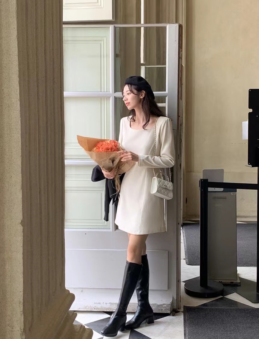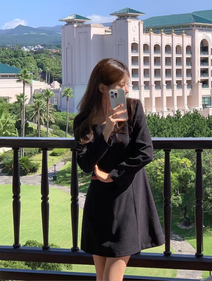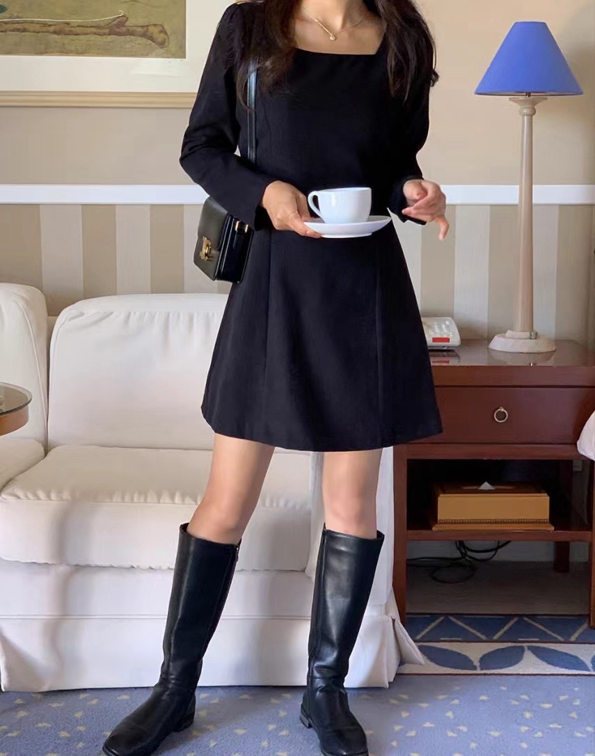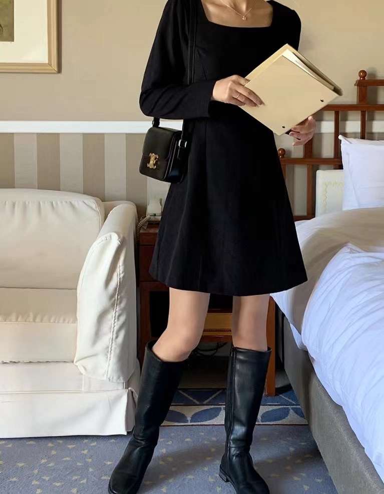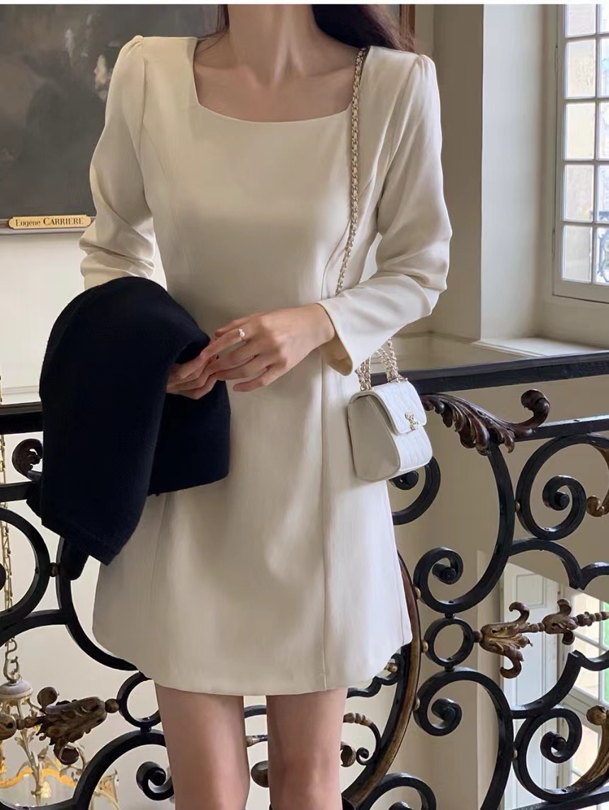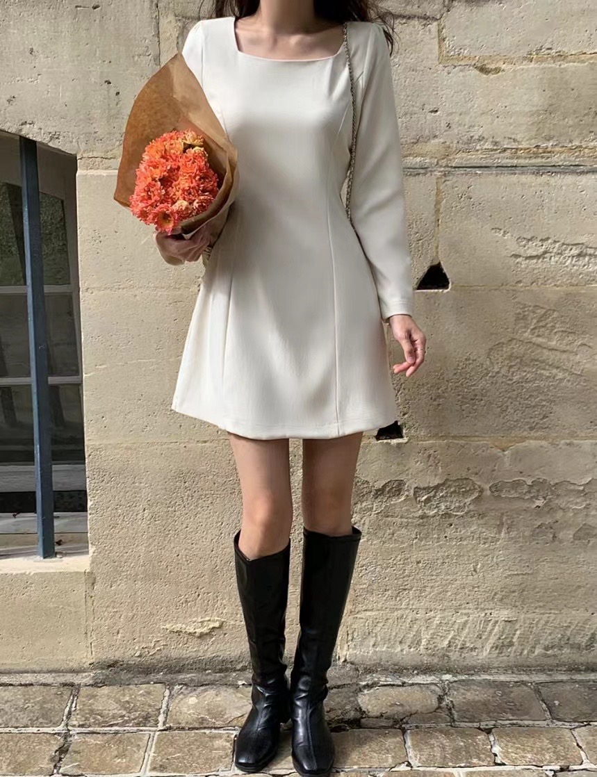 MY16273# 韩国东大门新款方领收腰纯色中长款连衣裙短裙女裝貨源服裝批發