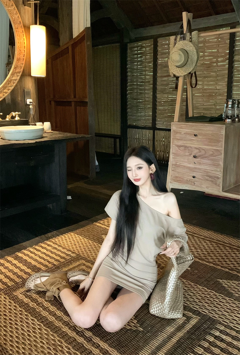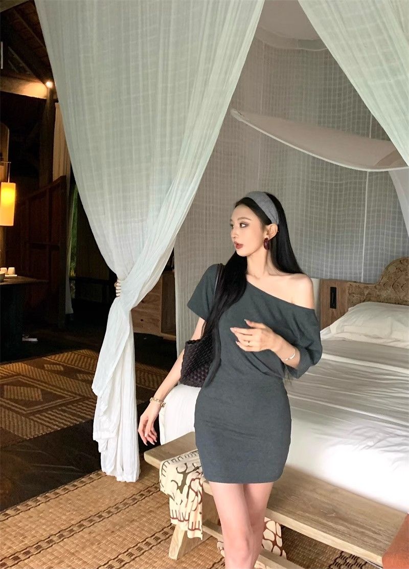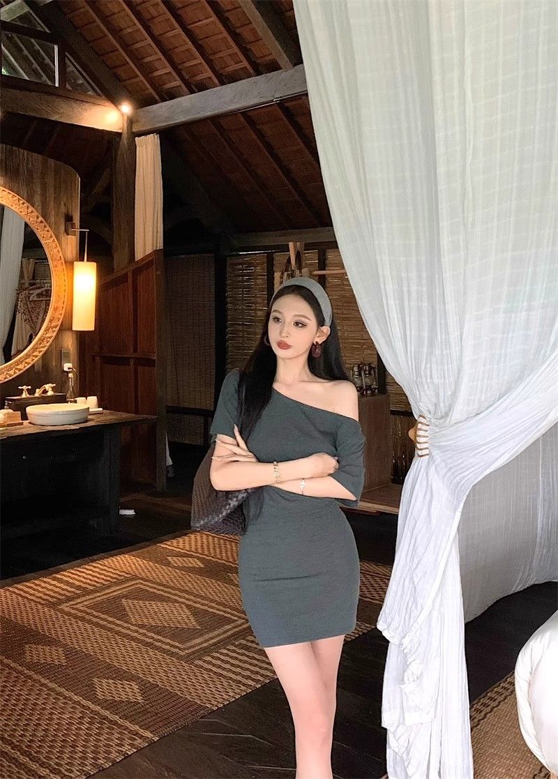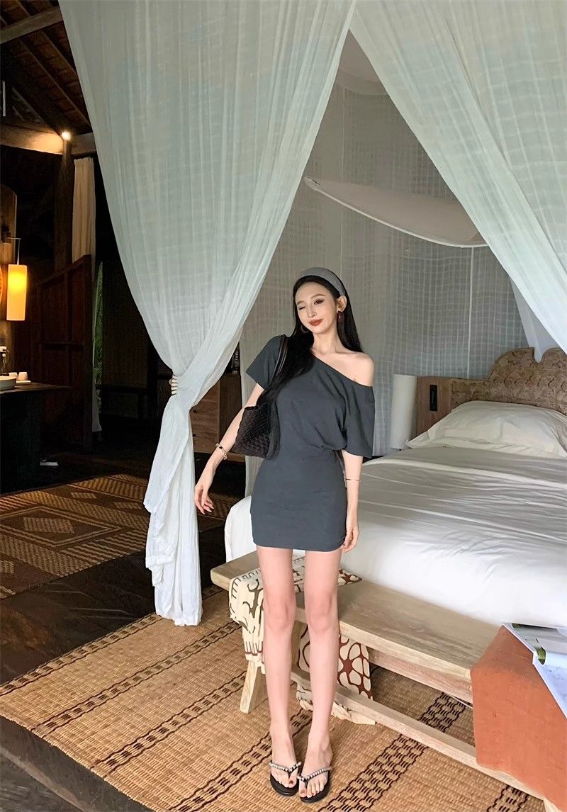 MY16463# 斜肩短袖连衣裙女复古时尚修身裙子收腰紧身包臀短裙女裝貨源服裝批發