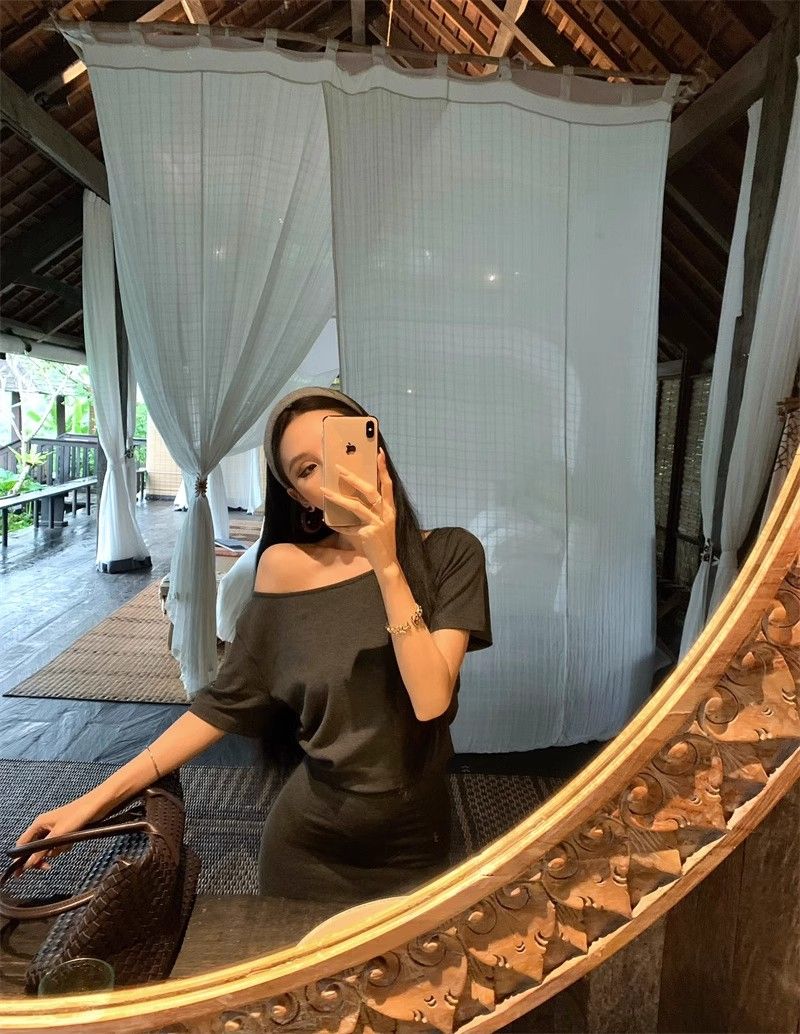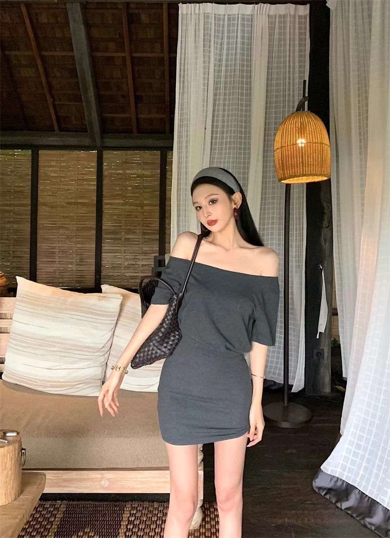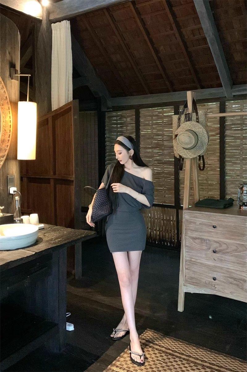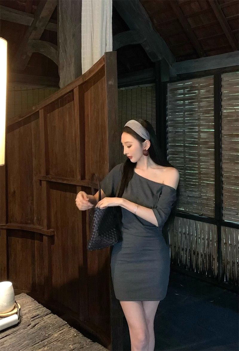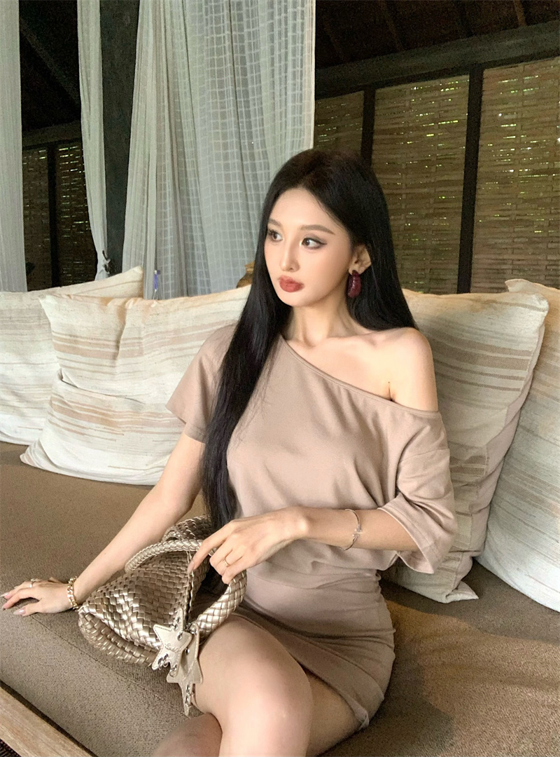MY16463# 斜肩短袖连衣裙女复古时尚修身裙子收腰紧身包臀短裙女裝貨源服裝批發