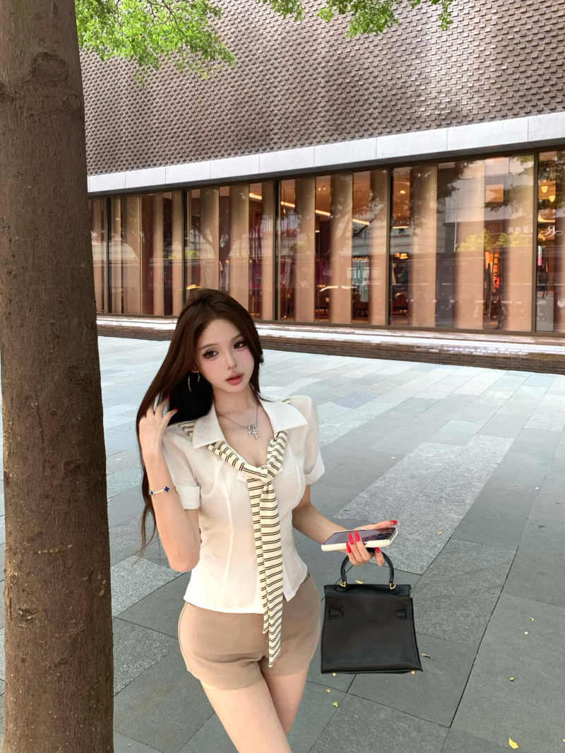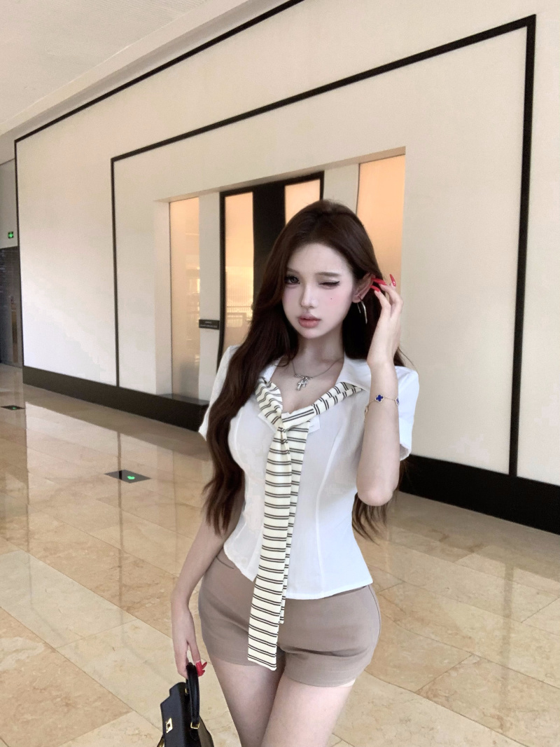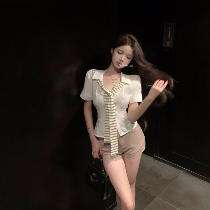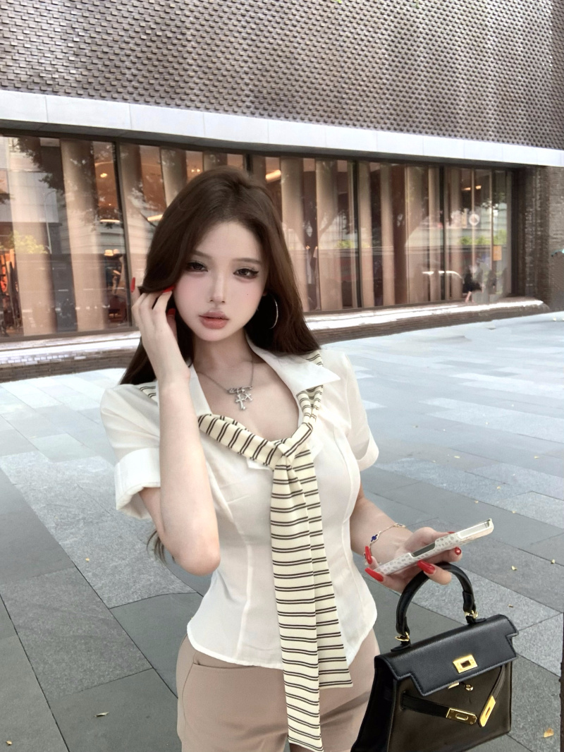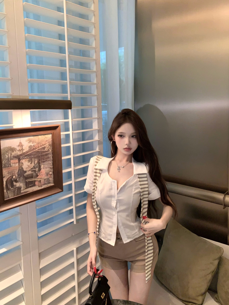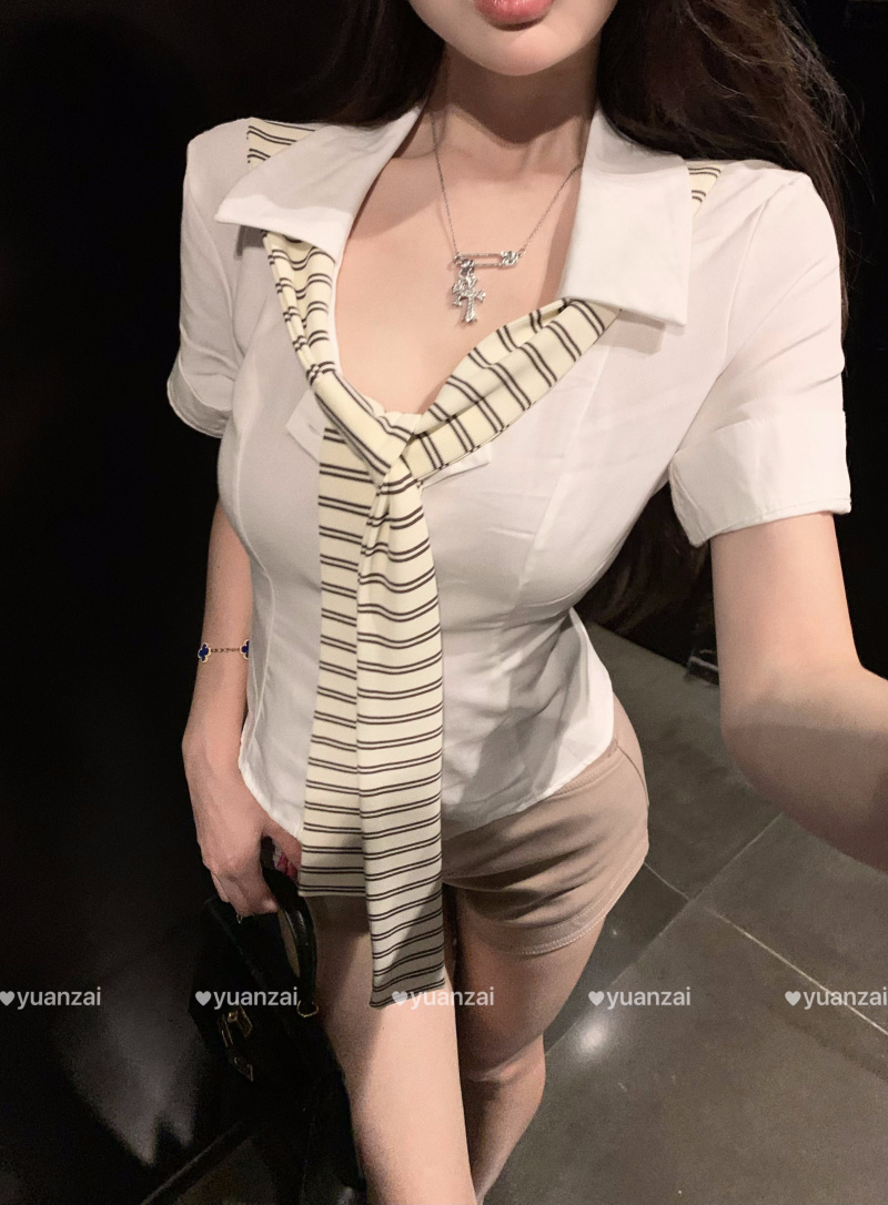 MY16502# 条纹披肩假两件拼接短袖衬衫女夏季修身收腰气质衬衣白色短款上衣女裝貨源服裝批發