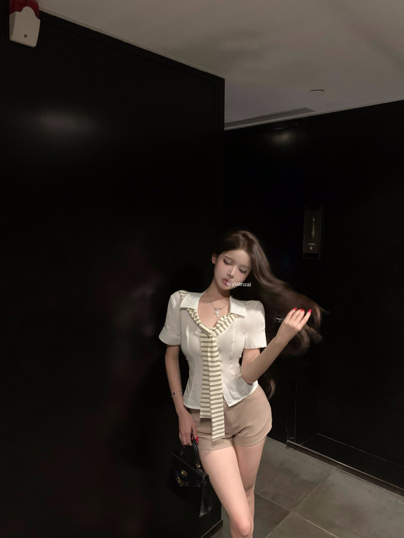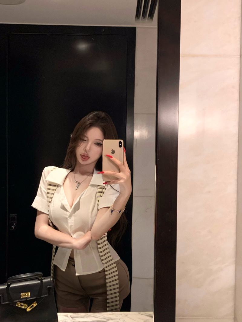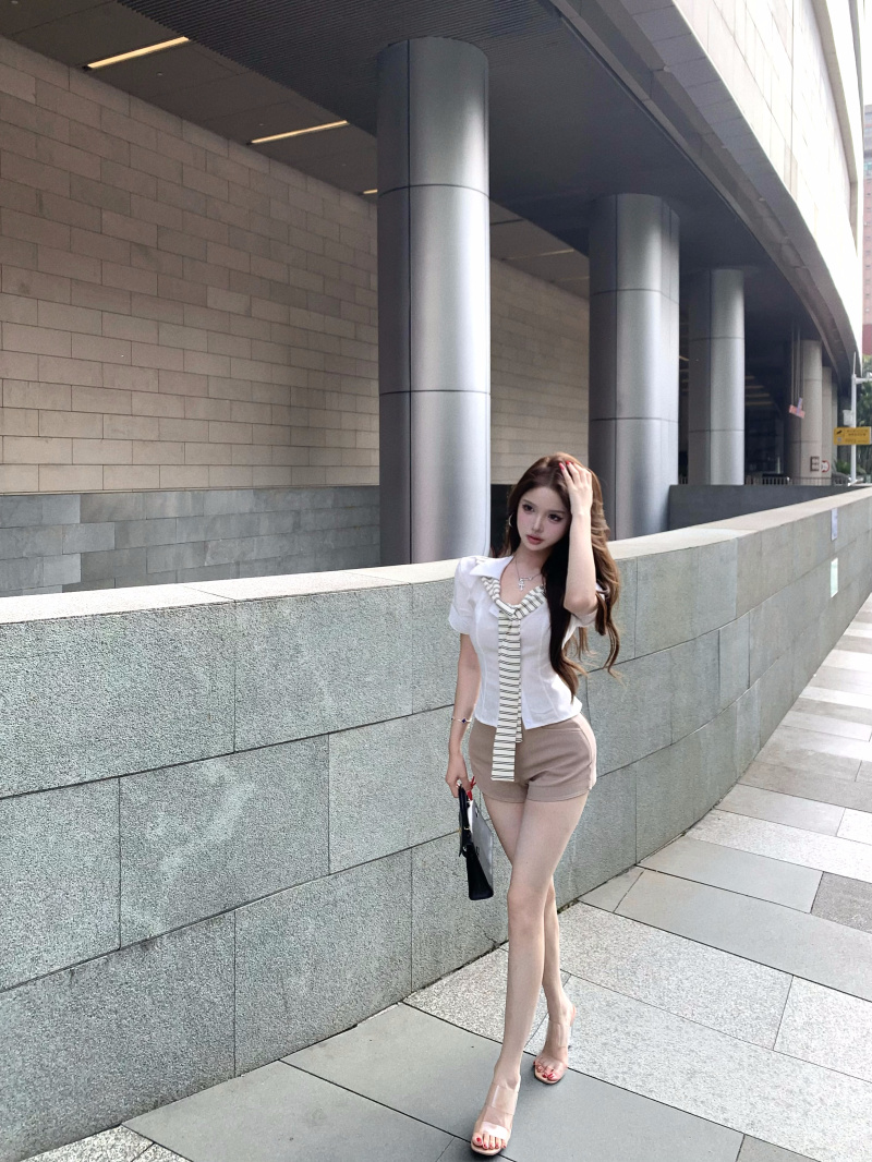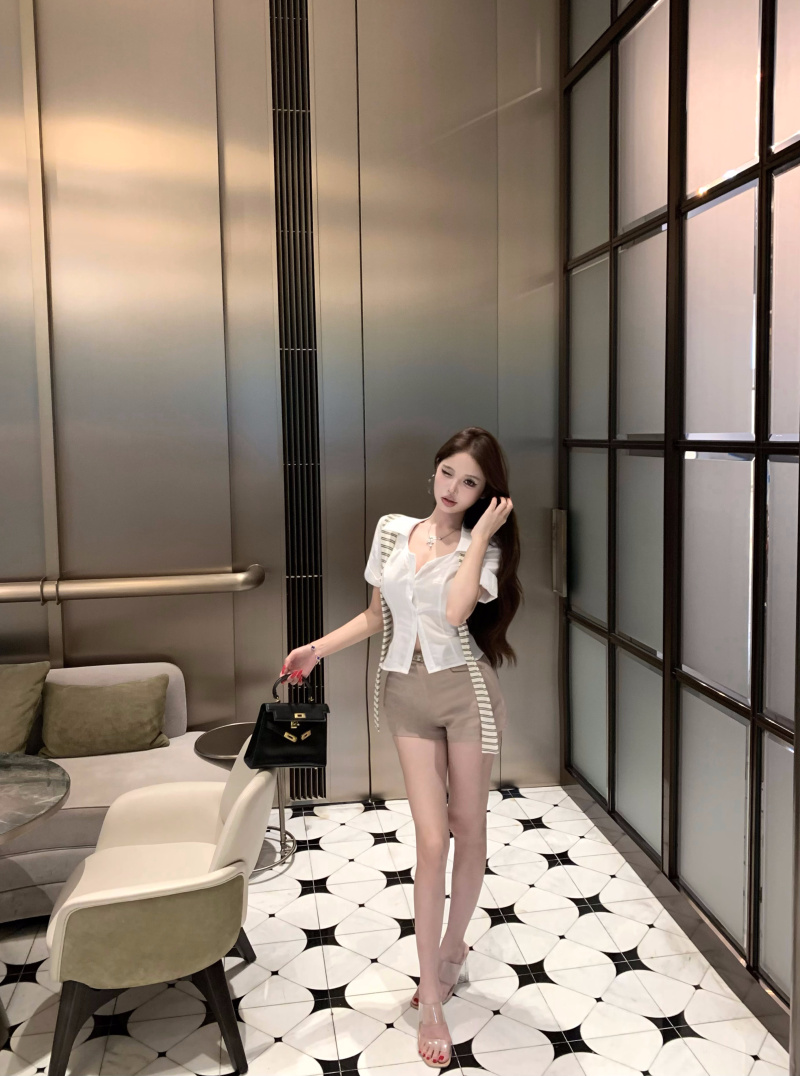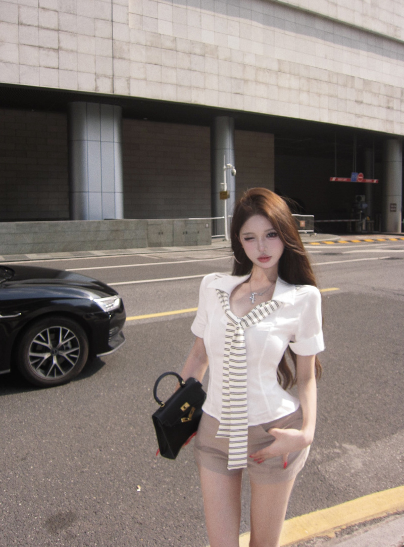 MY16502# 条纹披肩假两件拼接短袖衬衫女夏季修身收腰气质衬衣白色短款上衣女裝貨源服裝批發