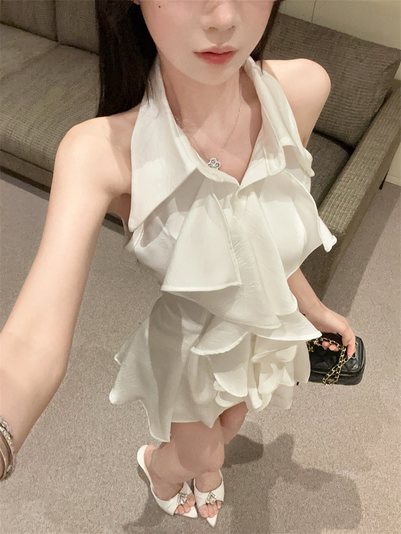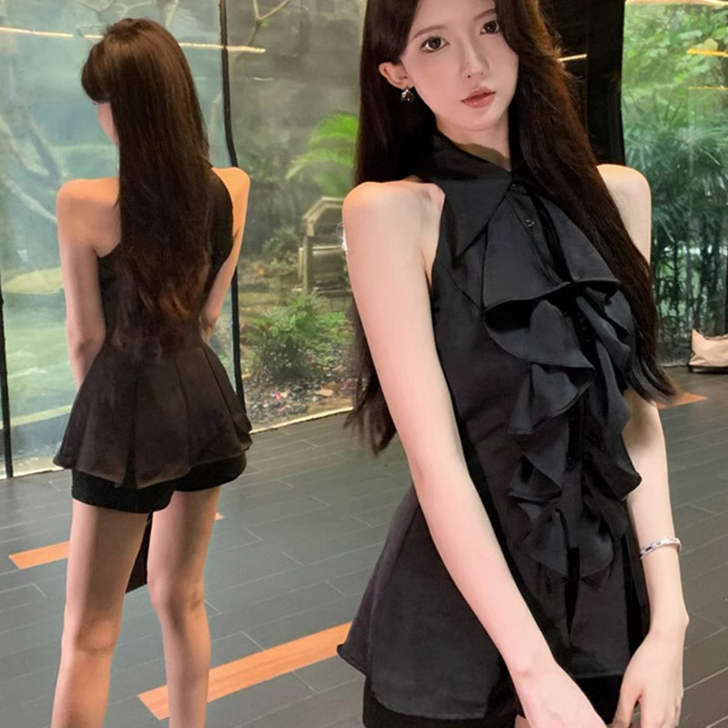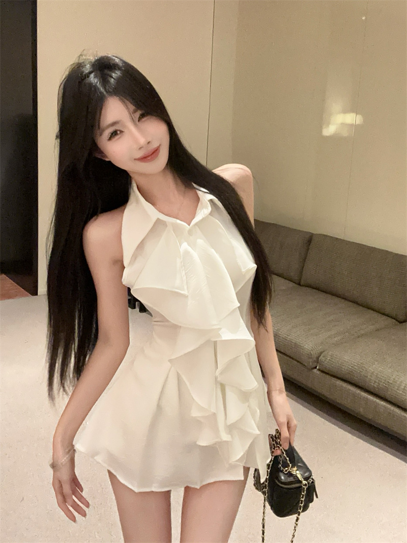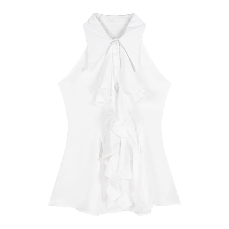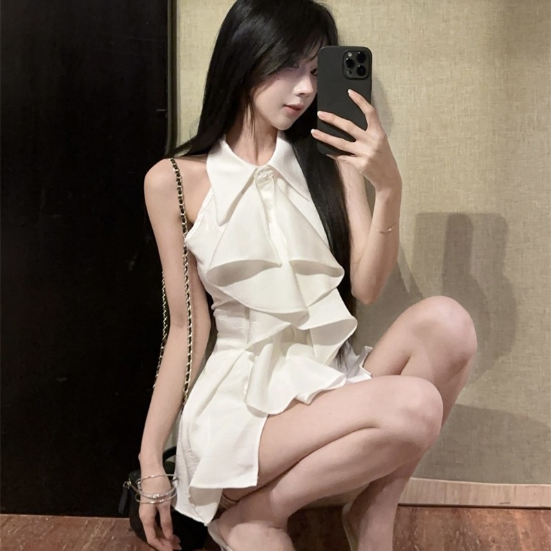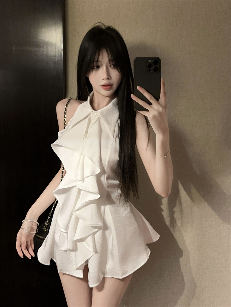 MY16505# 荷叶边无袖衬衫上衣女夏法式气质中长款收腰修身衬衣女裝貨源服裝批發