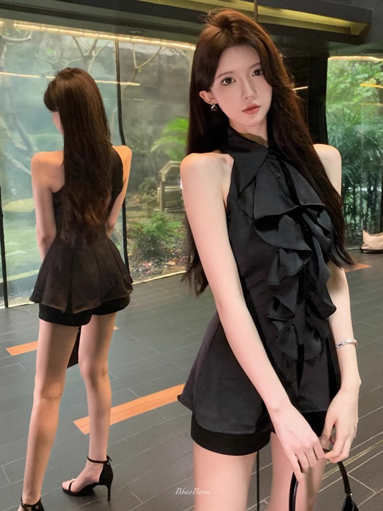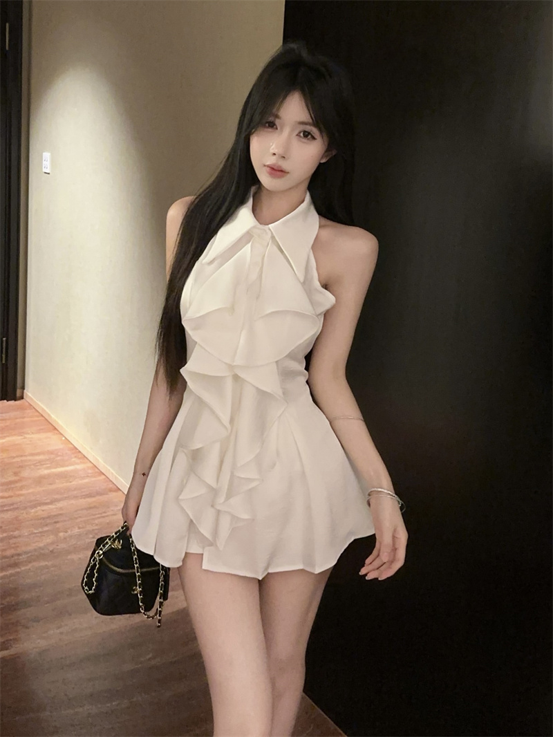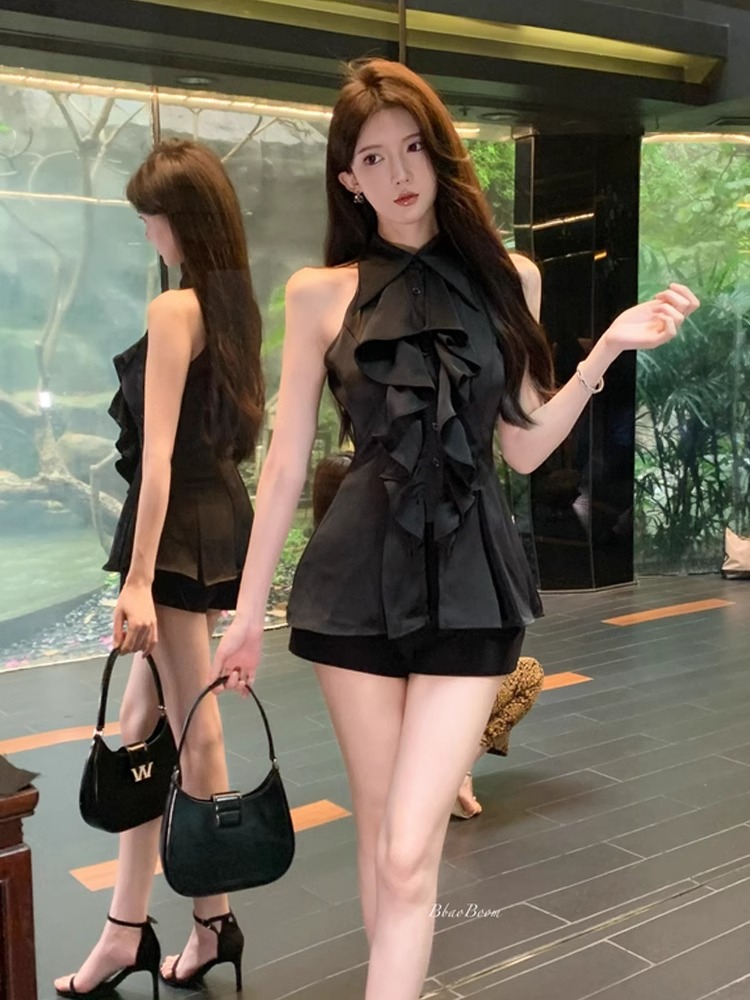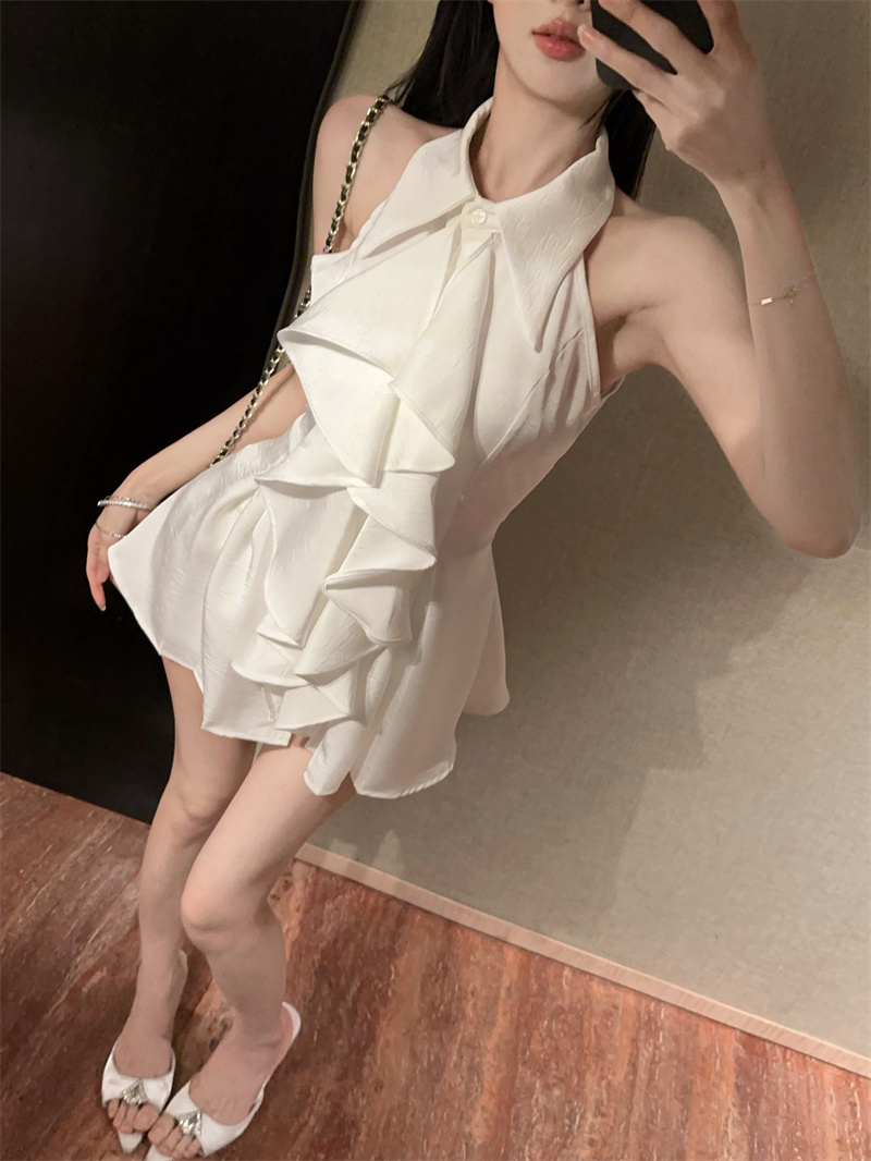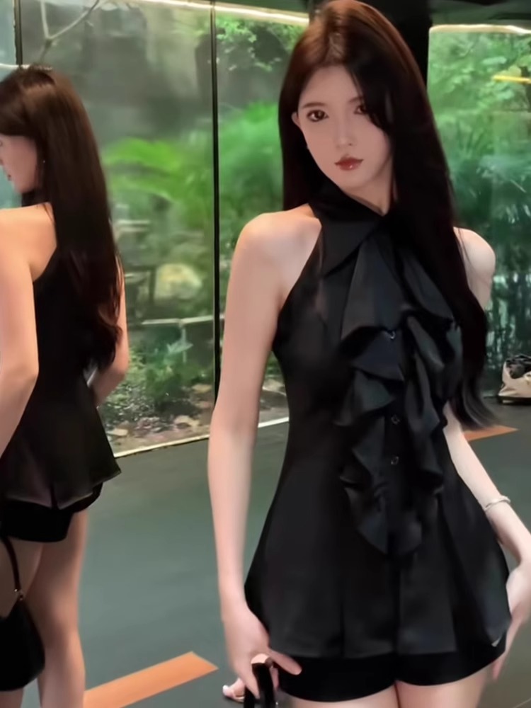MY16505# 荷叶边无袖衬衫上衣女夏法式气质中长款收腰修身衬衣女裝貨源服裝批發