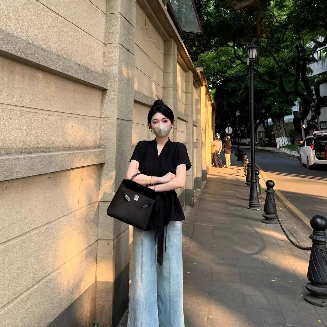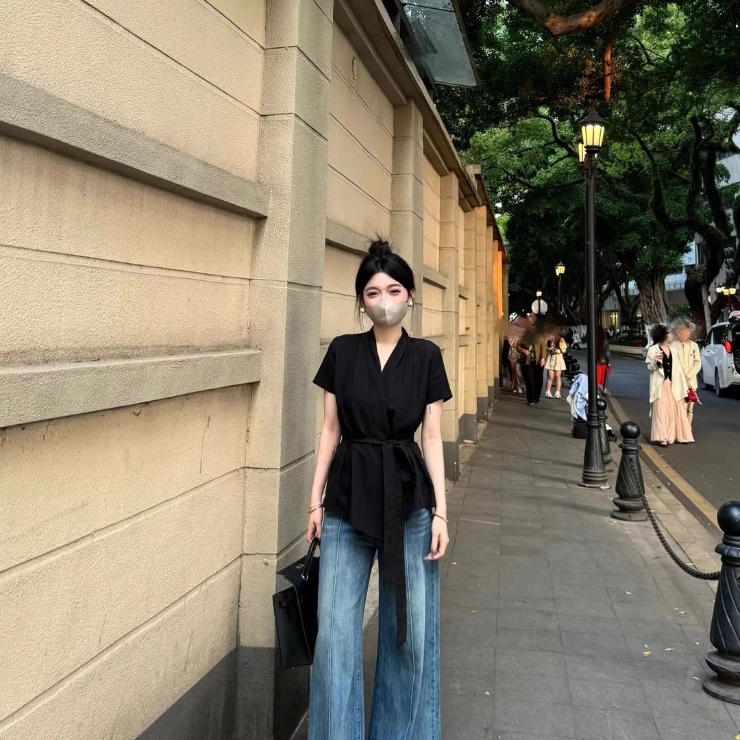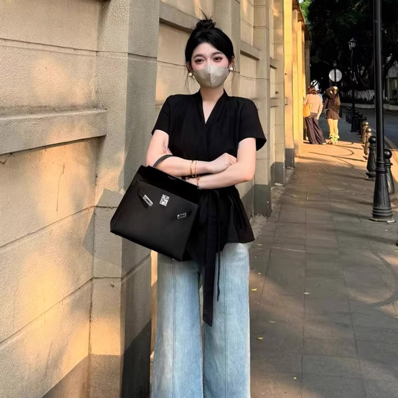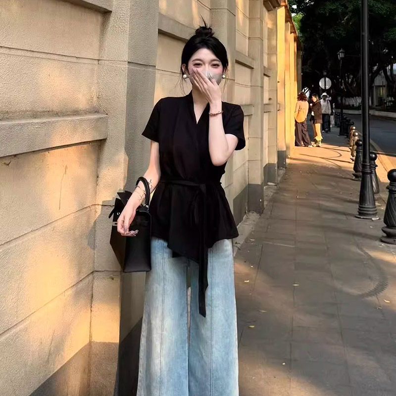 MY16507# 小众设计感绑带收腰显瘦V领短袖衬衫不规则洋气上衣女夏女裝貨源服裝批發