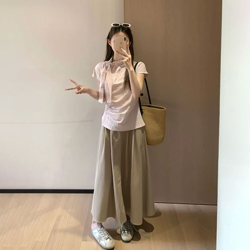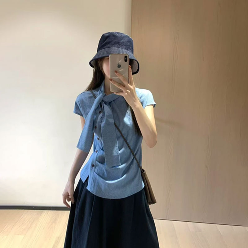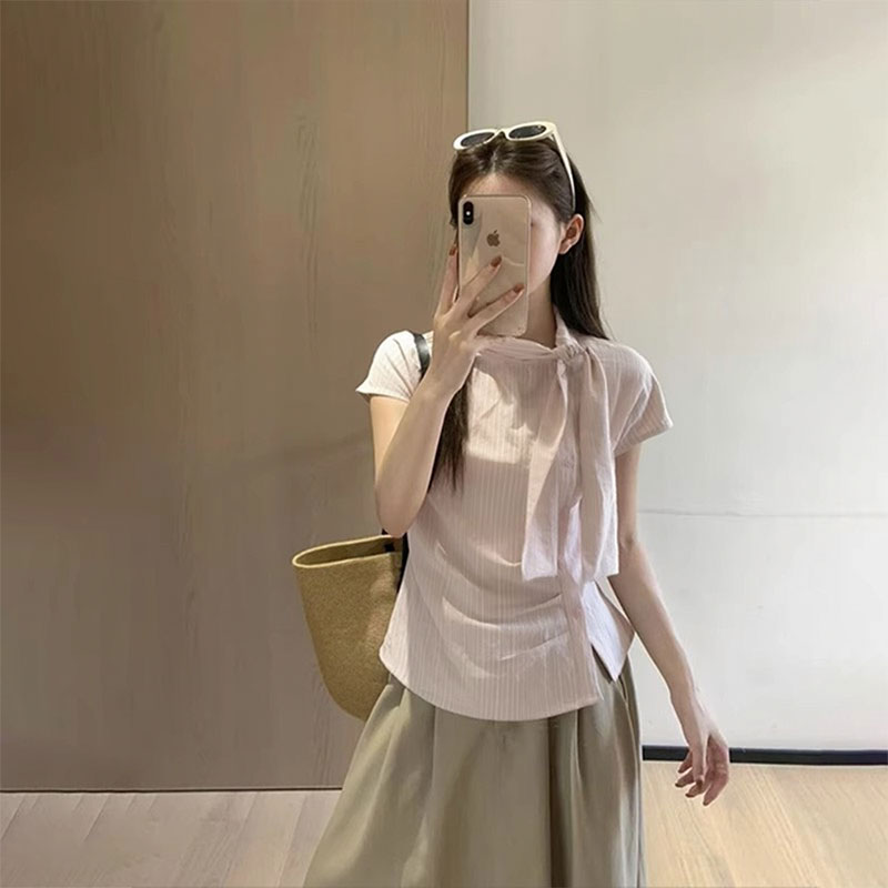 MY16508# 品质韩系条纹飘带短袖衬衫女夏季设计感不规则褶皱上衣女裝貨源服裝批發