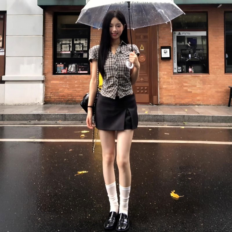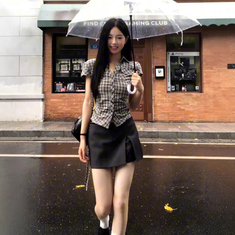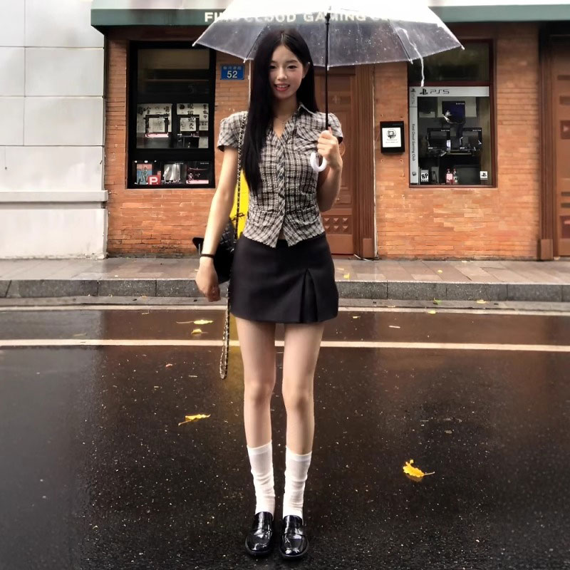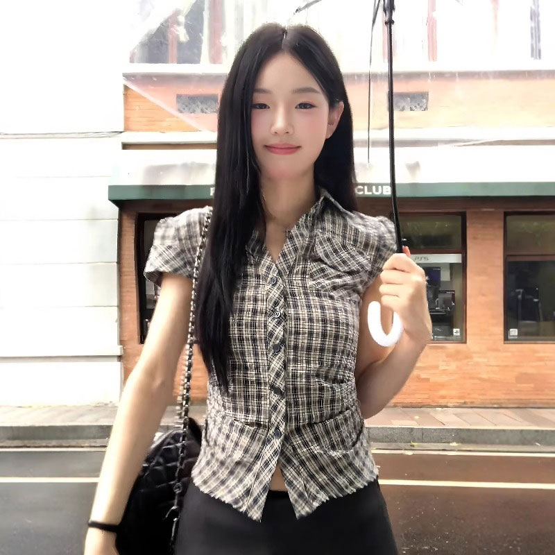 MY16509# 纯棉面料学院风格子短袖衬衫夏季设计感收腰显瘦上衣女裝貨源服裝批發