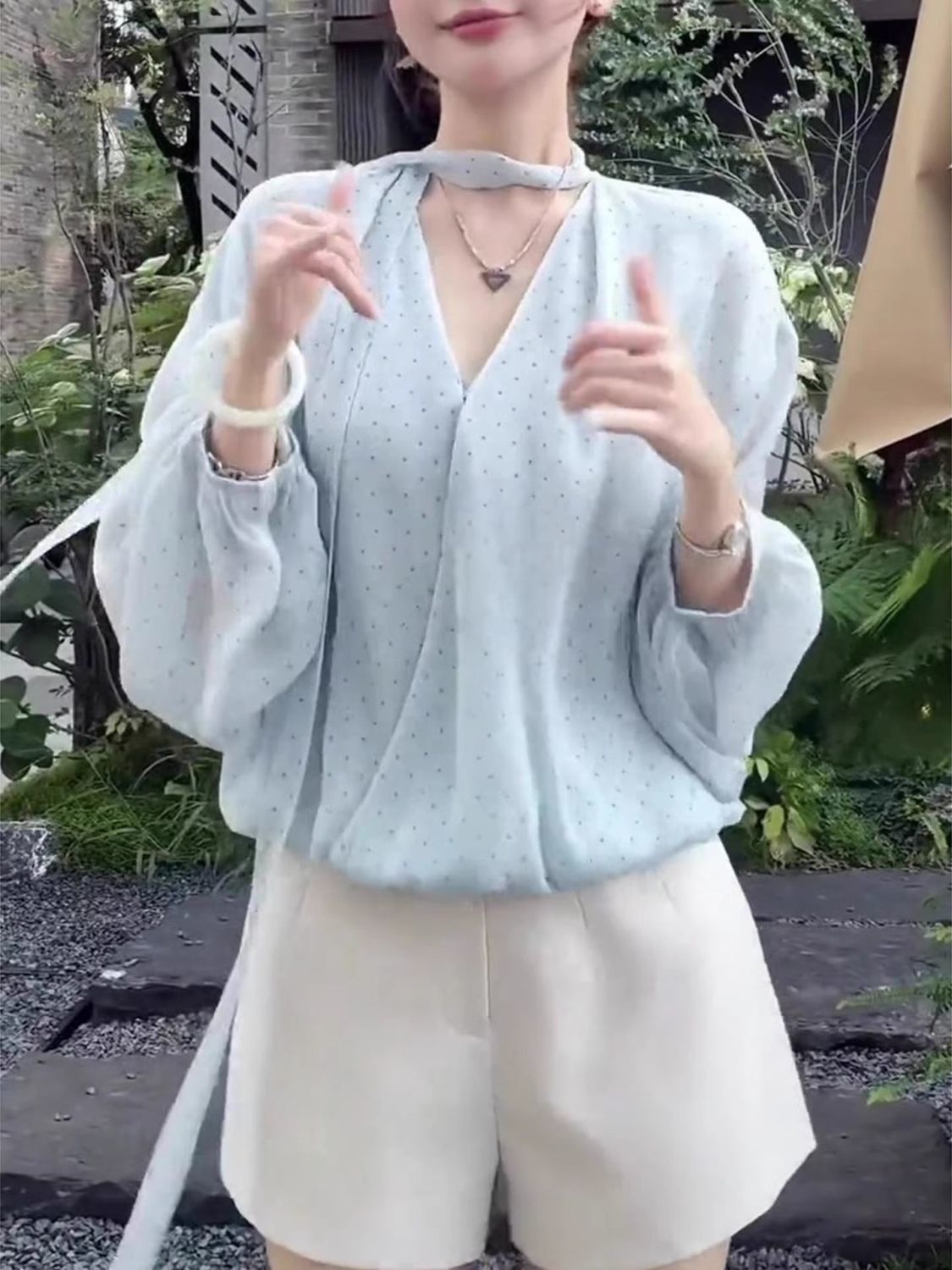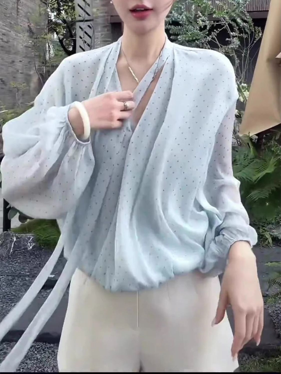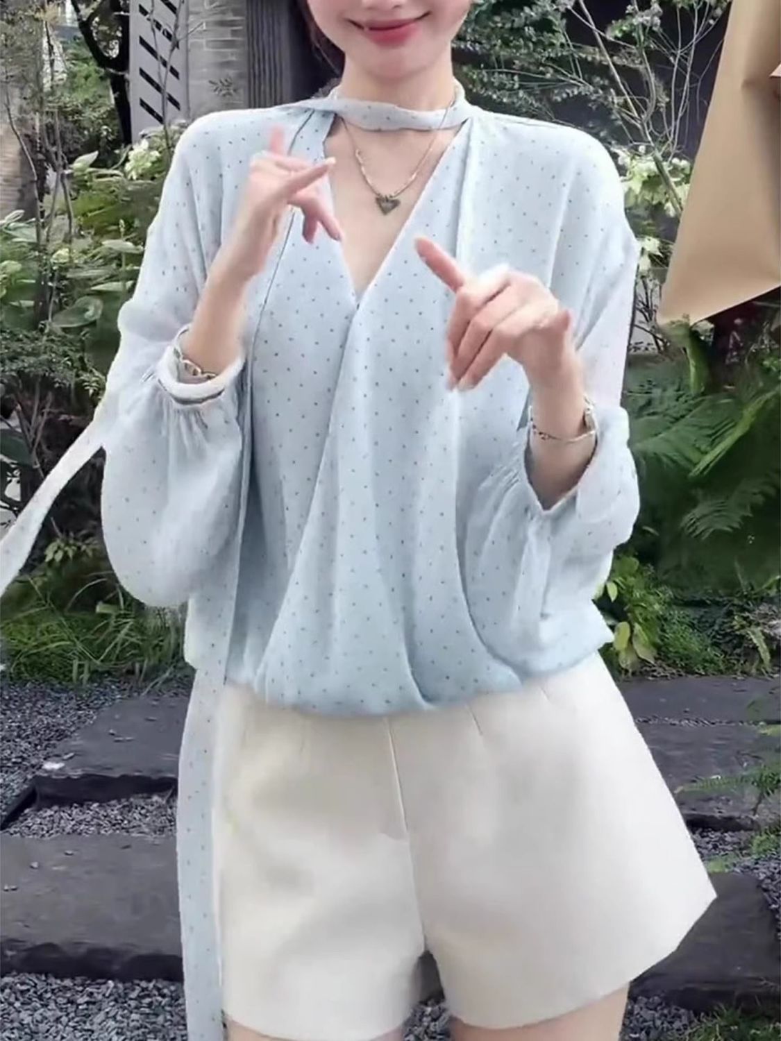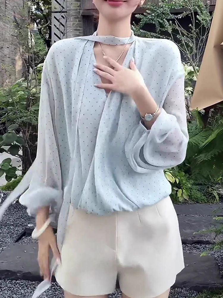 MY16516# 韩系新款温柔水蓝长袖轻奢显瘦夏季波点气质时尚设计感上衣女女裝貨源服裝批發