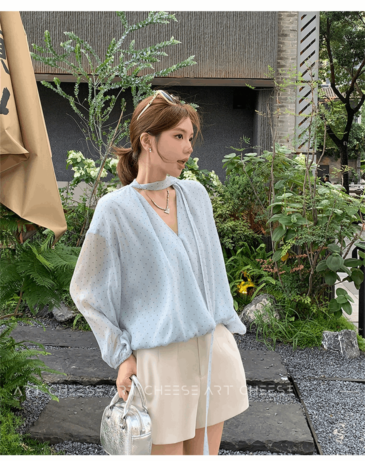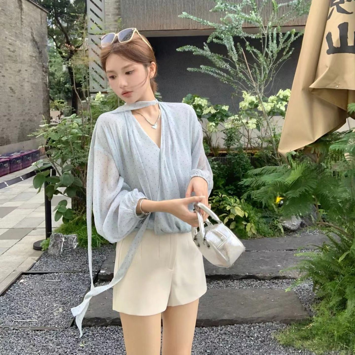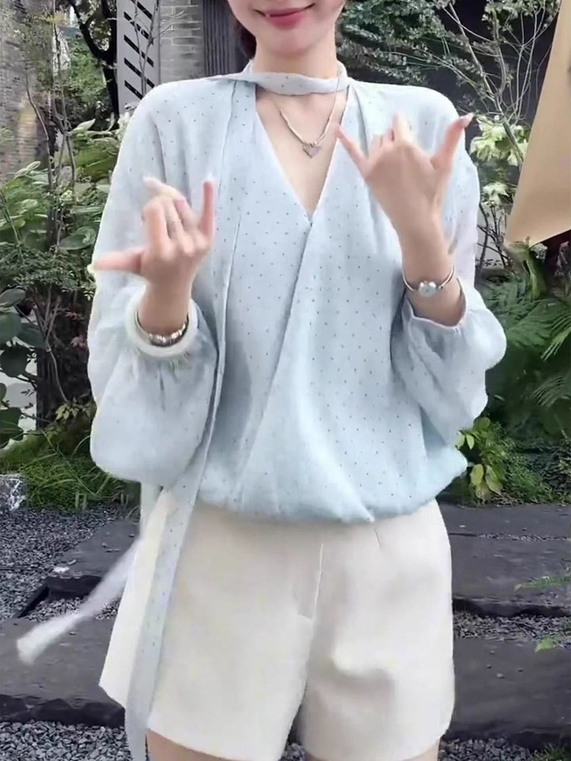 MY16516# 韩系新款温柔水蓝长袖轻奢显瘦夏季波点气质时尚设计感上衣女女裝貨源服裝批發
