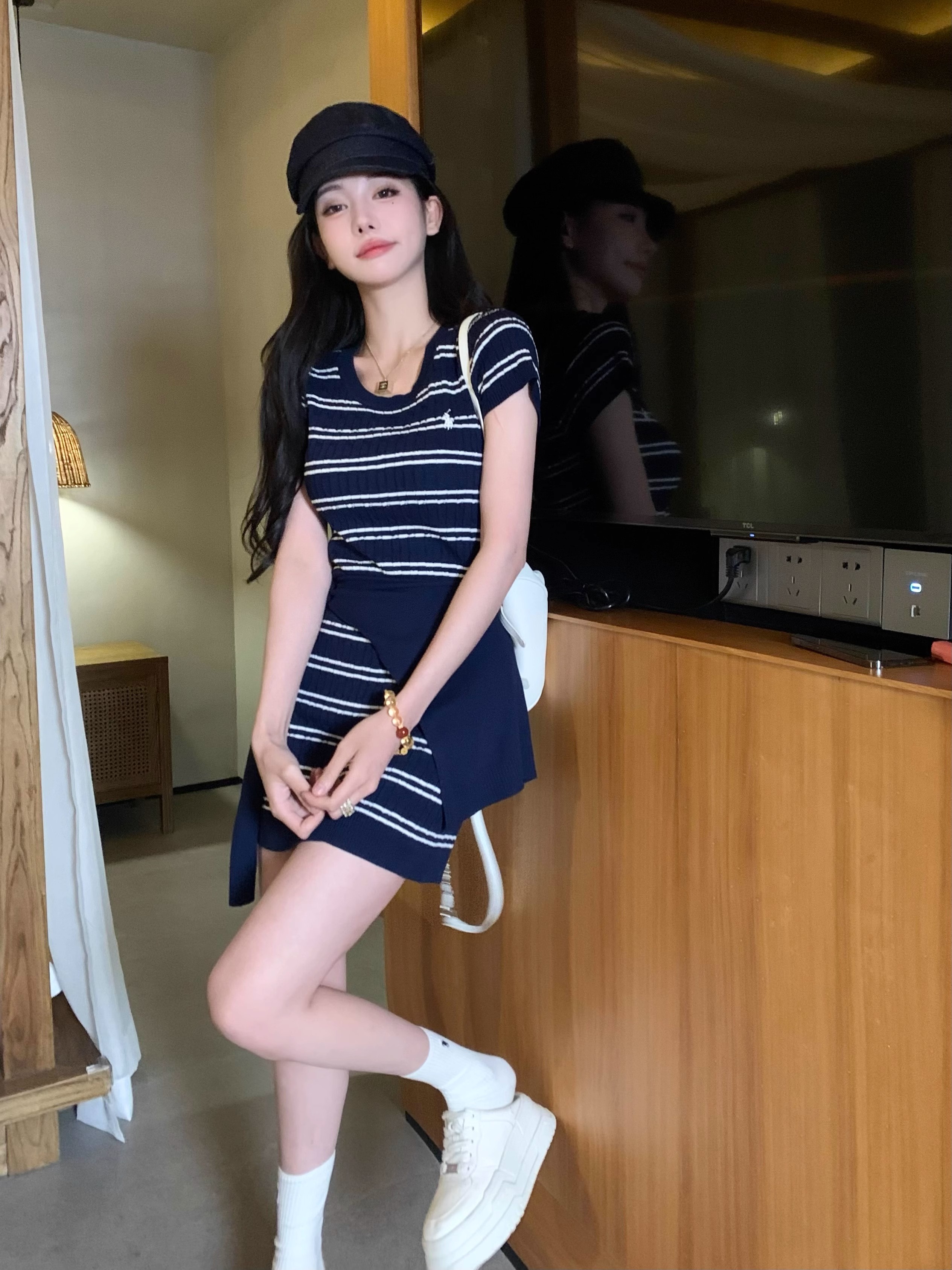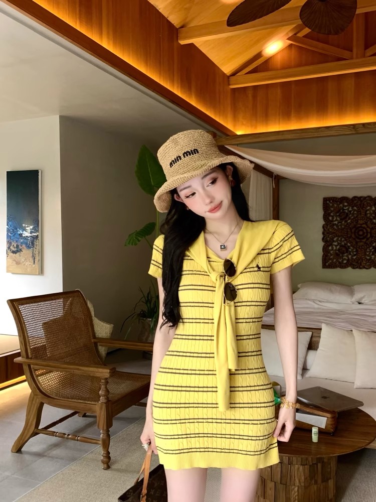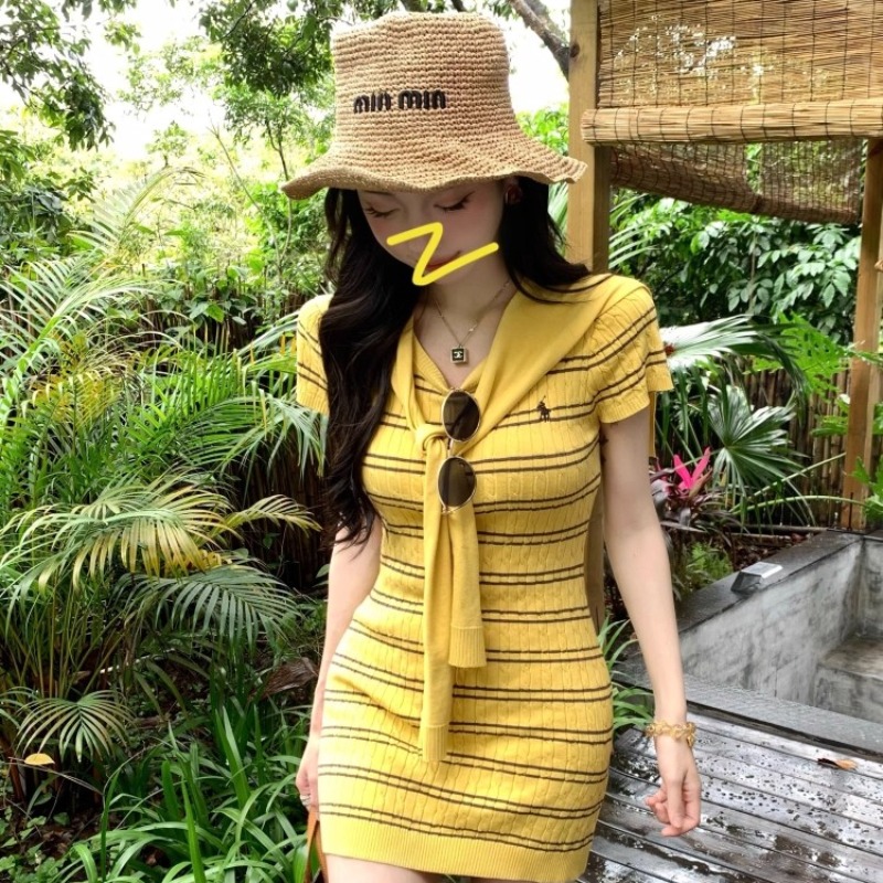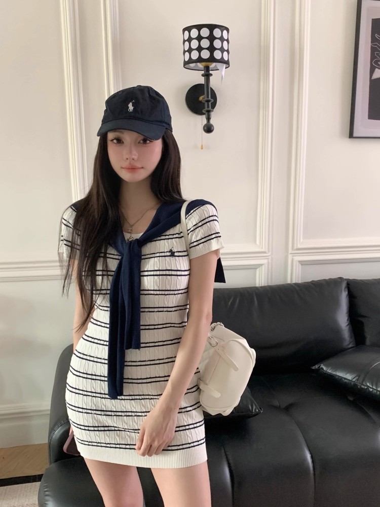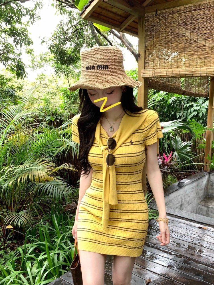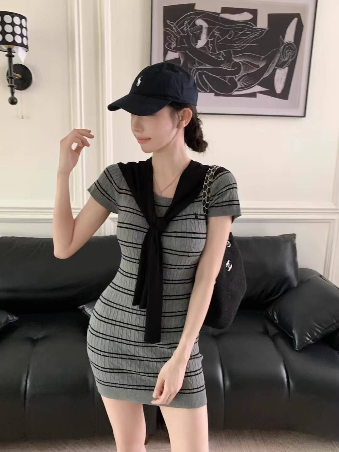 MY16522# 纯欲性感针织短袖连衣裙新款修身显瘦条纹包臀短裙披肩套装女裝貨源服裝批發