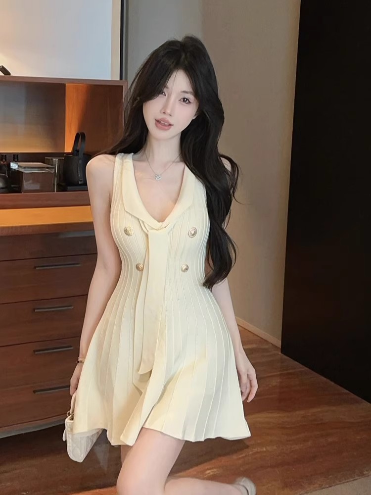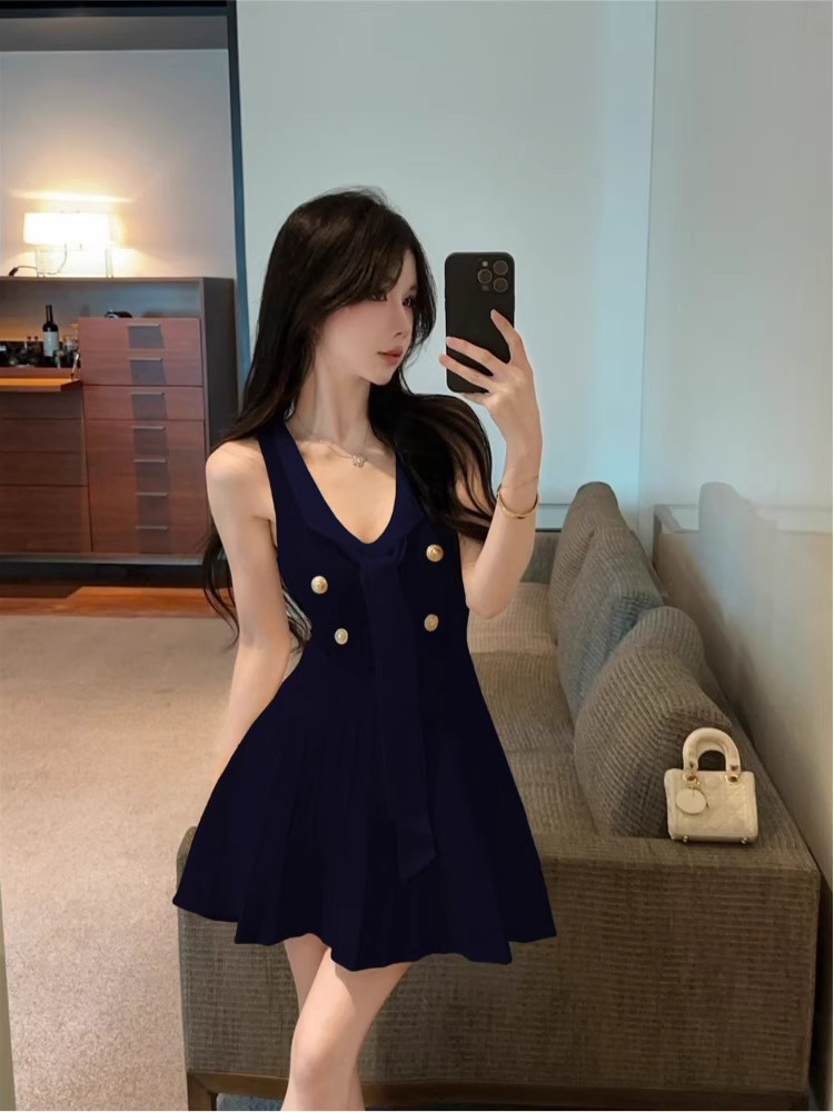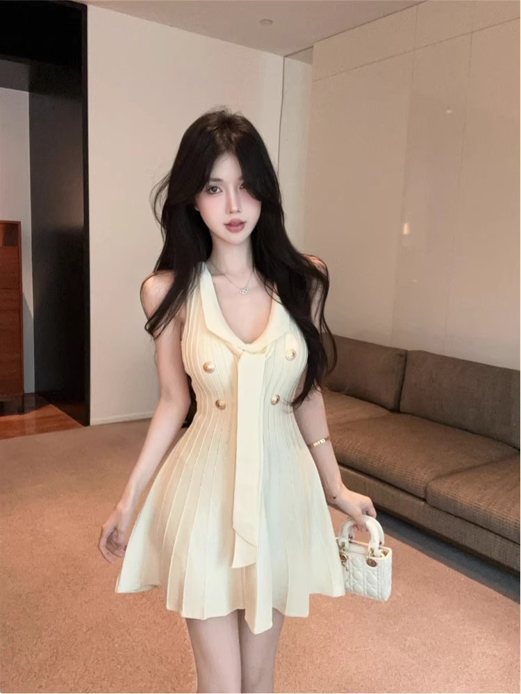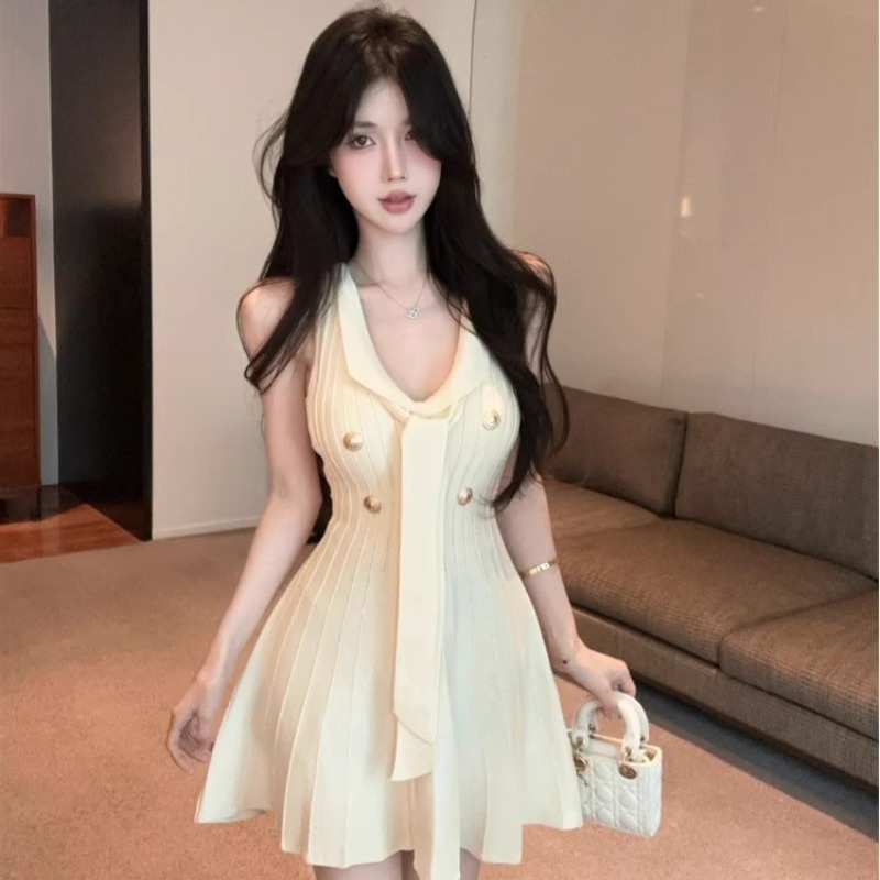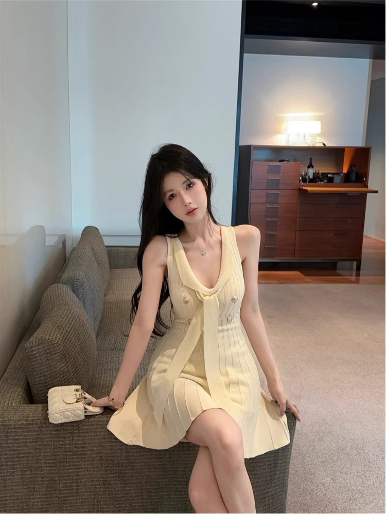MY16523# 新款法式名媛小香风气质V领绑带金扣显瘦收腰针织连衣裙女装女裝貨源服裝批發