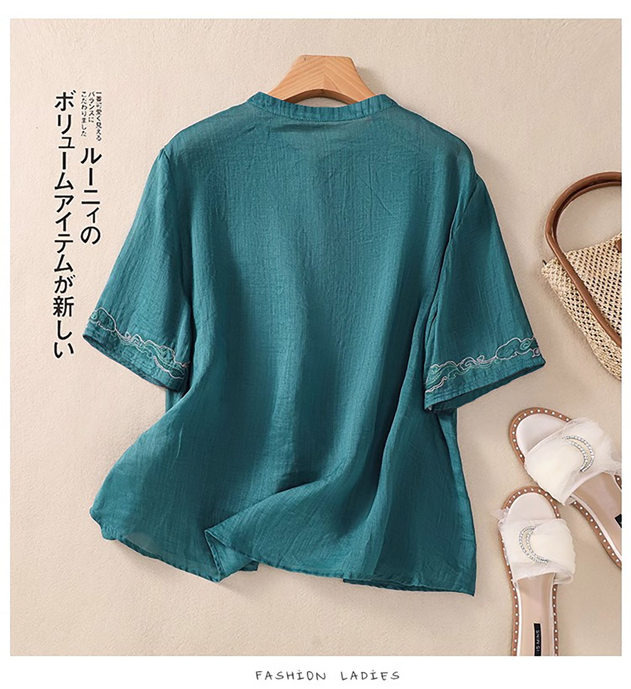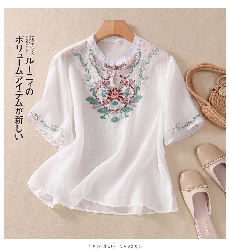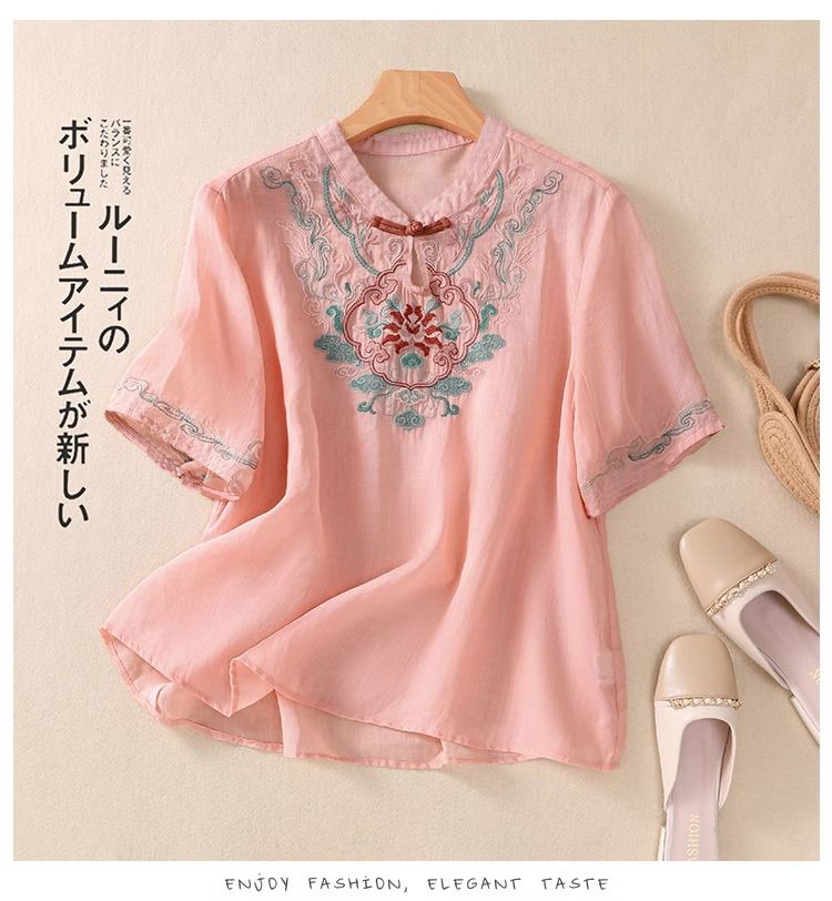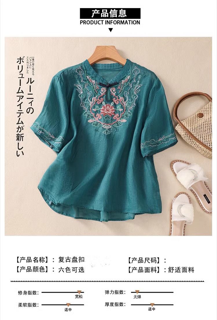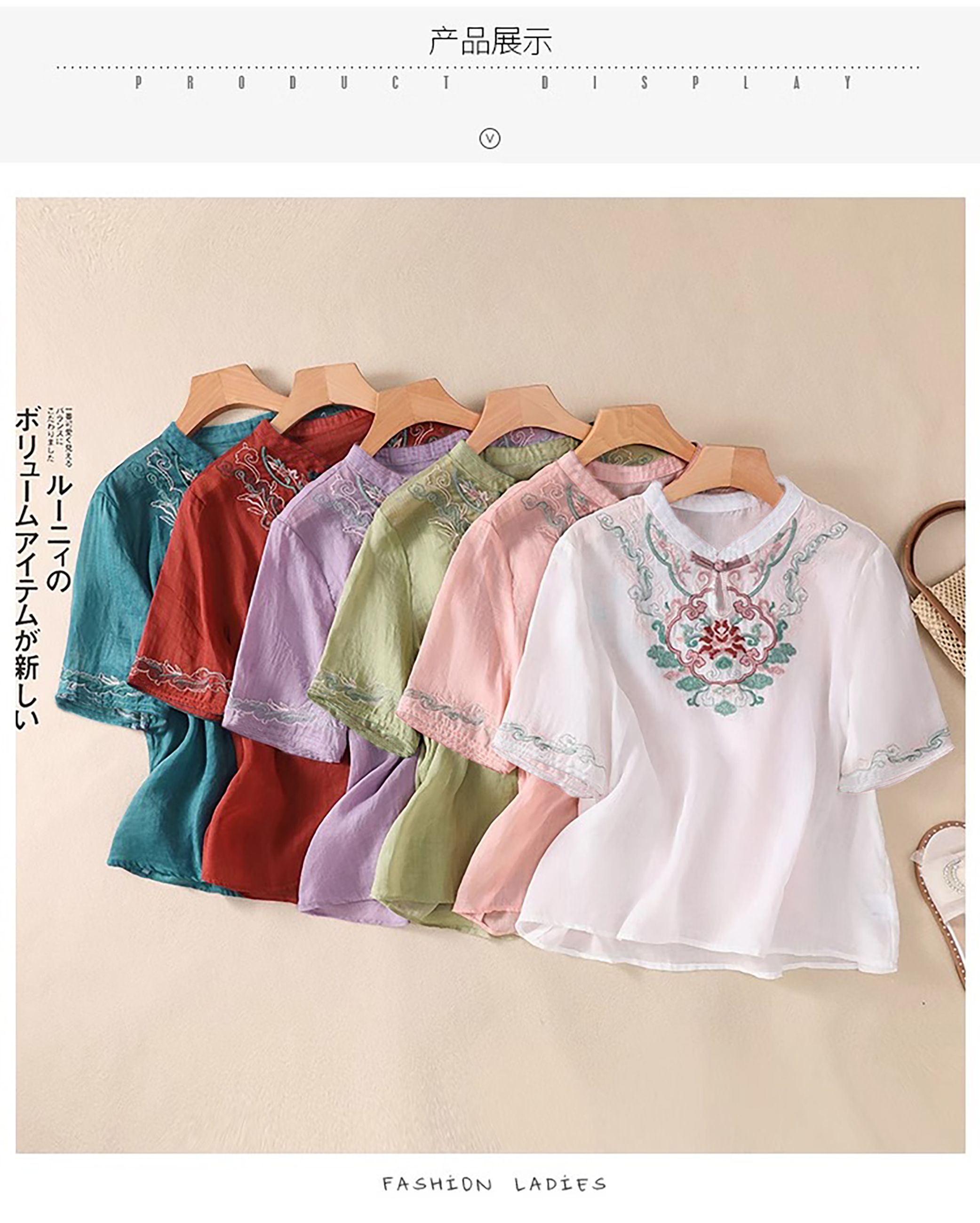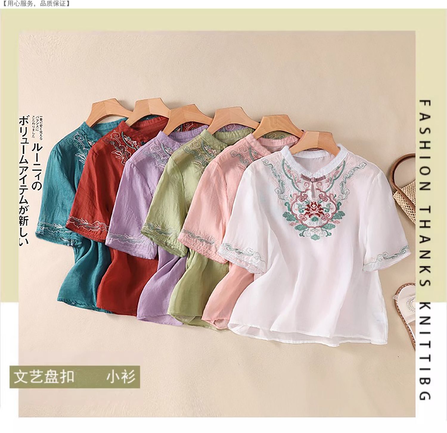 MY16567# 夏季国风复古刺绣盘扣旗袍领棉麻小衫中式宽松短袖套头上衣女女裝貨源服裝批發