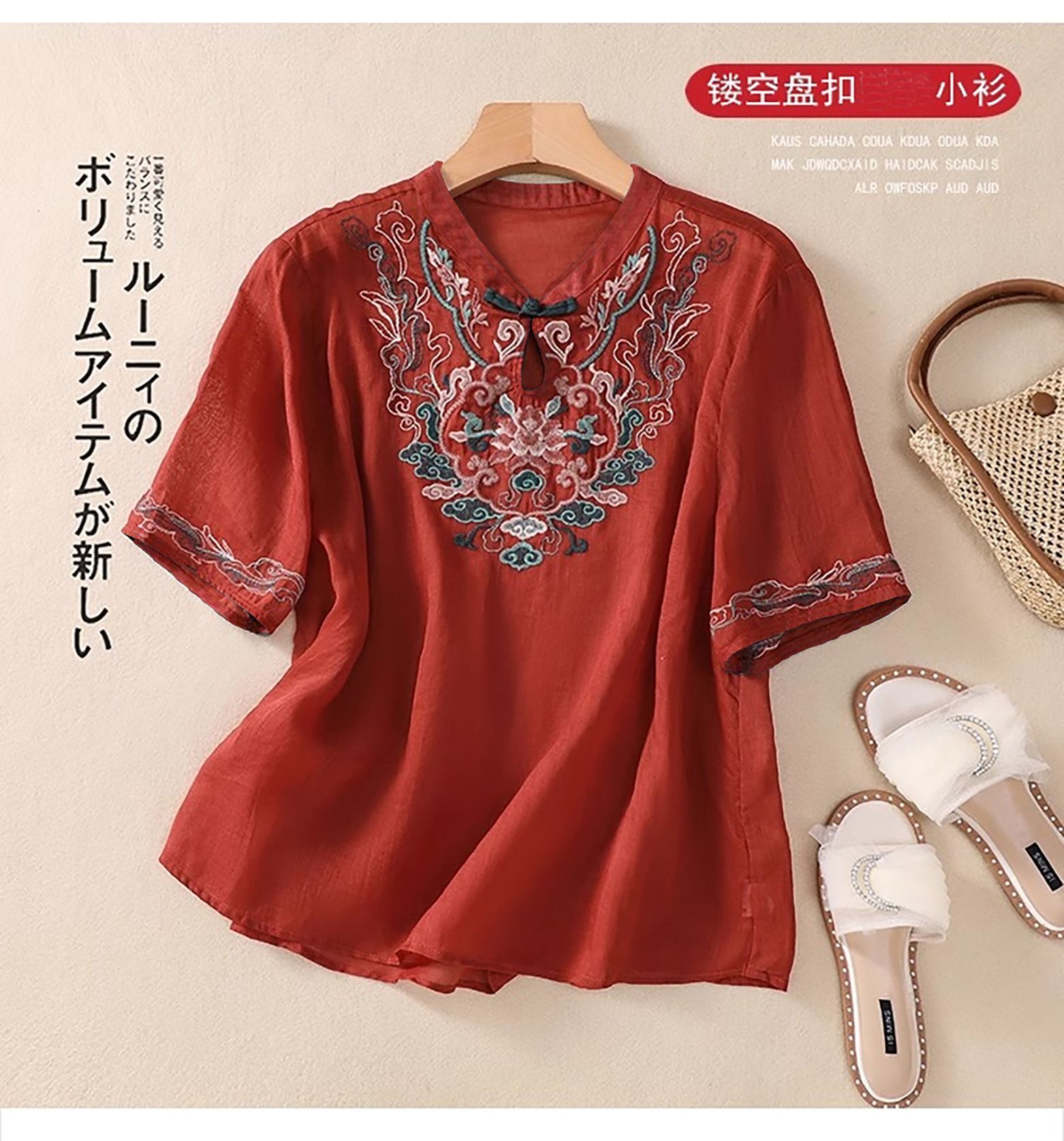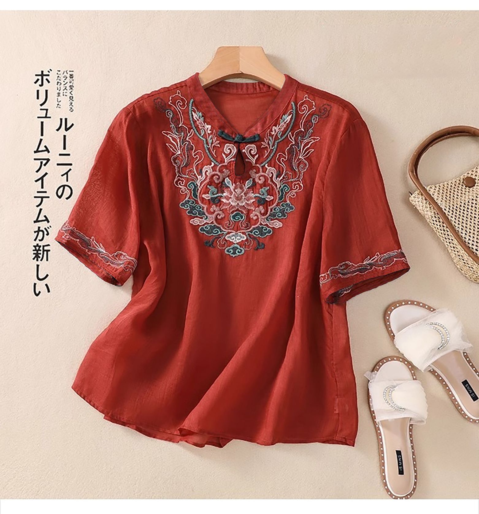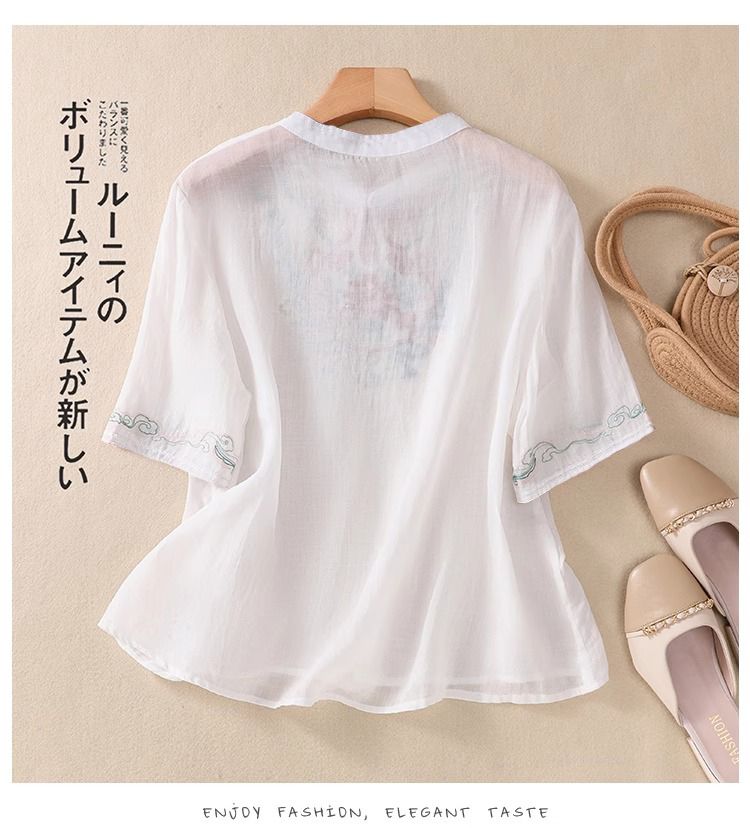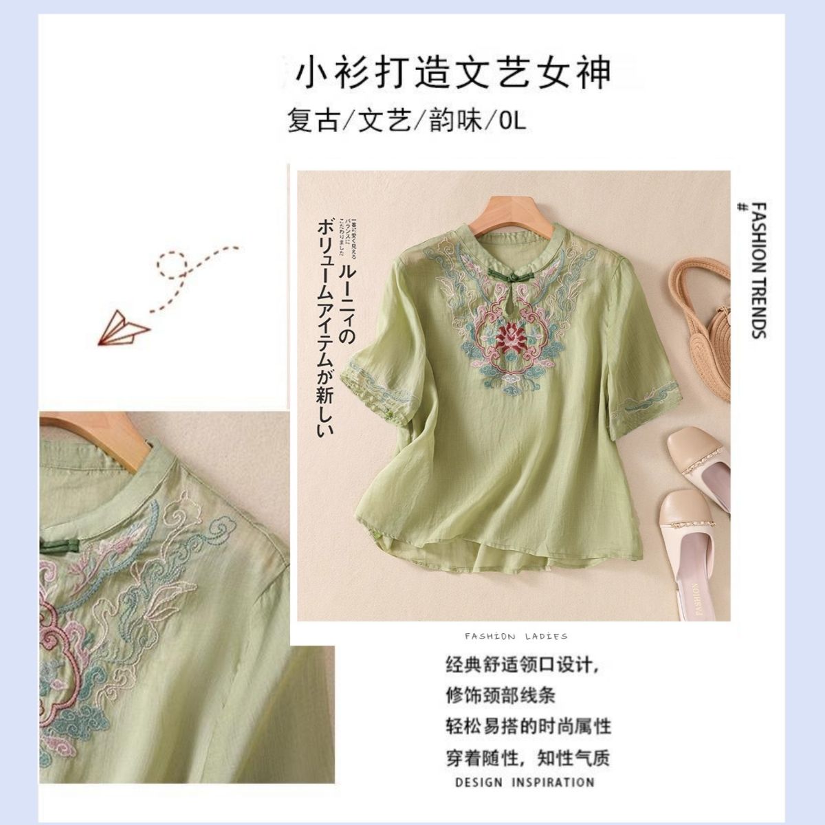 MY16567# 夏季国风复古刺绣盘扣旗袍领棉麻小衫中式宽松短袖套头上衣女女裝貨源服裝批發