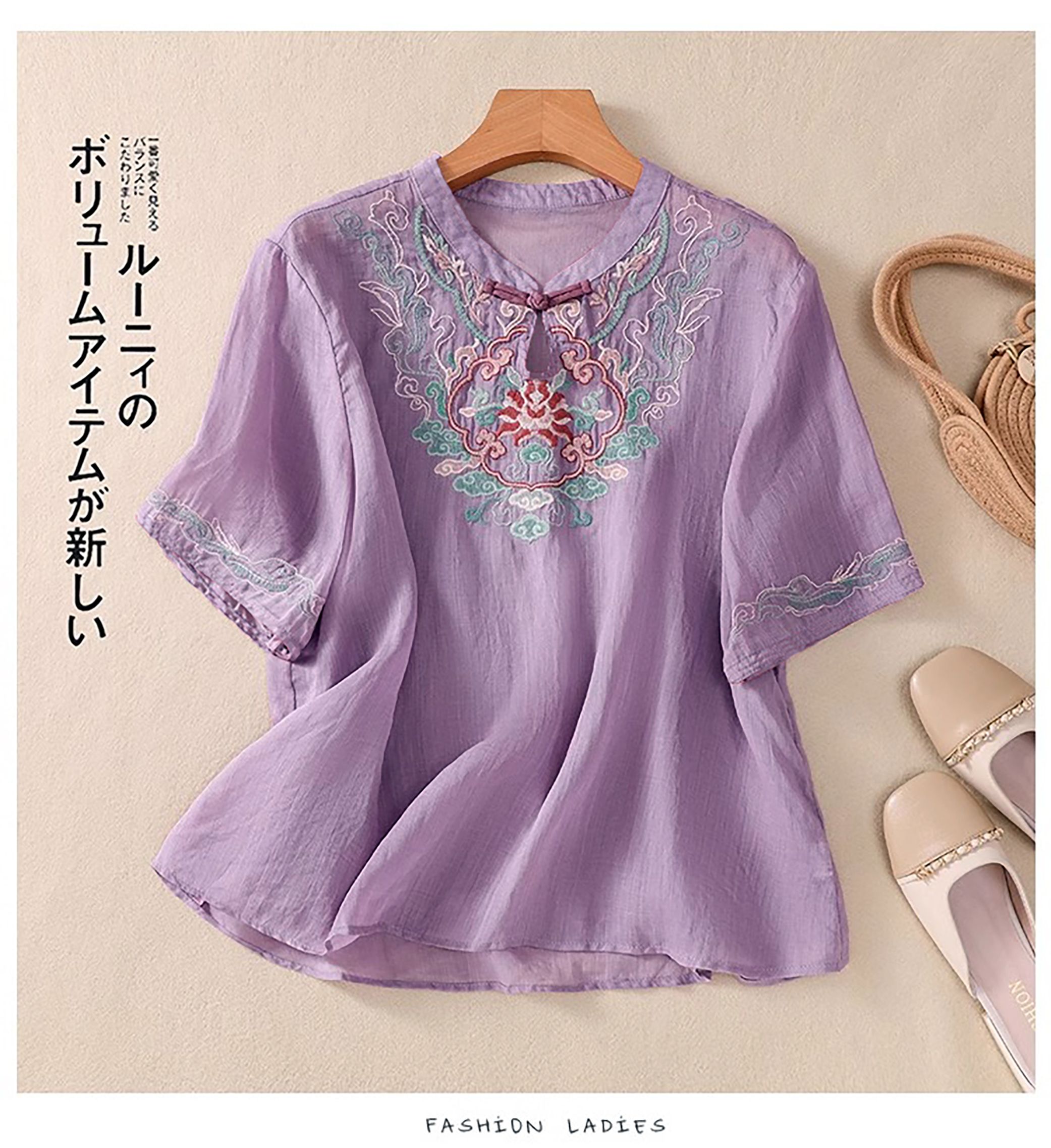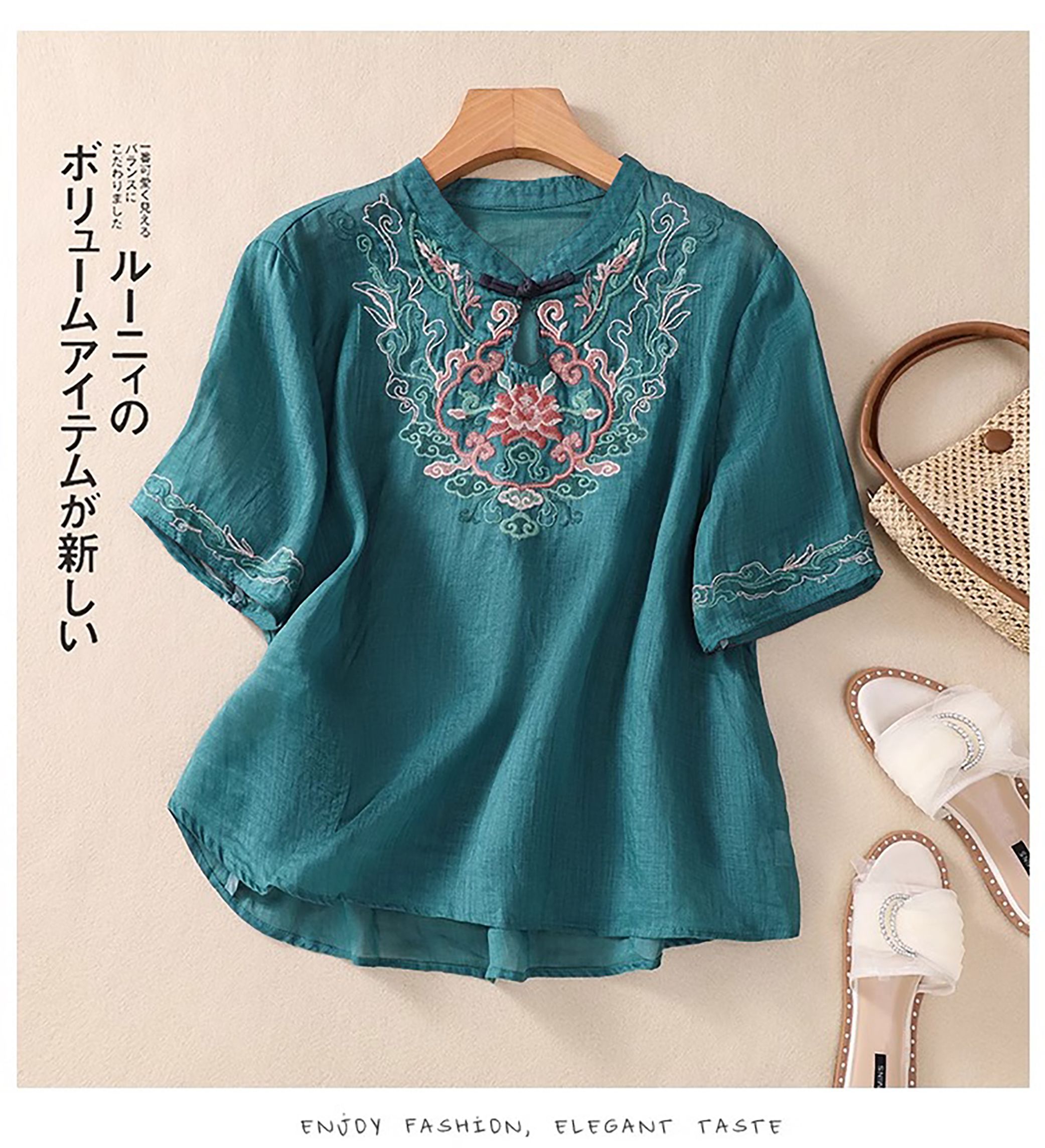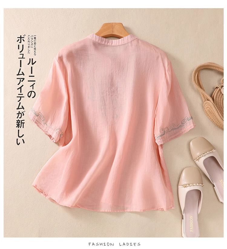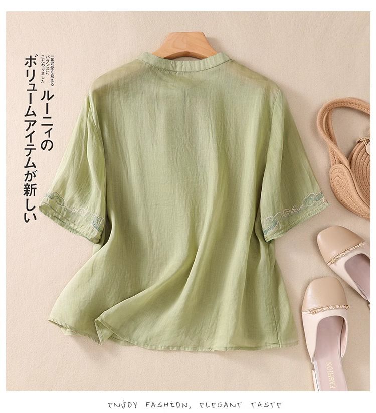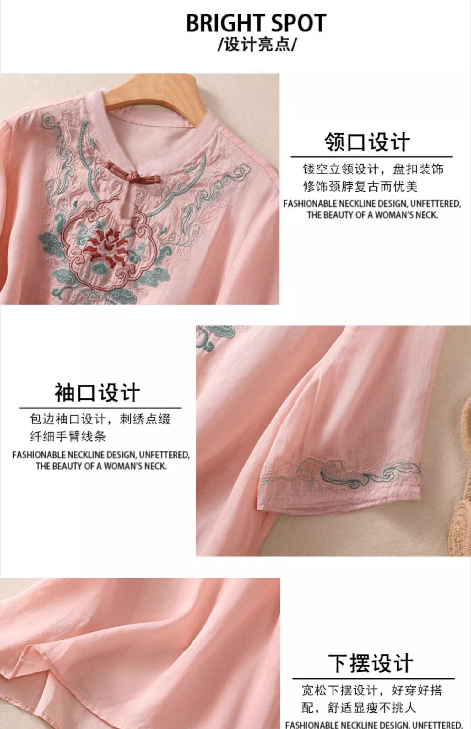 MY16567# 夏季国风复古刺绣盘扣旗袍领棉麻小衫中式宽松短袖套头上衣女女裝貨源服裝批發