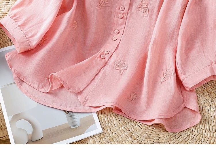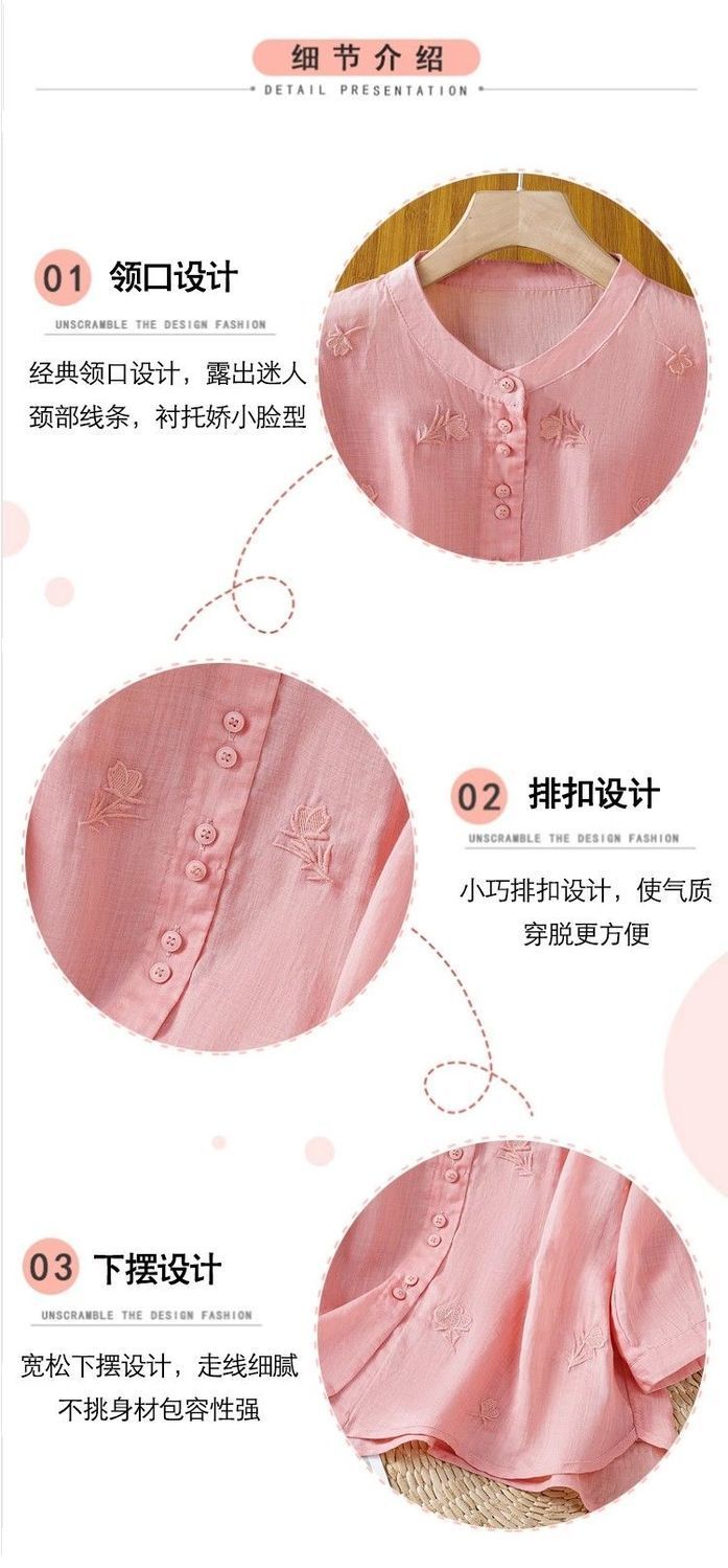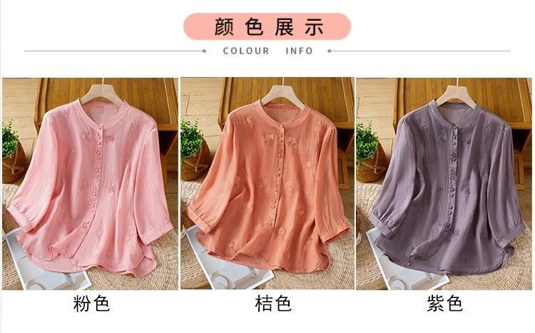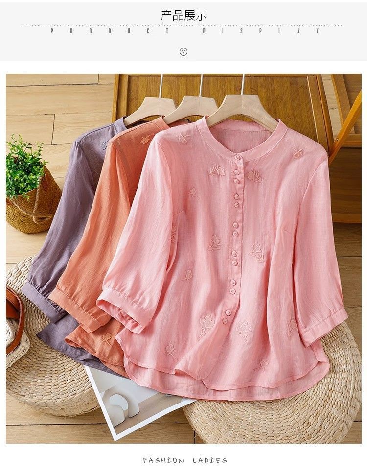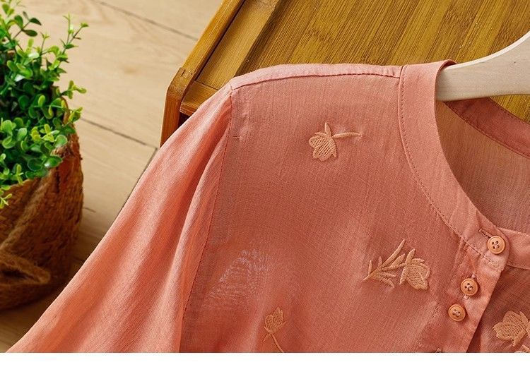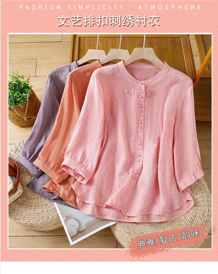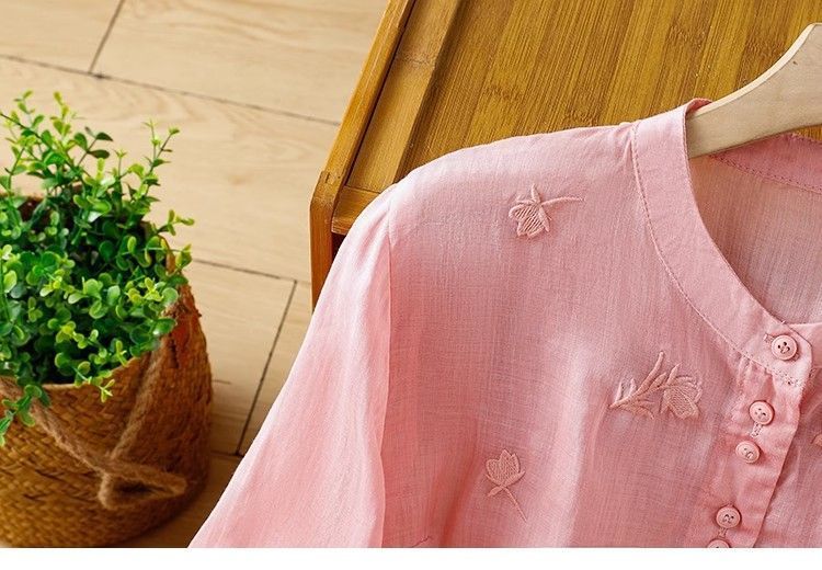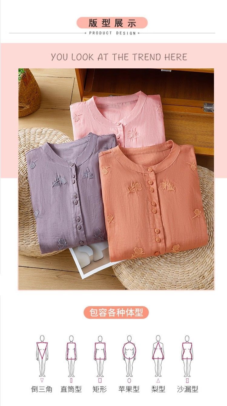 MY16570# 新款韩版宽松显瘦棉麻圆领七分袖刺绣衬衫女休闲纯色减龄上衣女裝貨源服裝批發