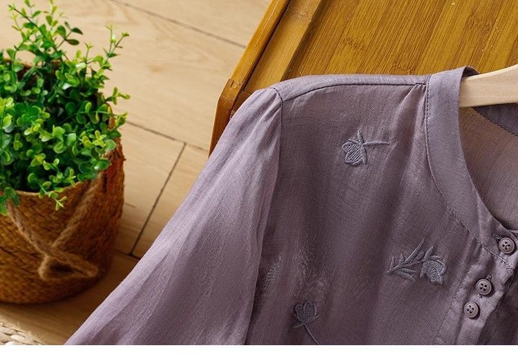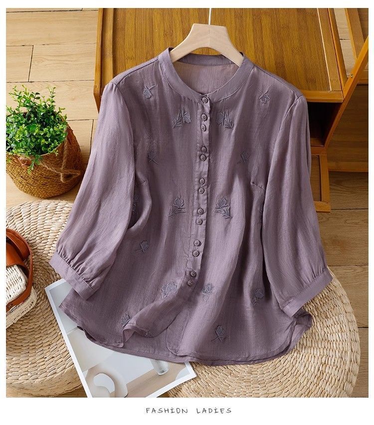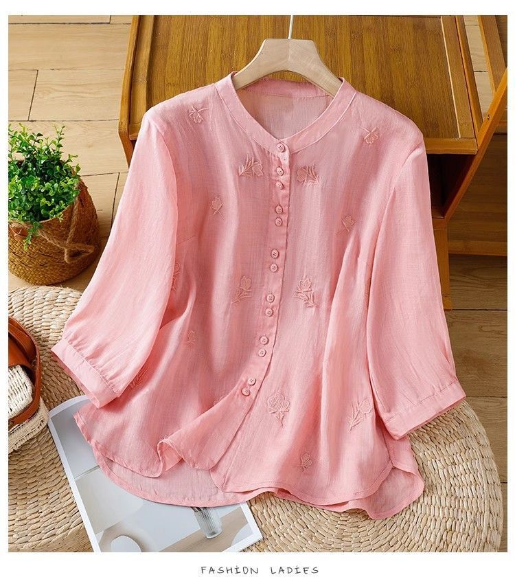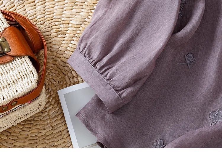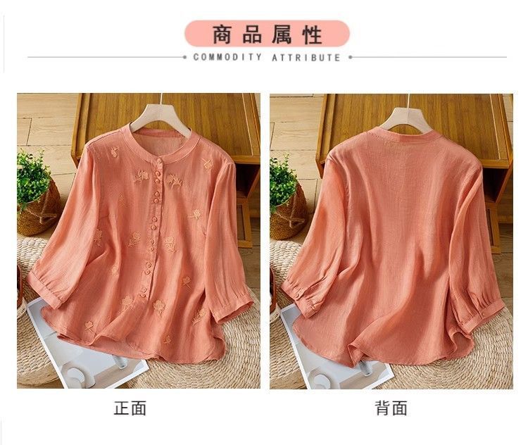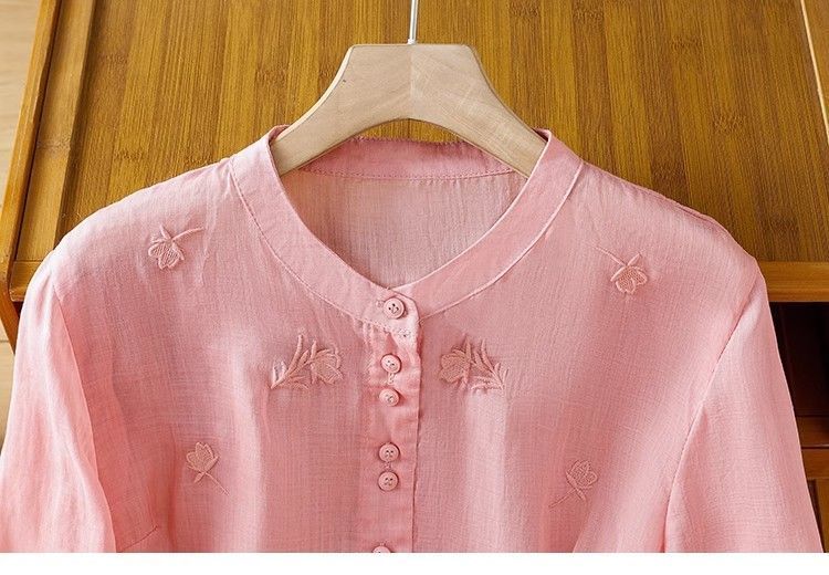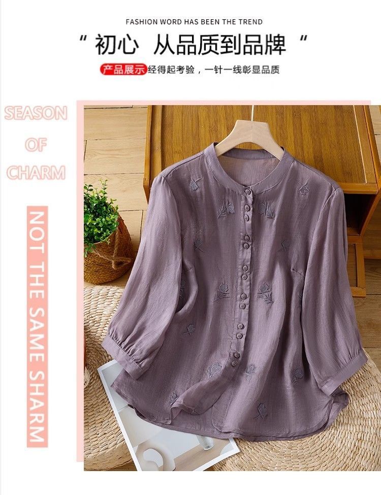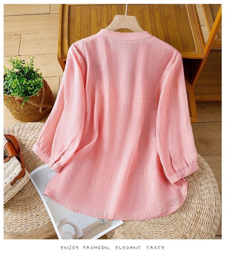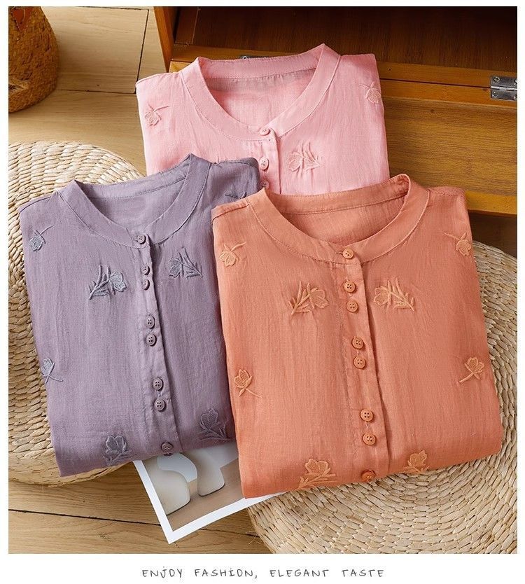MY16570# 新款韩版宽松显瘦棉麻圆领七分袖刺绣衬衫女休闲纯色减龄上衣女裝貨源服裝批發