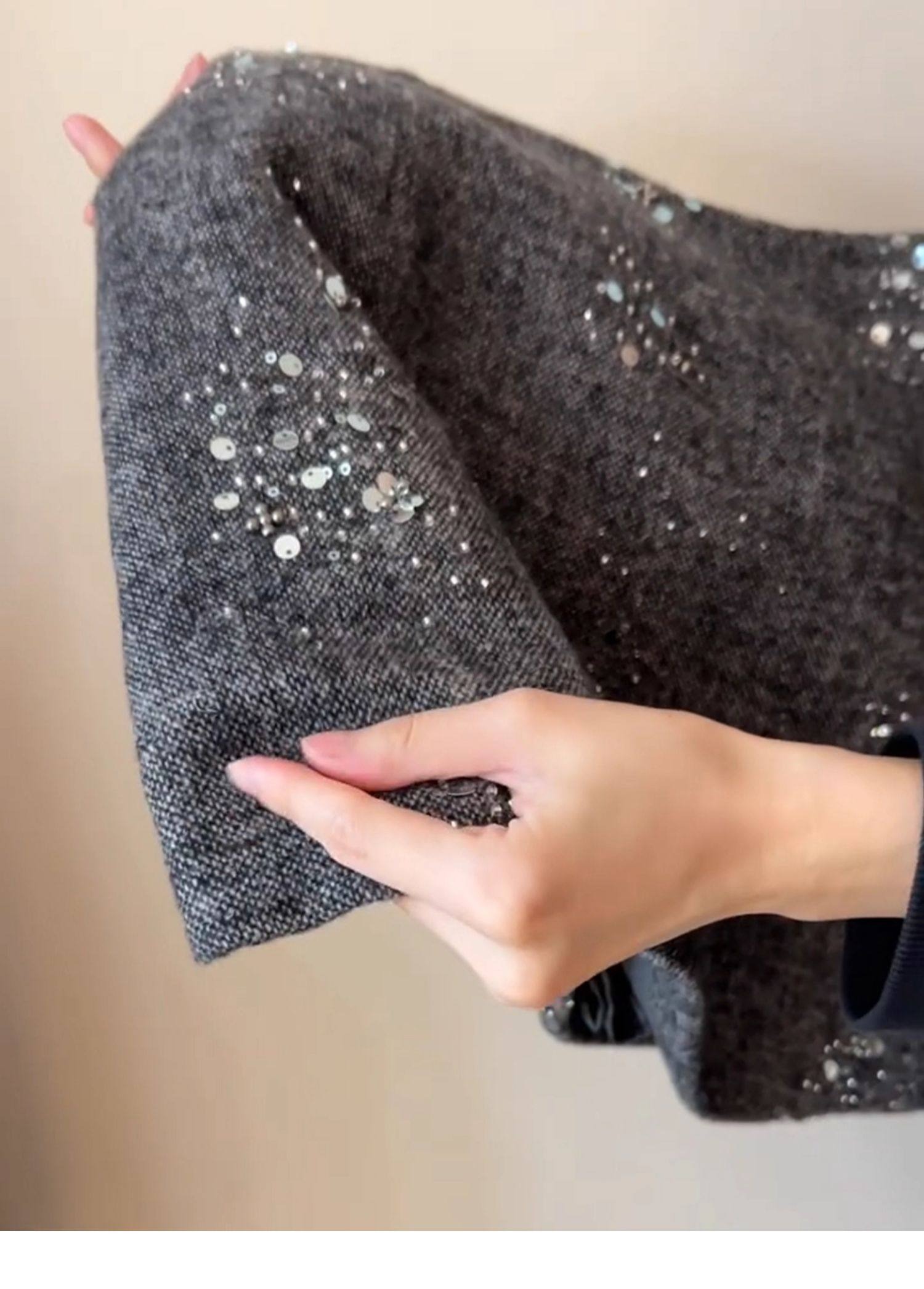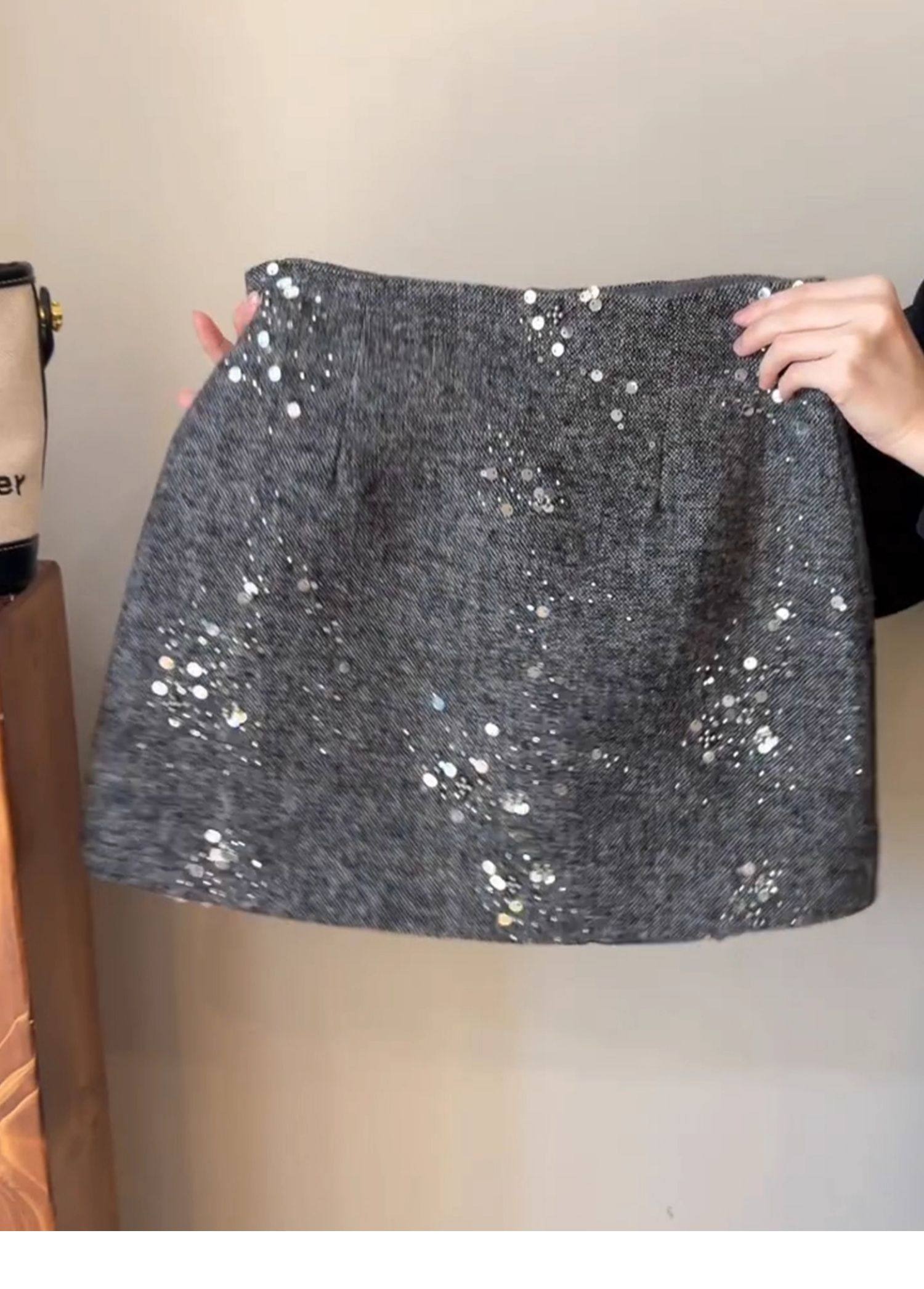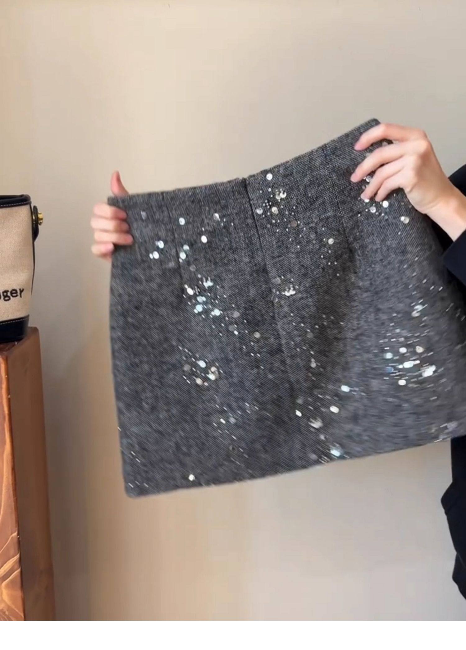MY16611# 小香风重工亮片半身裙新款高腰显瘦a字短裙灰色毛呢包臀裙女裝貨源服裝批發
