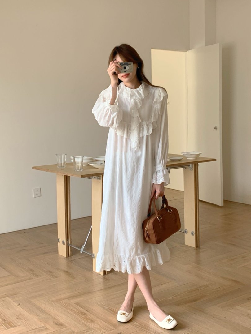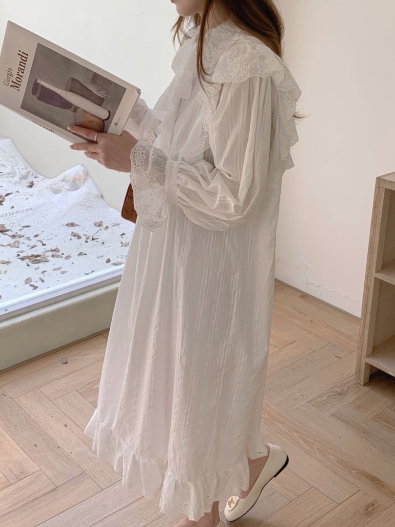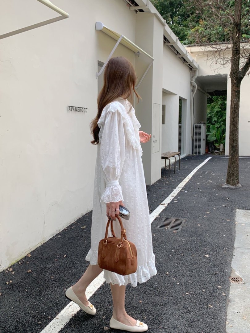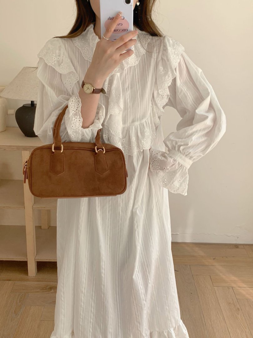 MY16613# 复古宫廷风雕孔绣褶边喇叭袖连衣裙女裝貨源服裝批發