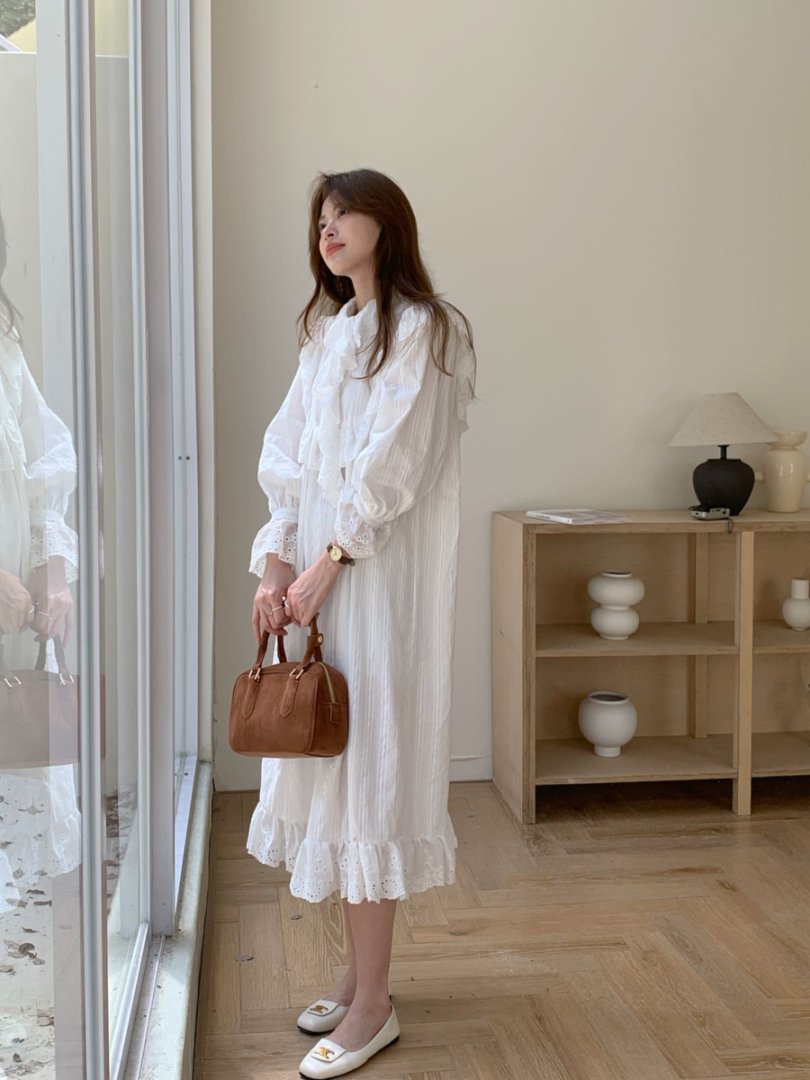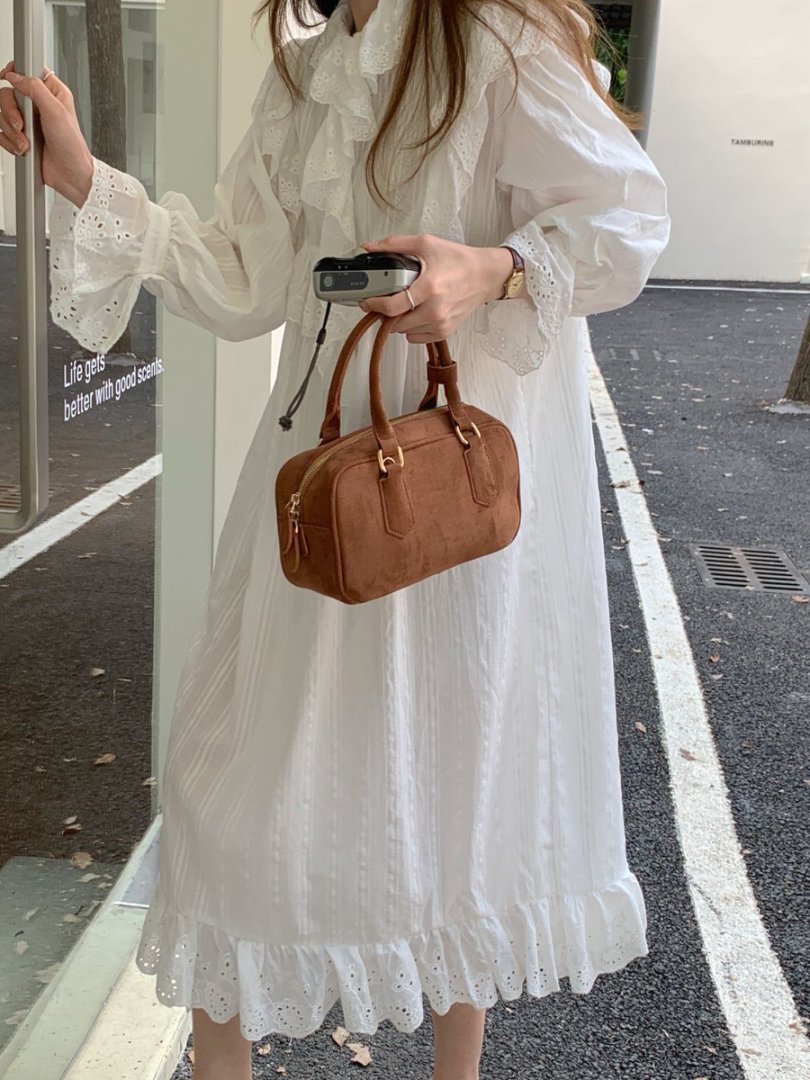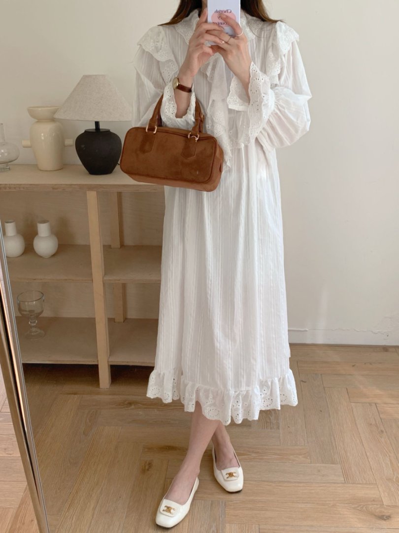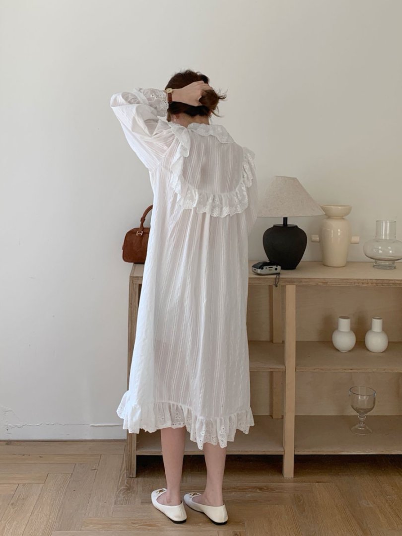 MY16613# 复古宫廷风雕孔绣褶边喇叭袖连衣裙女裝貨源服裝批發