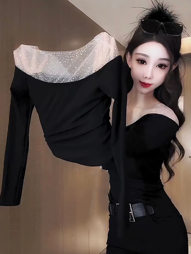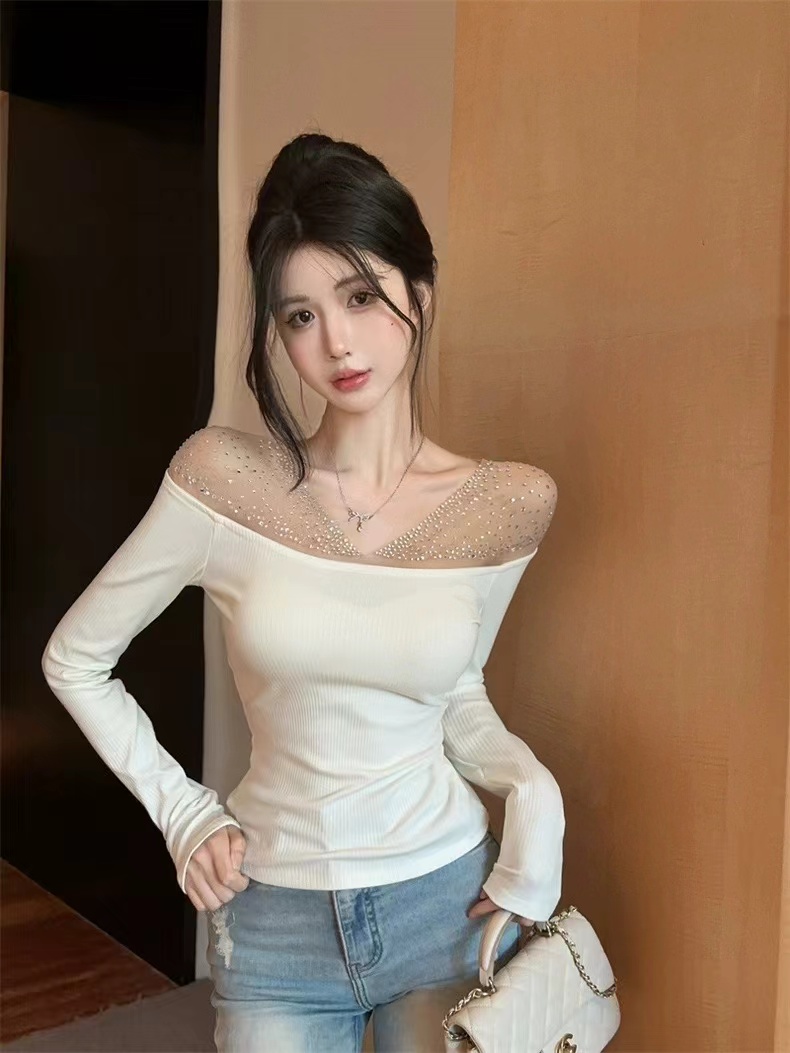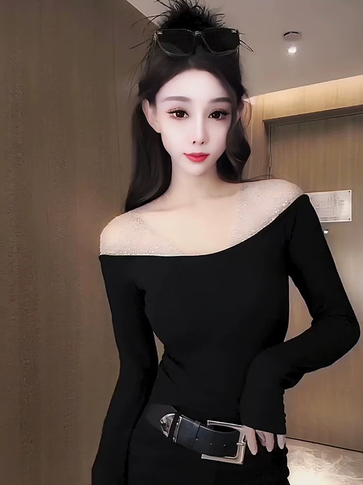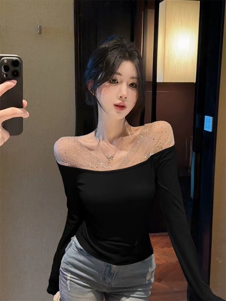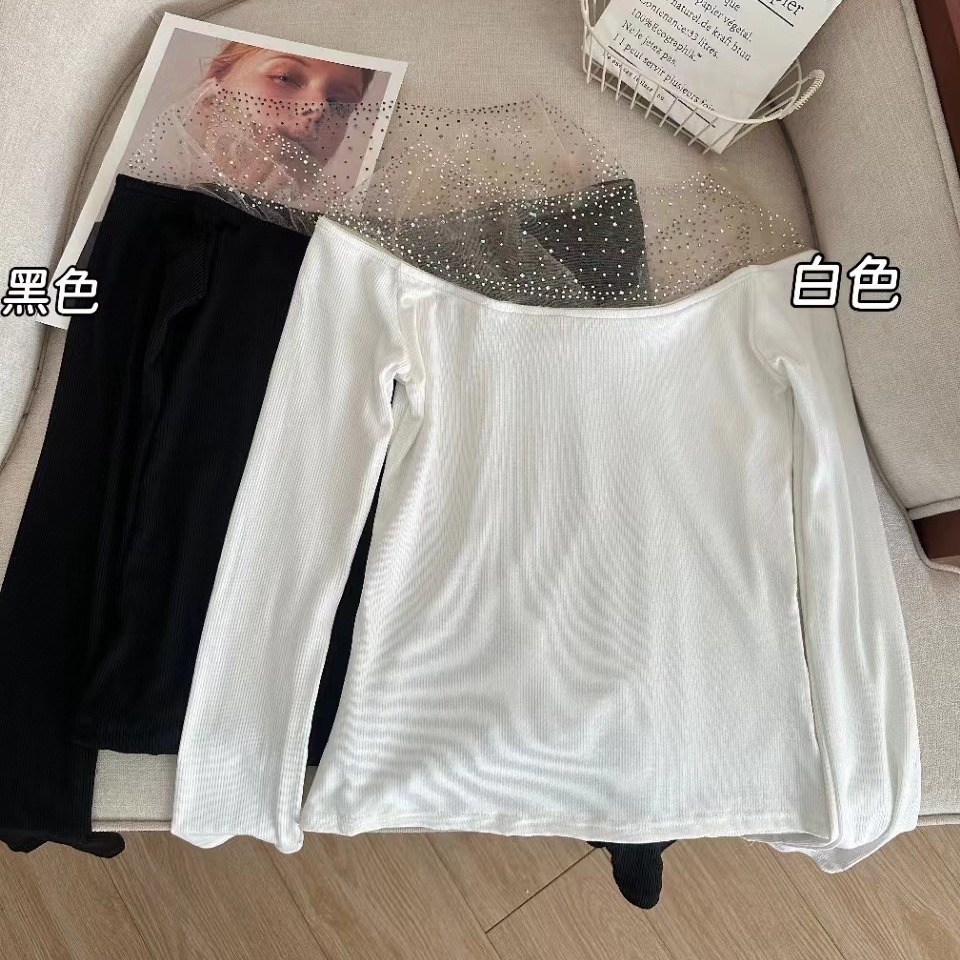 MY16622# 法式镶钻一字肩长袖打底衫上衣新款修身显瘦露肩上衣女裝貨源服裝批發
