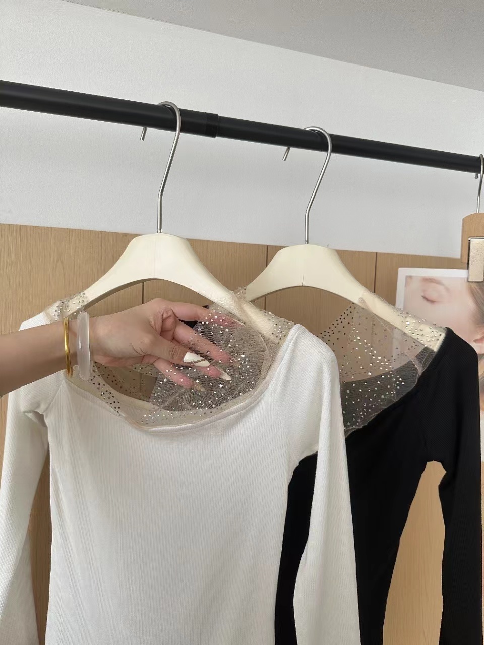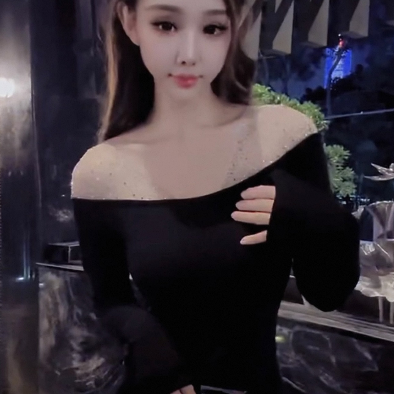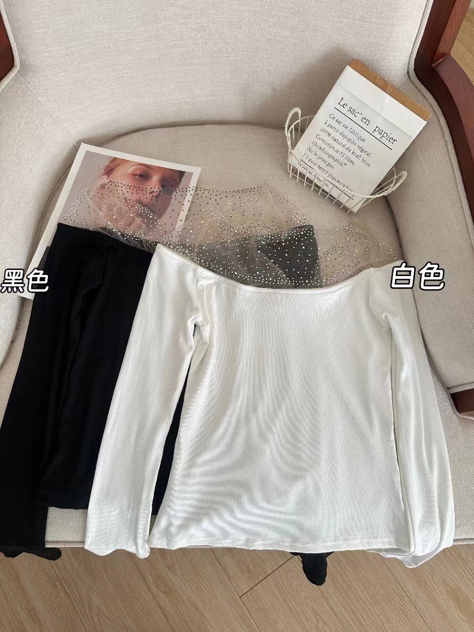 MY16622# 法式镶钻一字肩长袖打底衫上衣新款修身显瘦露肩上衣女裝貨源服裝批發