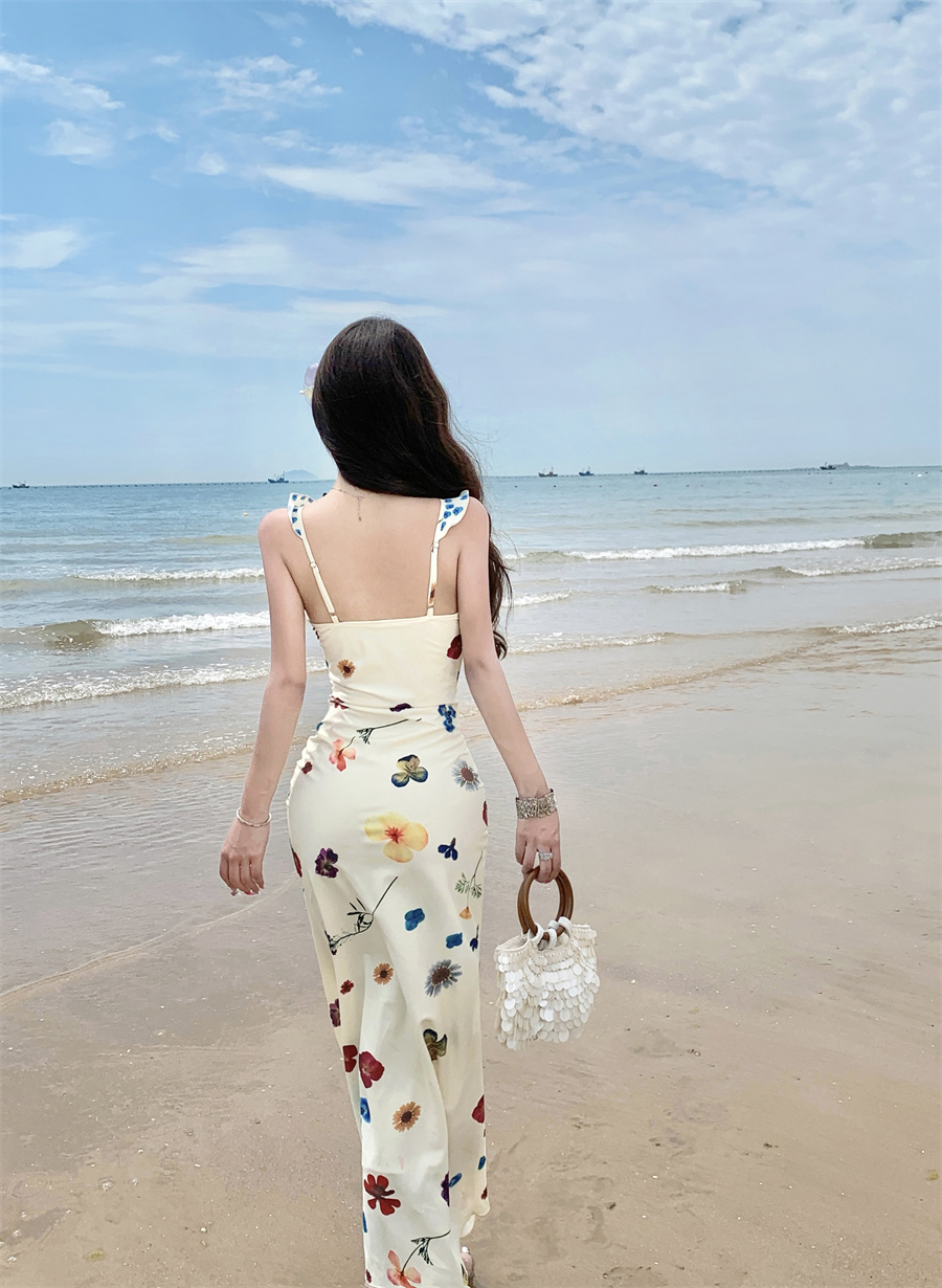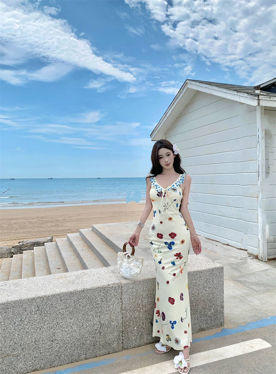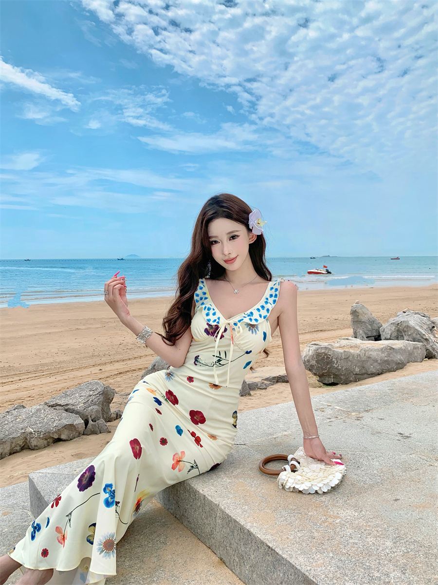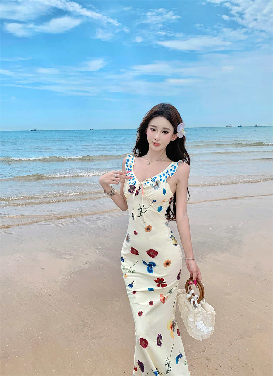 MY16636# 裙子女夏季新款蓝色系碎花吊带连衣裙法式斜裁度假长裙&方巾女裝貨源服裝批發