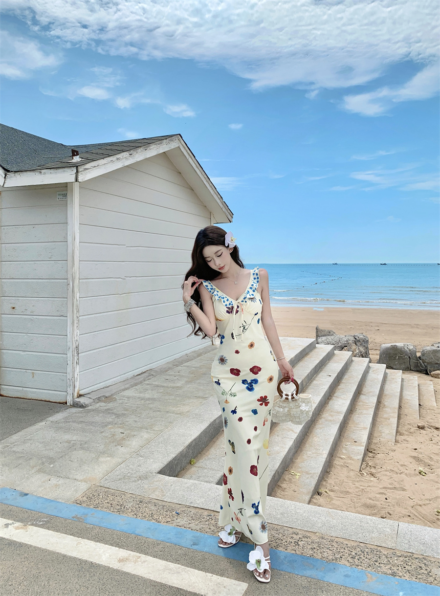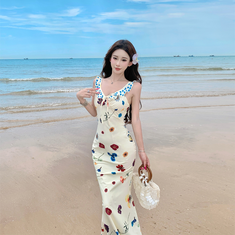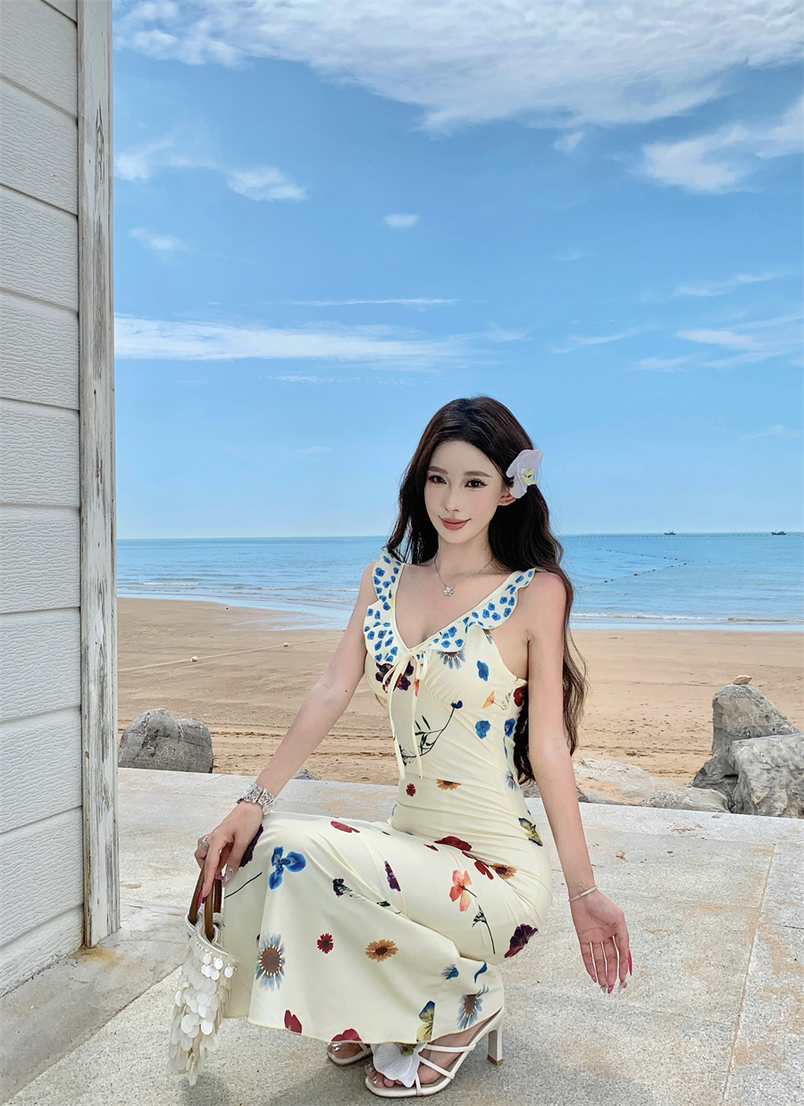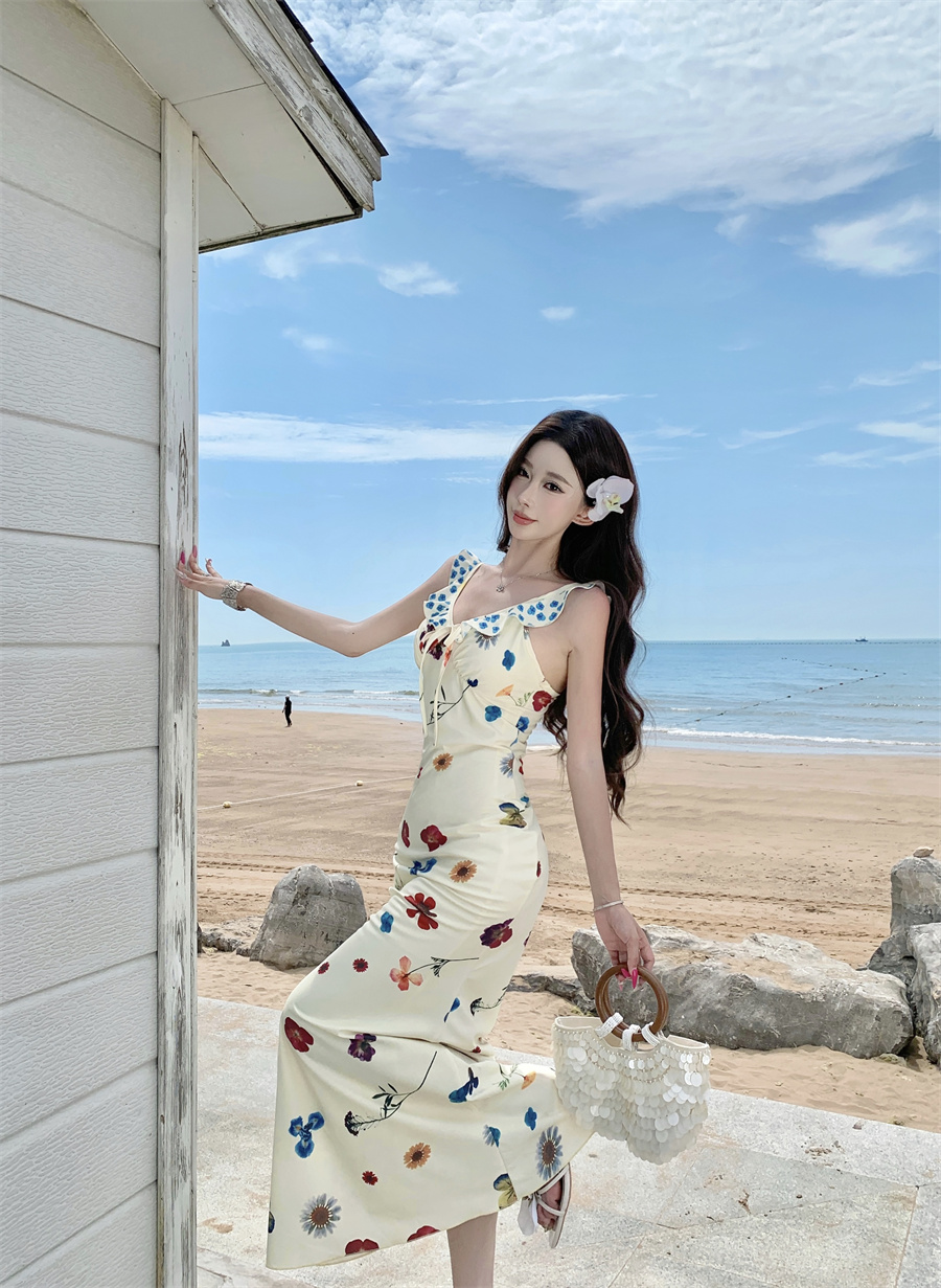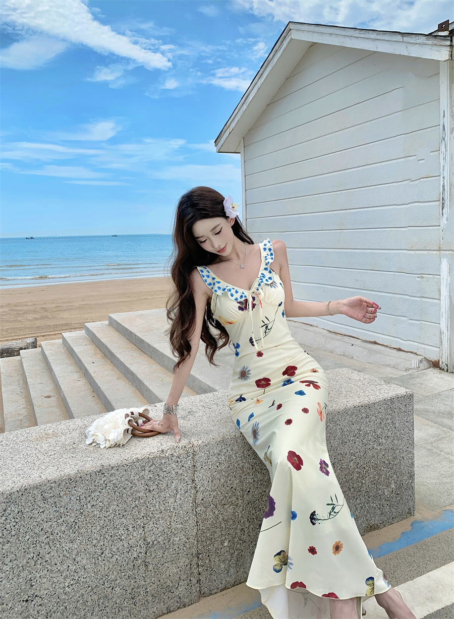 MY16636# 裙子女夏季新款蓝色系碎花吊带连衣裙法式斜裁度假长裙&方巾女裝貨源服裝批發