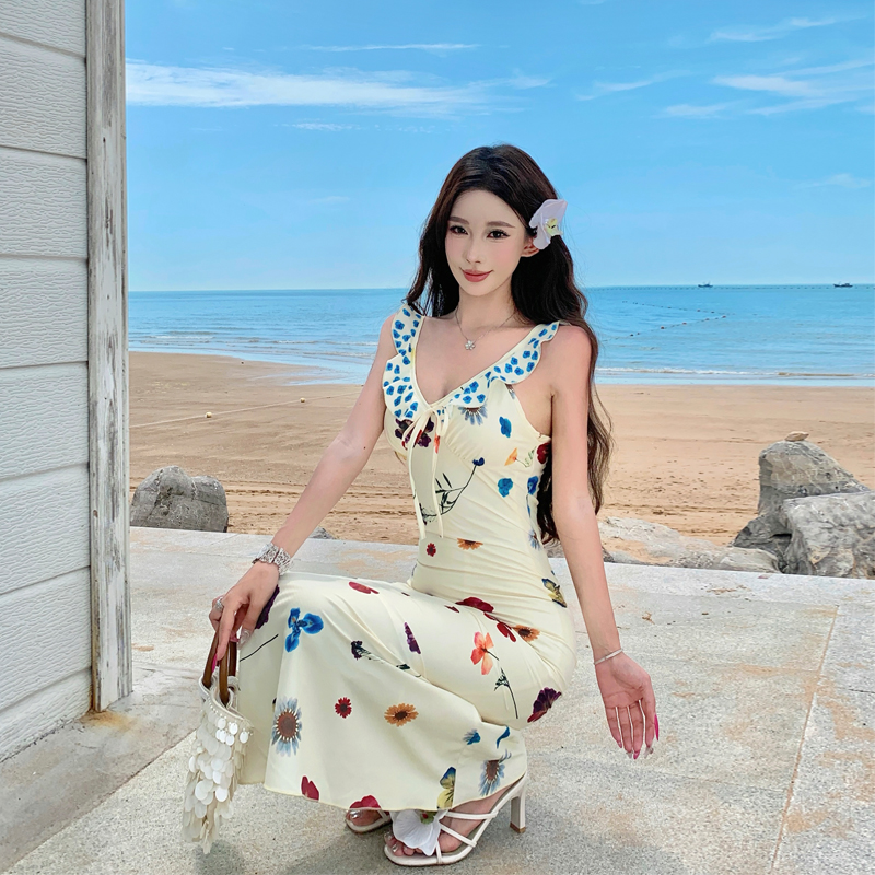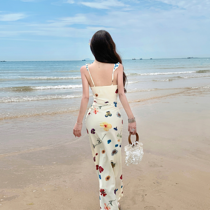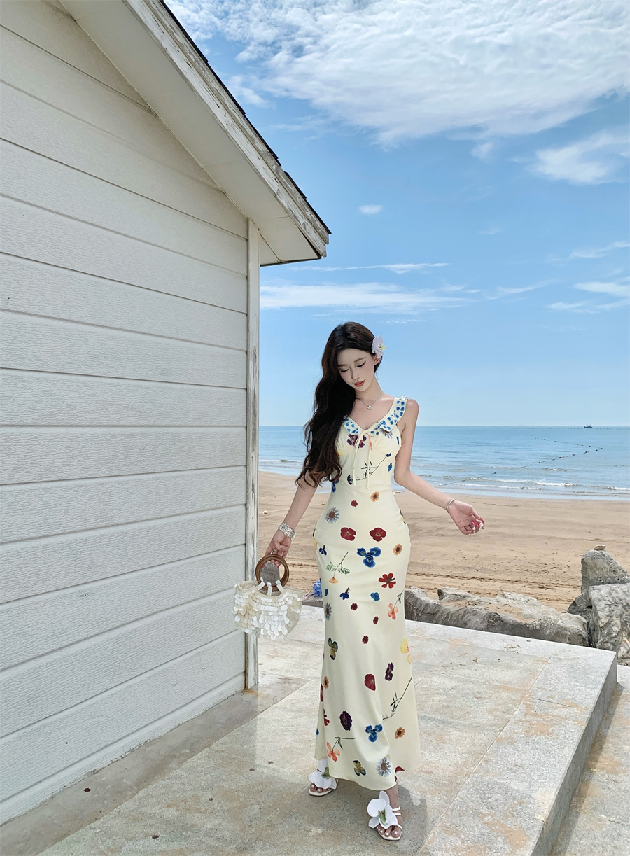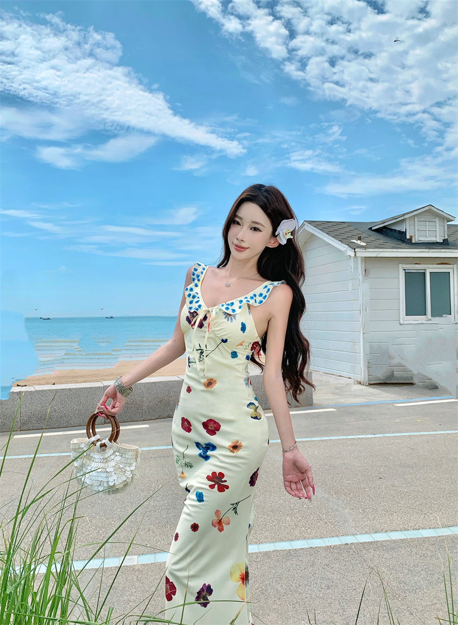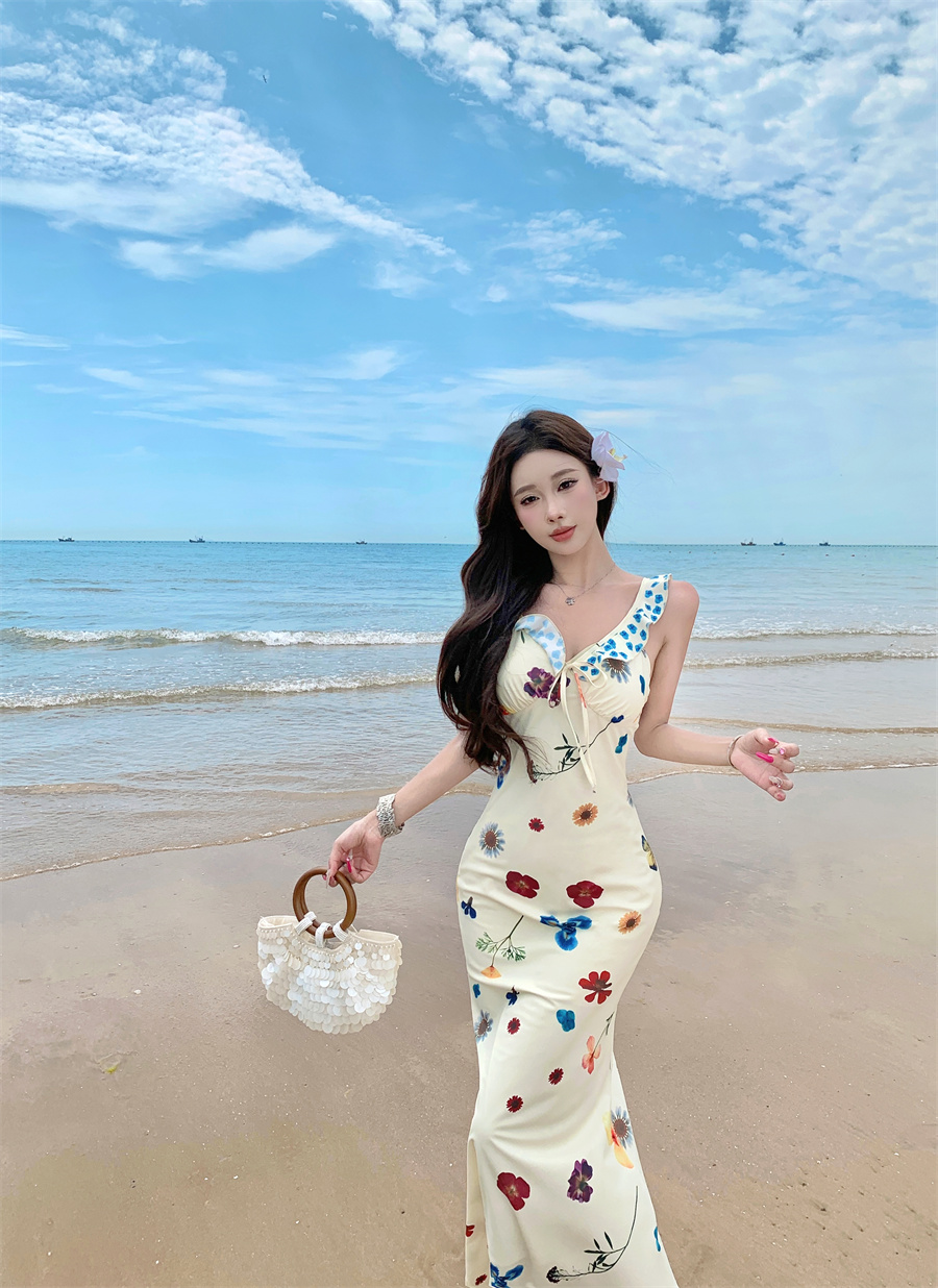 MY16636# 裙子女夏季新款蓝色系碎花吊带连衣裙法式斜裁度假长裙&方巾女裝貨源服裝批發