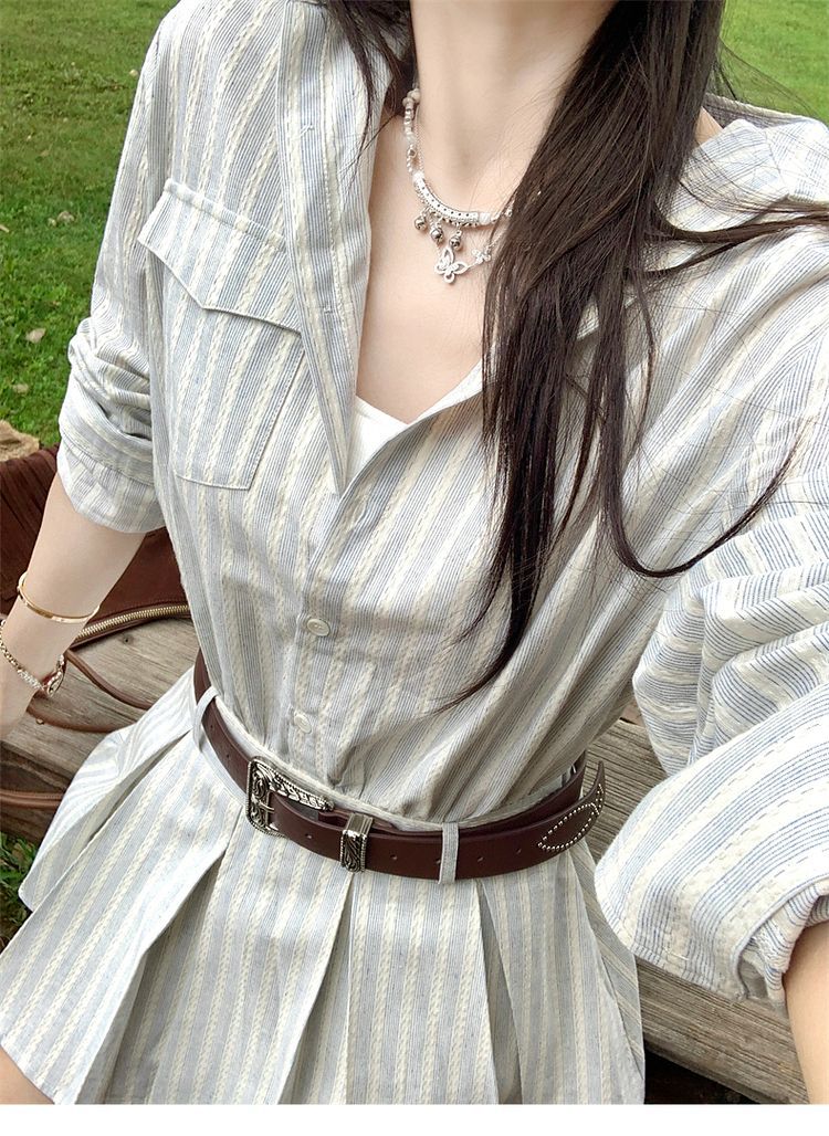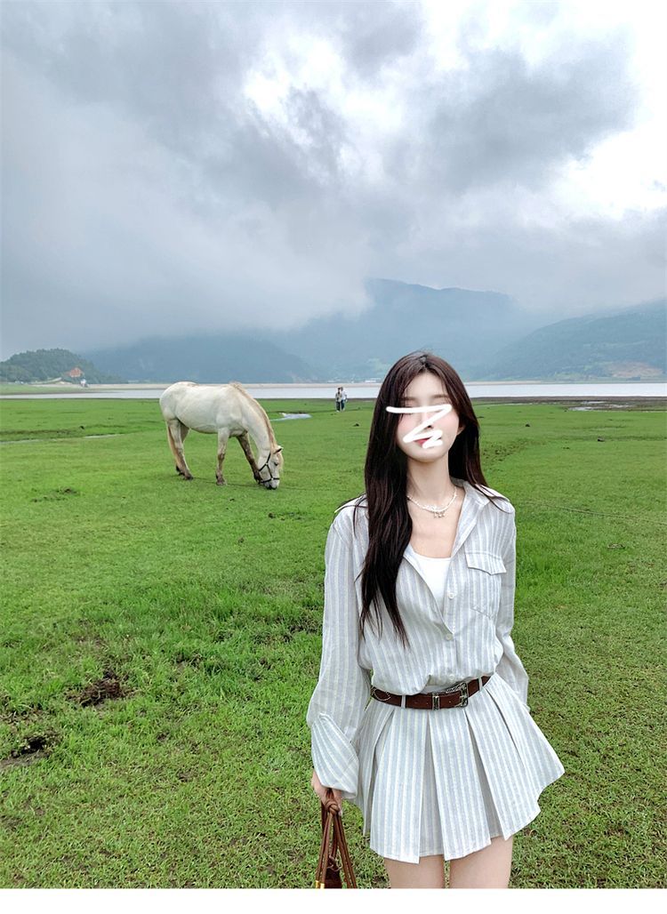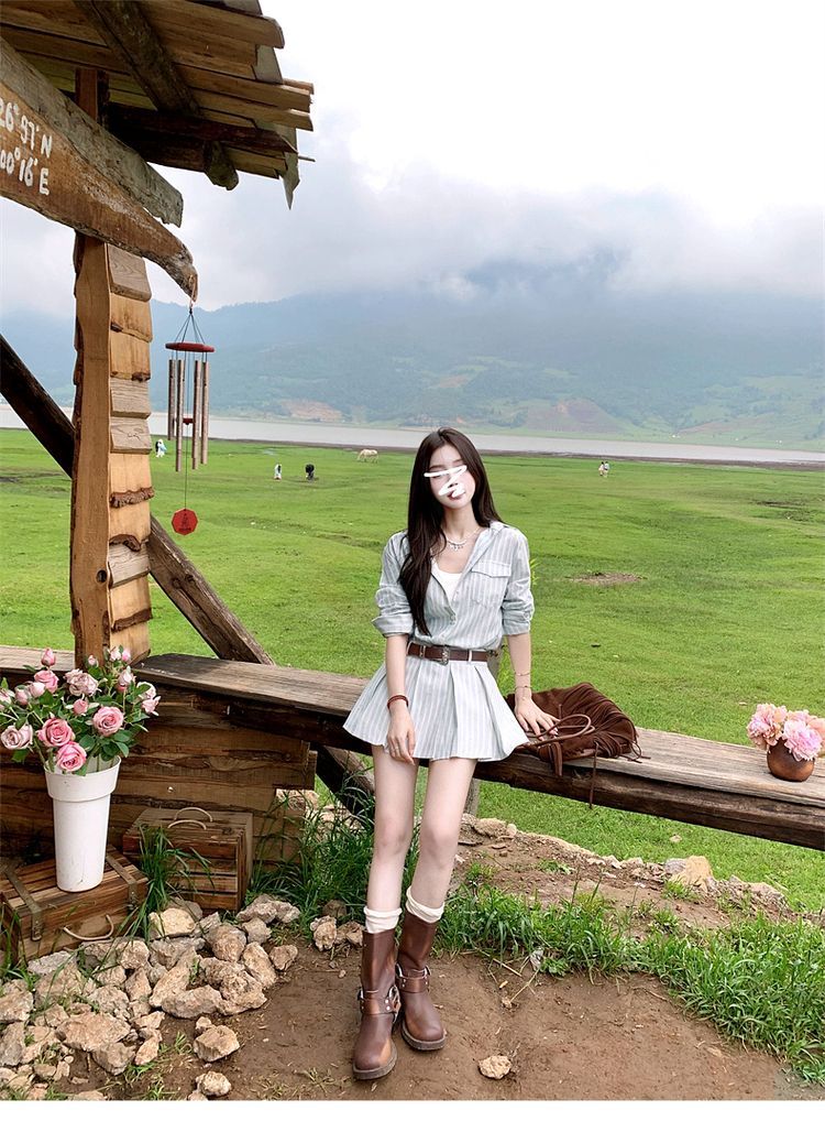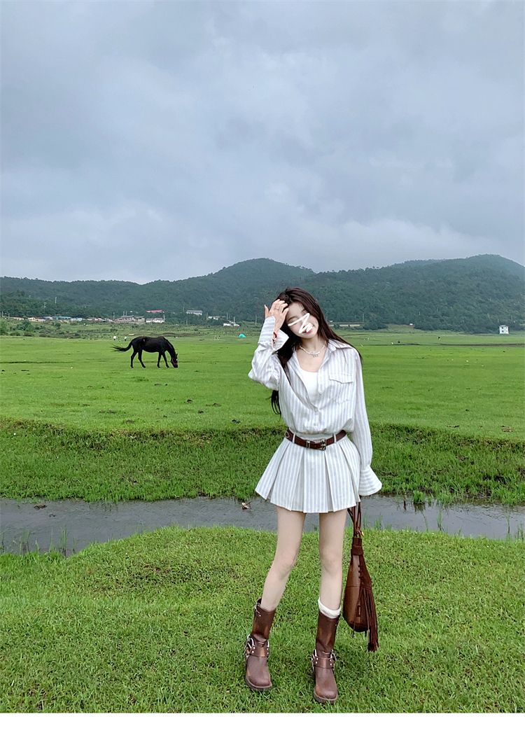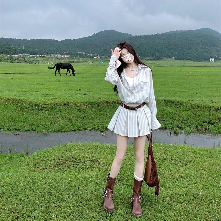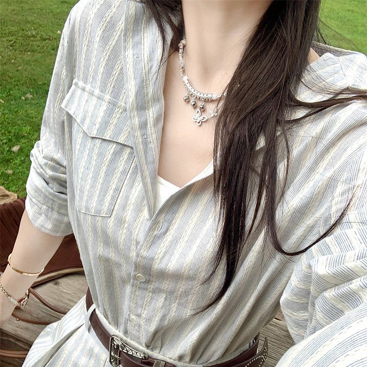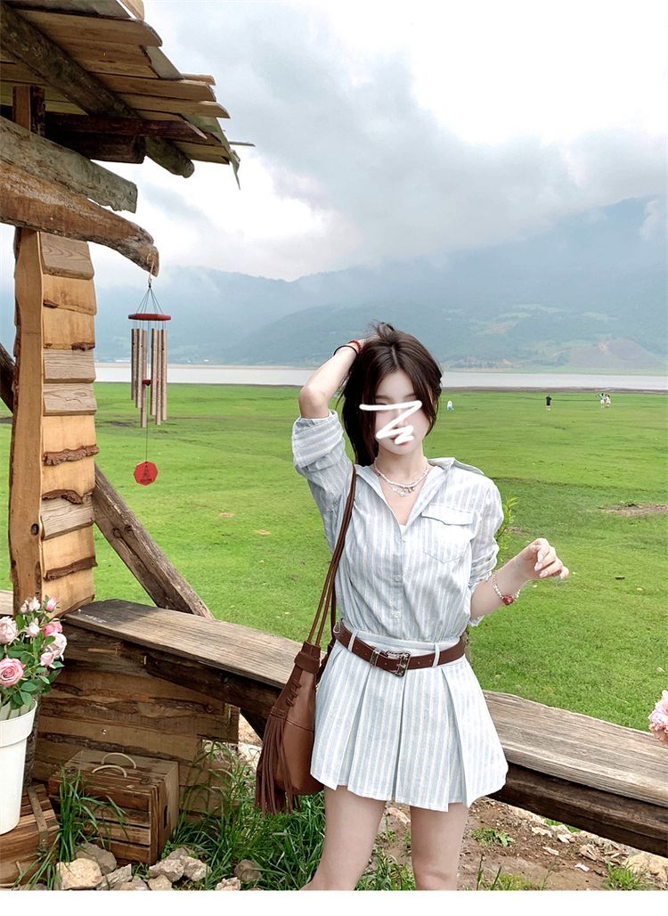 MY16639# 长袖条纹衬衫连衣裙子女装夏季新款高级感度假短裙搭配一整套女裝貨源服裝批發