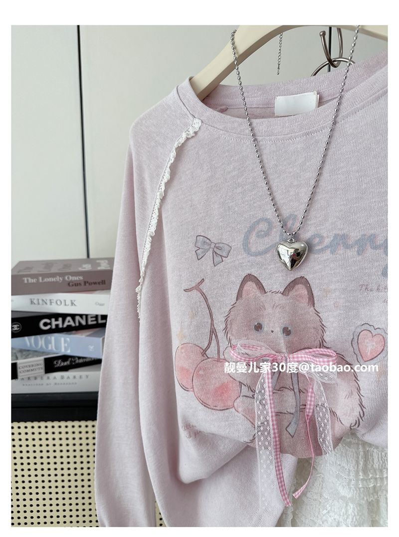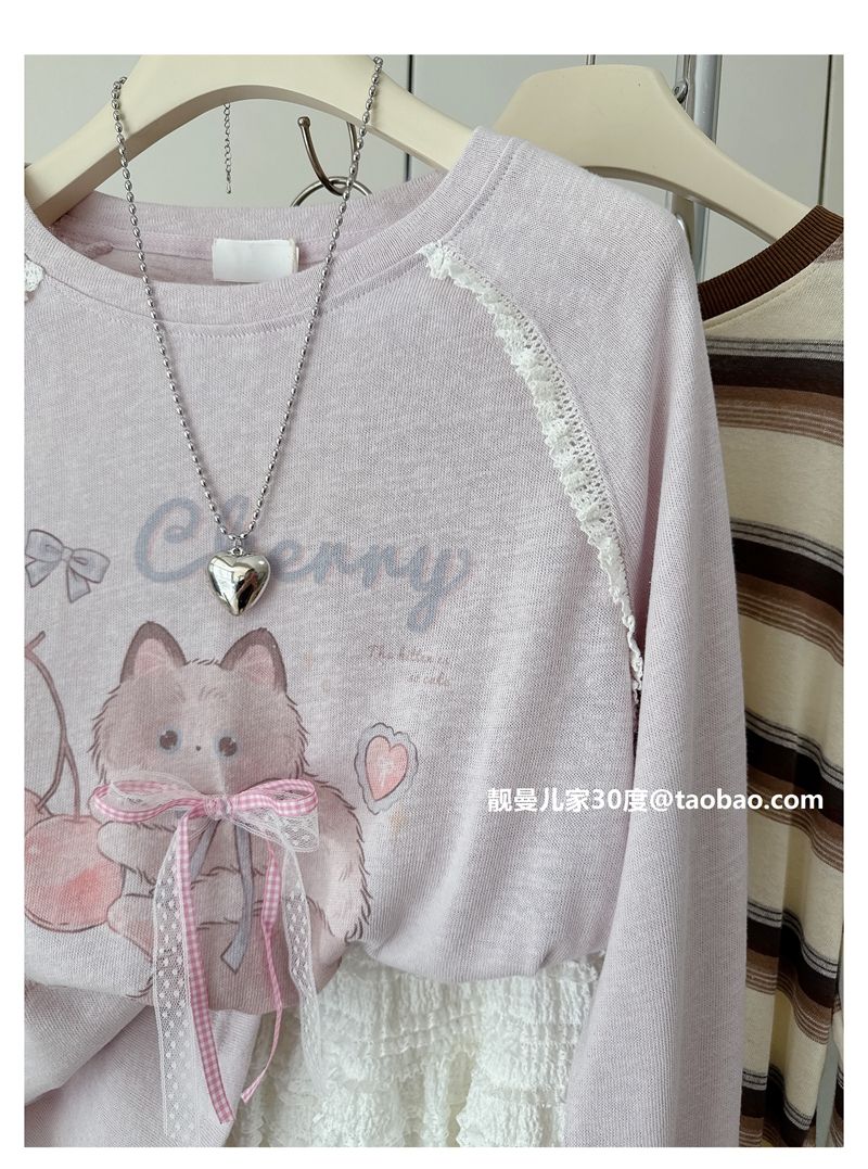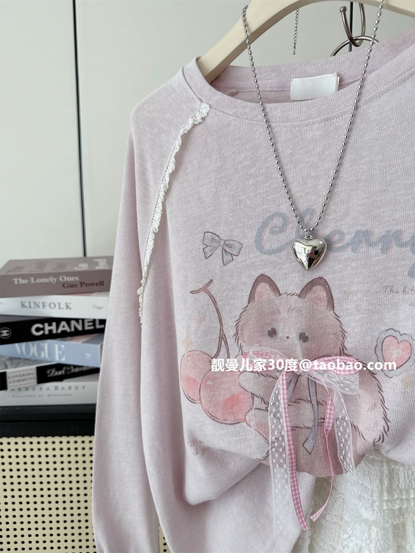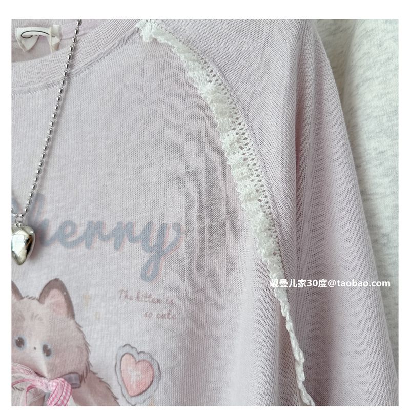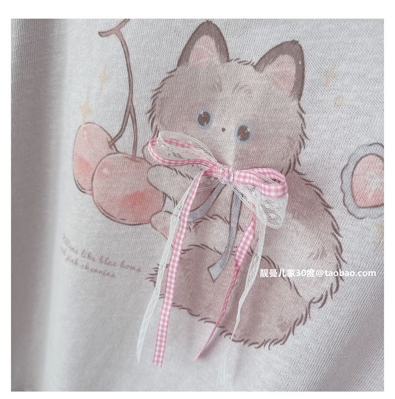 MY16641# 21支纯棉特大码300斤简约别致风~樱桃小猫女上衣打底T恤衫女裝貨源服裝批發