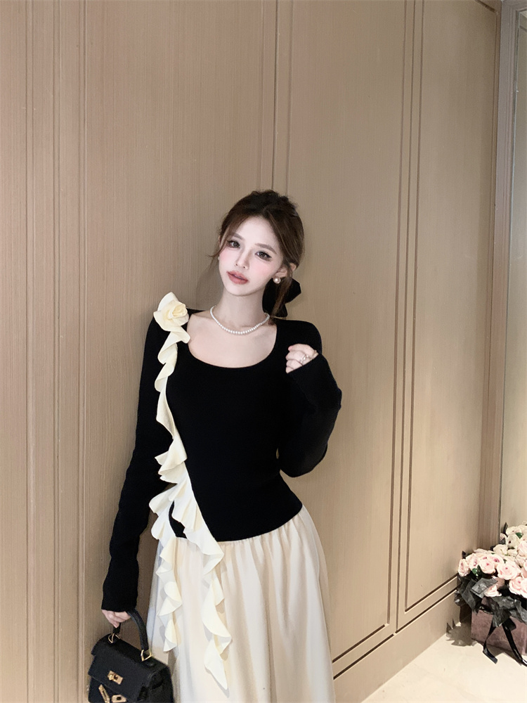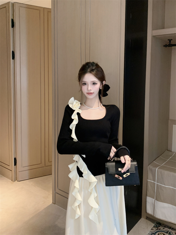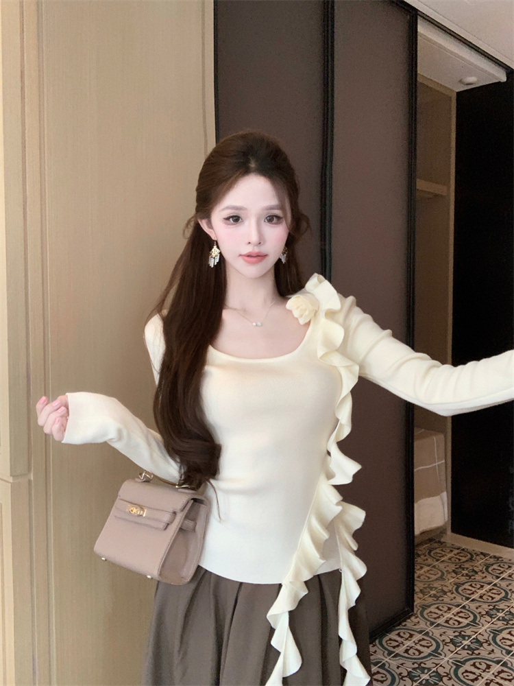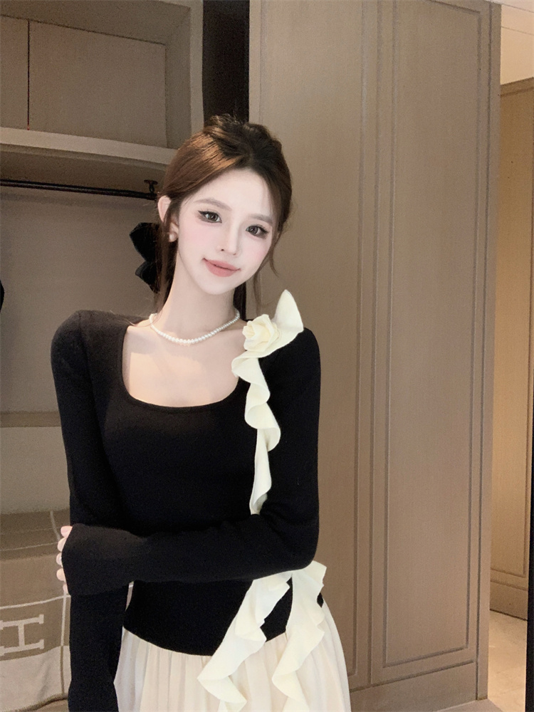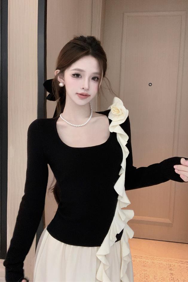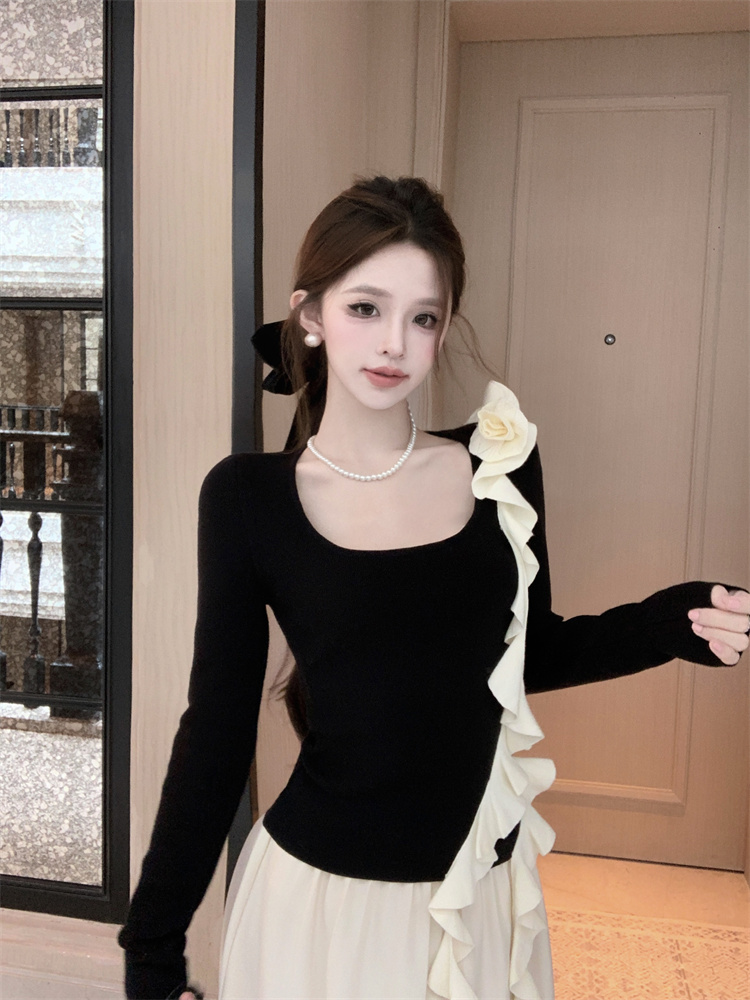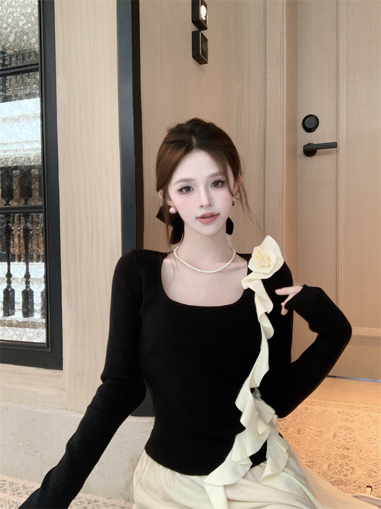 MY16645# 高级感撞色荷叶边针织上衣修身方领立体花朵个性内搭上衣女裝貨源服裝批發