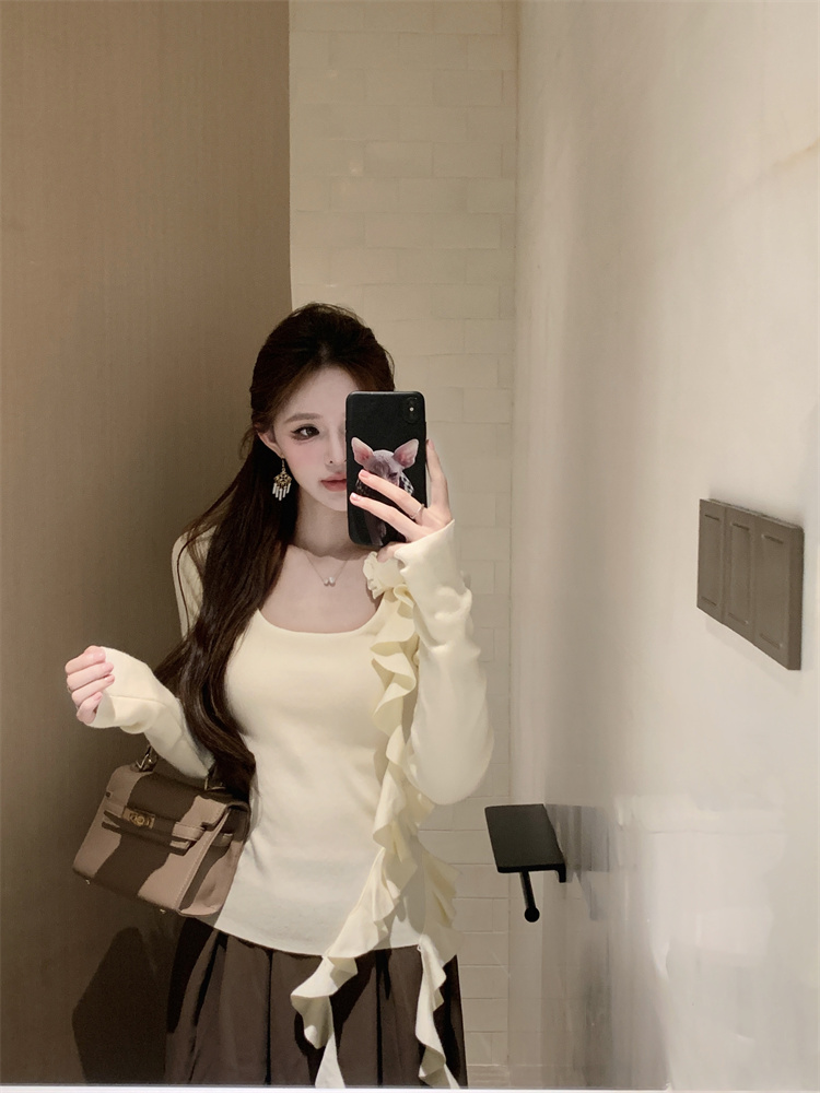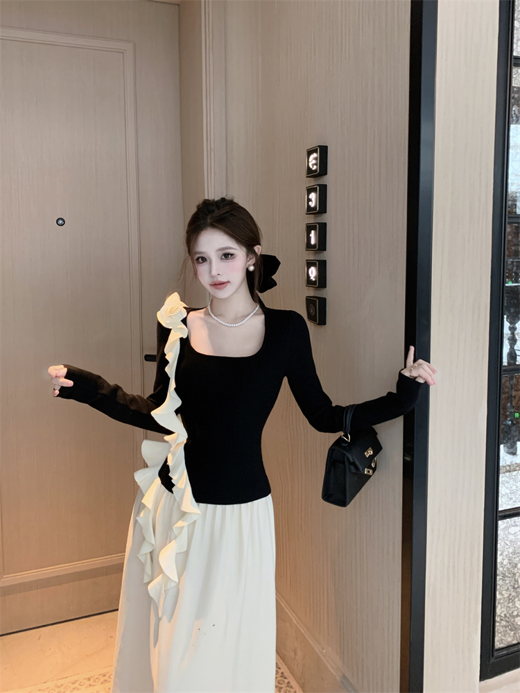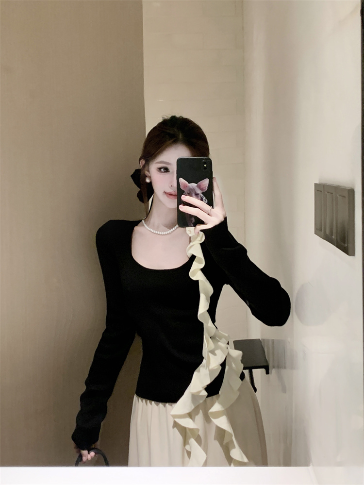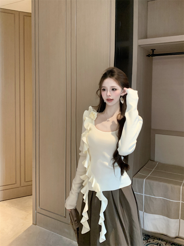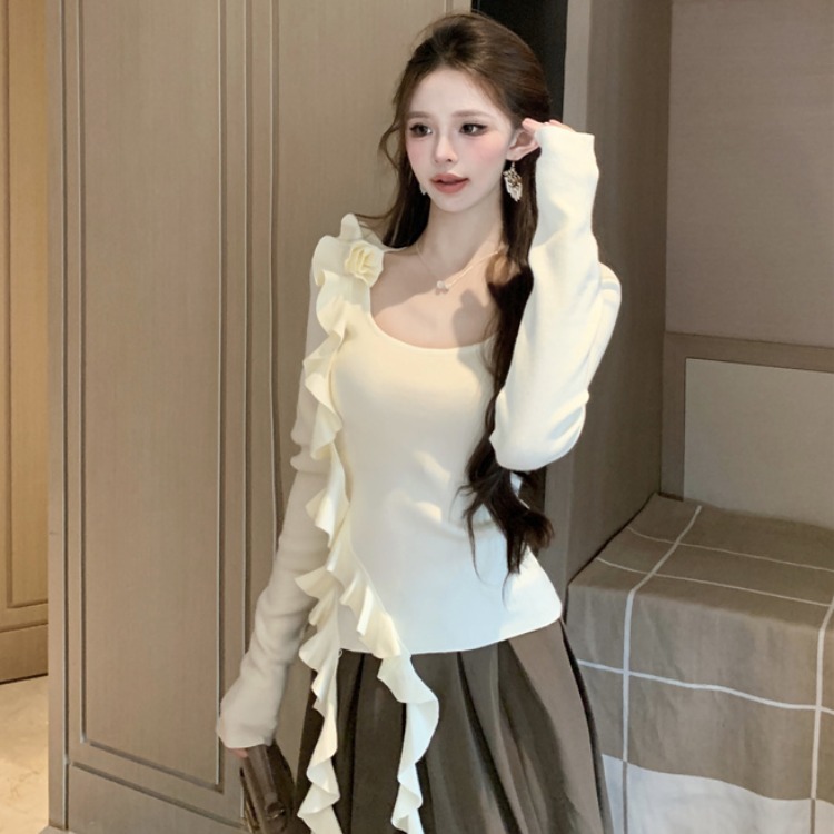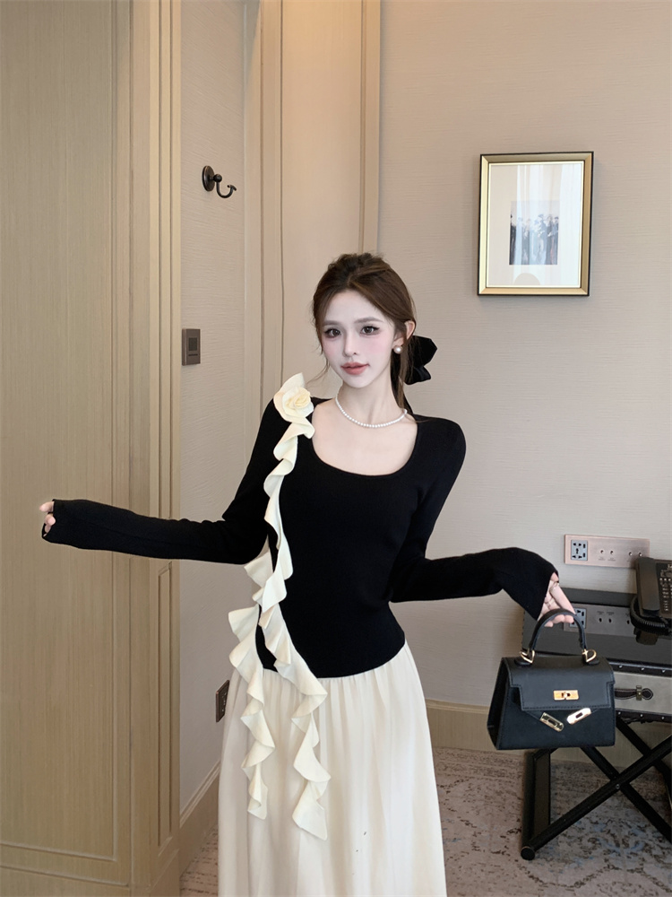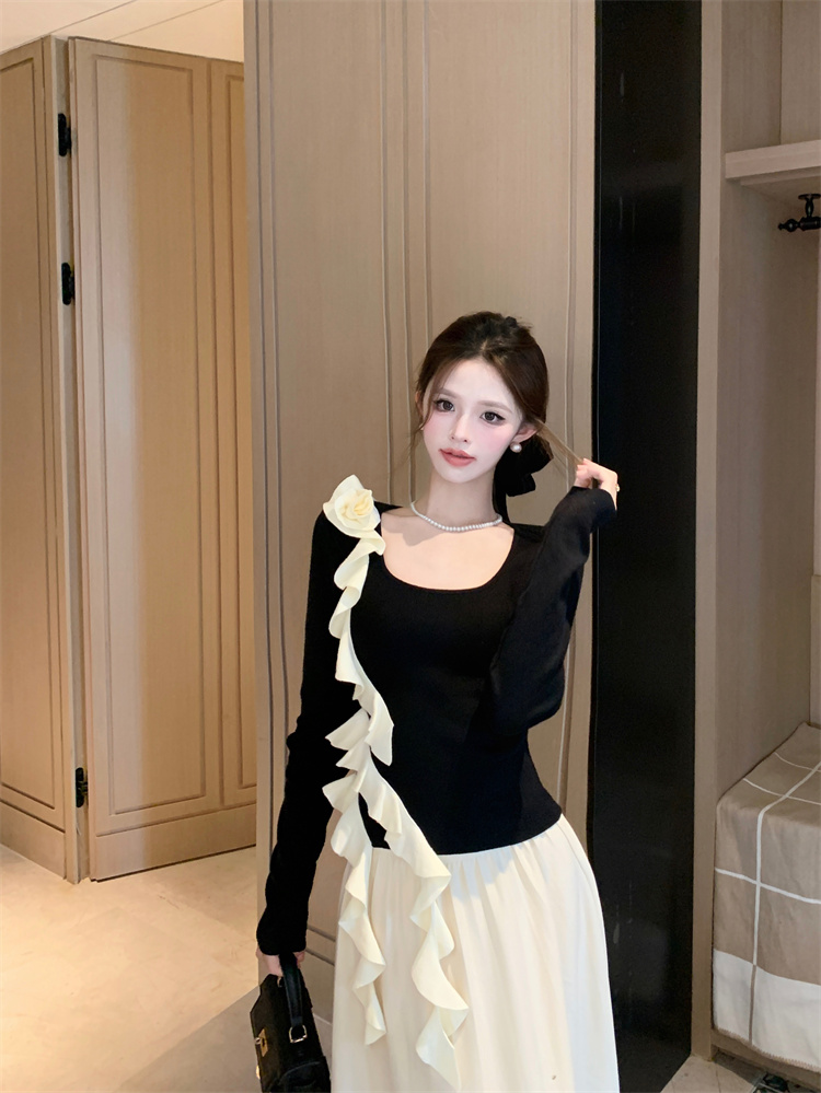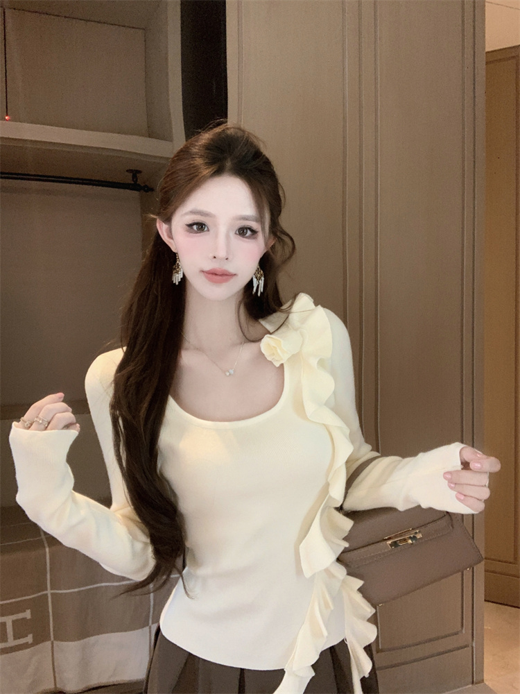MY16645# 高级感撞色荷叶边针织上衣修身方领立体花朵个性内搭上衣女裝貨源服裝批發