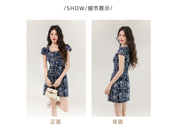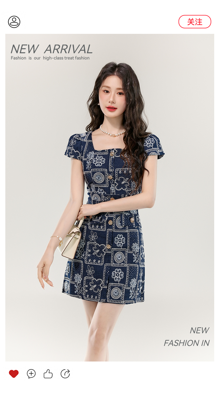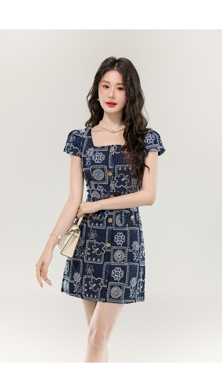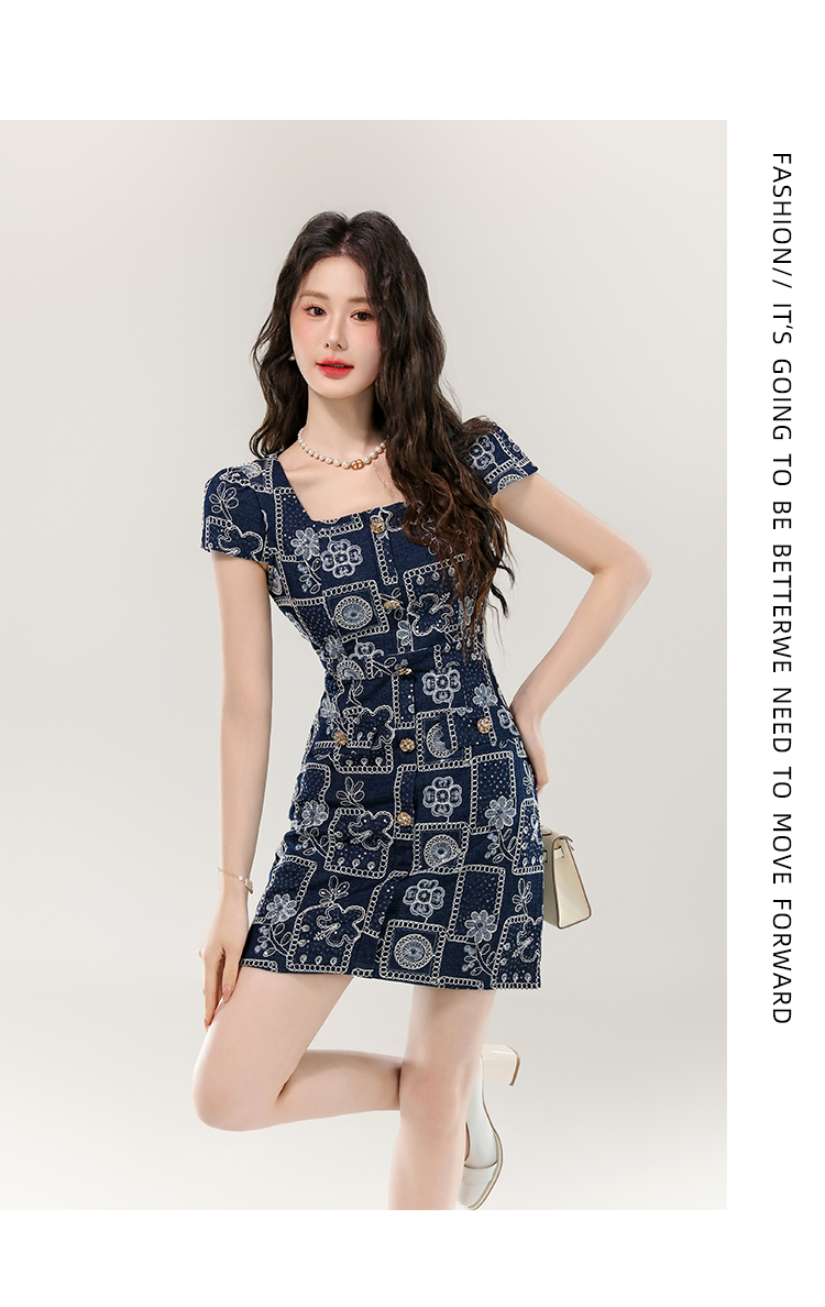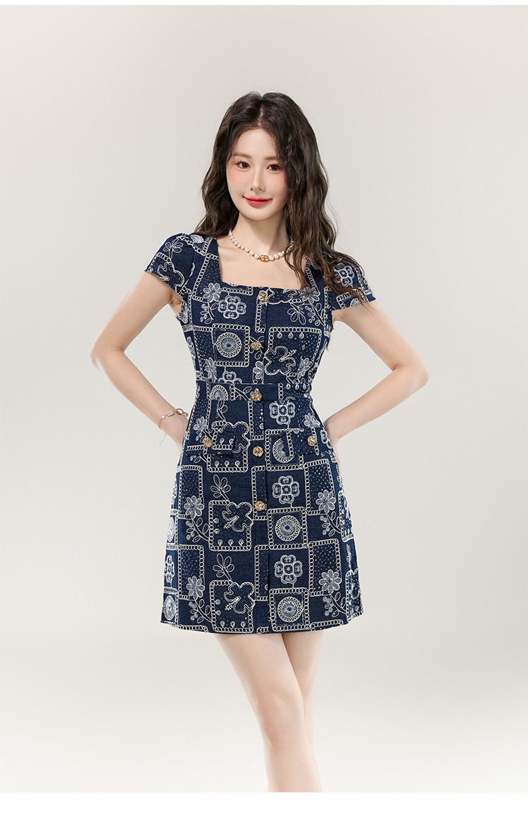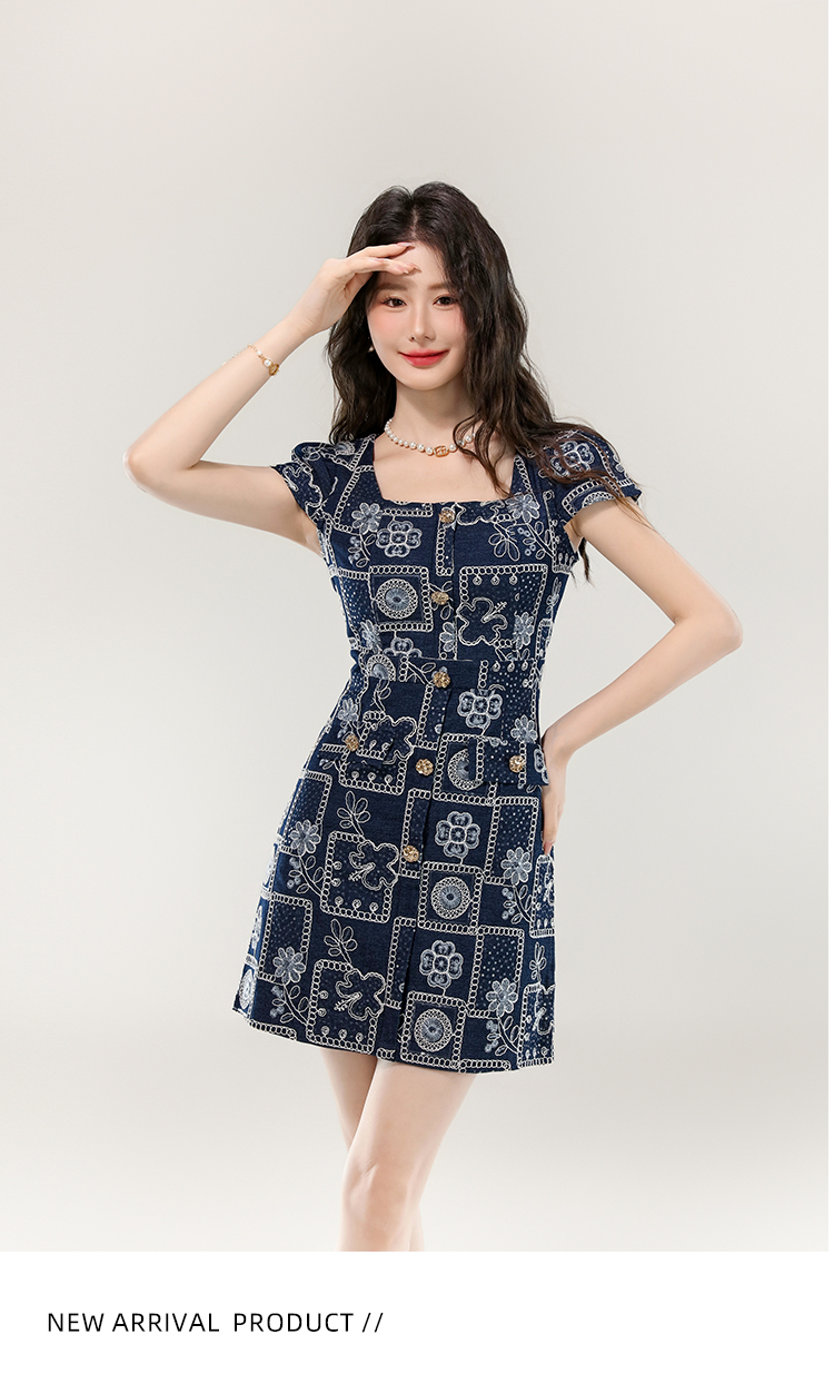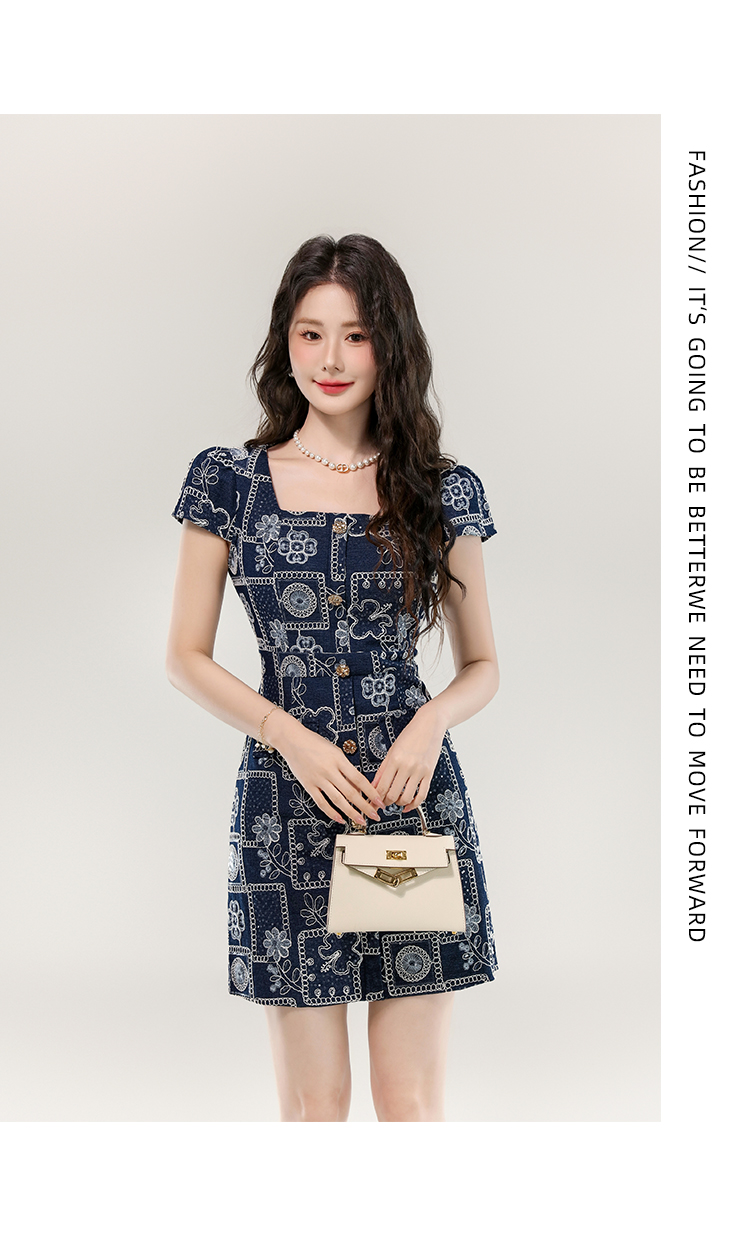 MY16859# 夏款高级感法式气质收腰显瘦泡泡袖刺绣a字连衣裙女裝貨源服裝批發