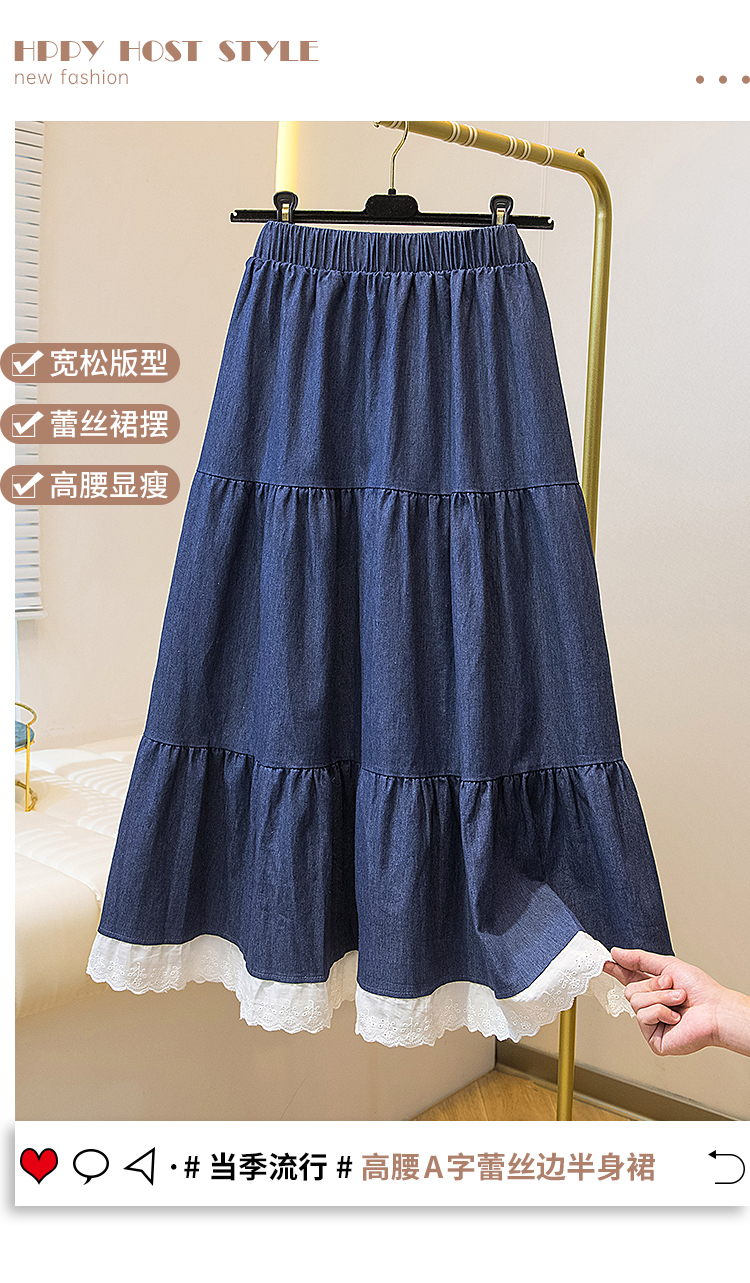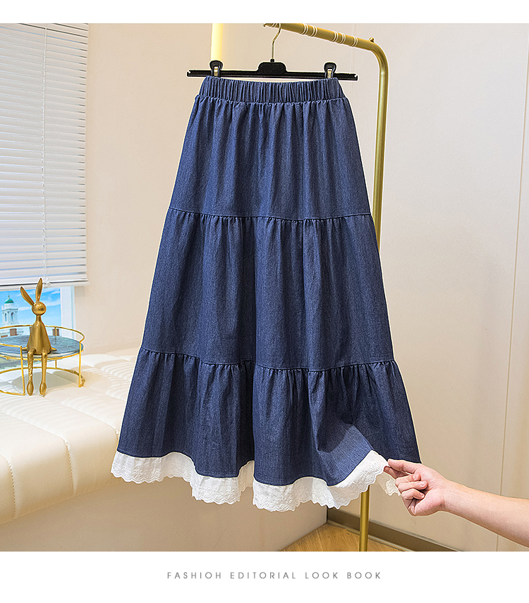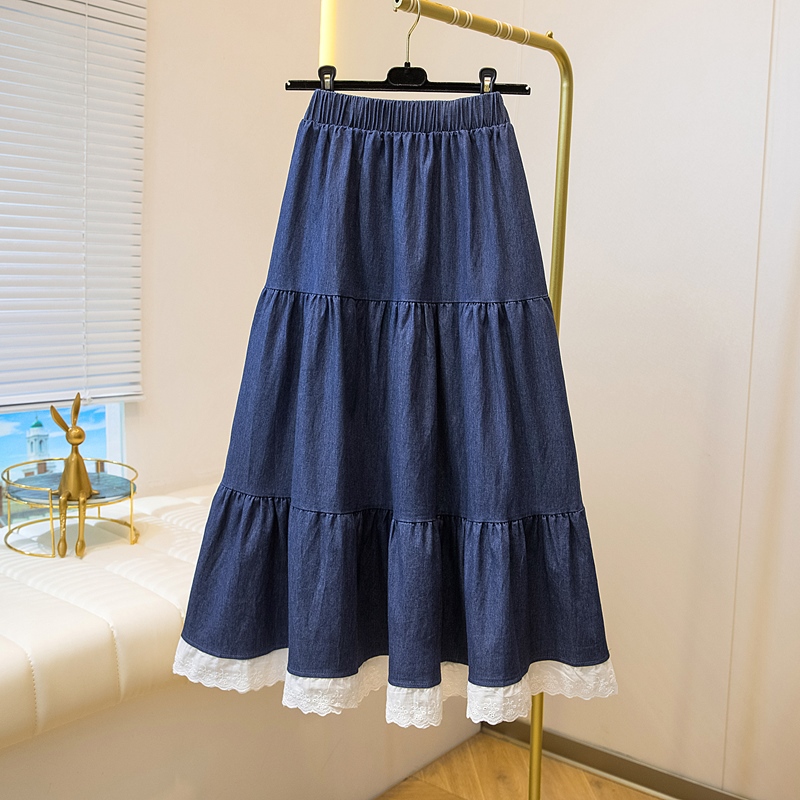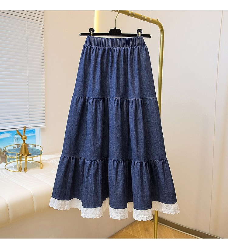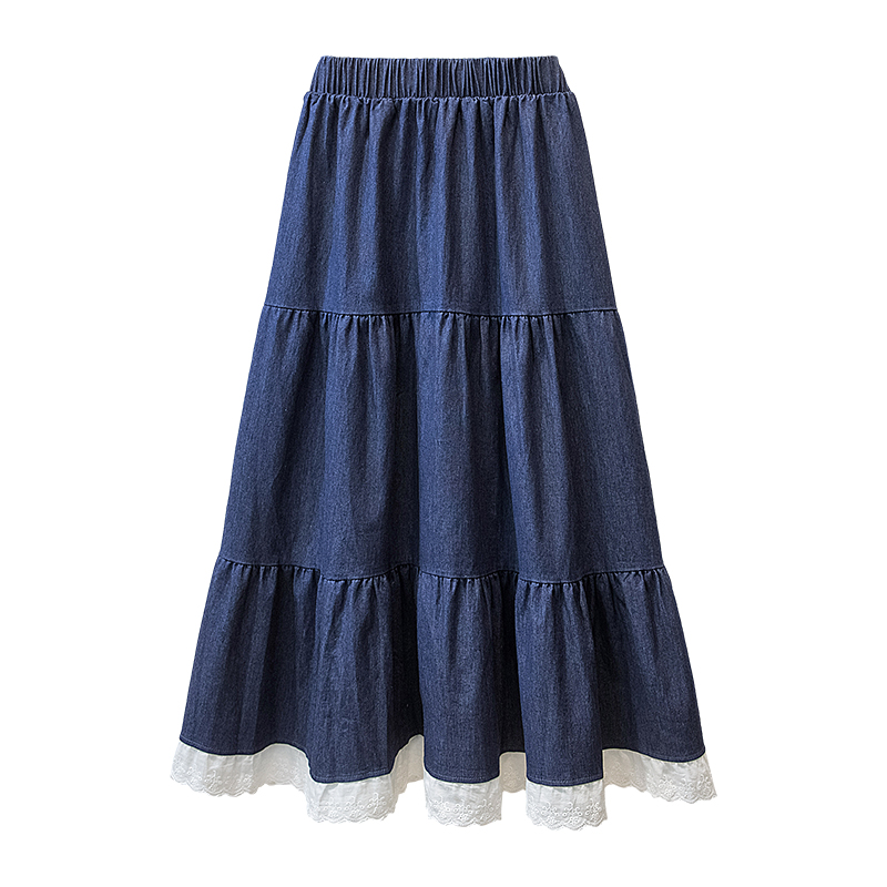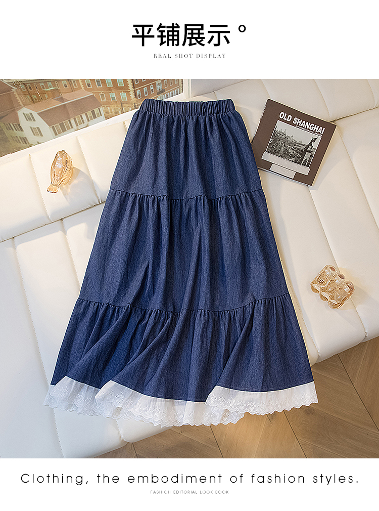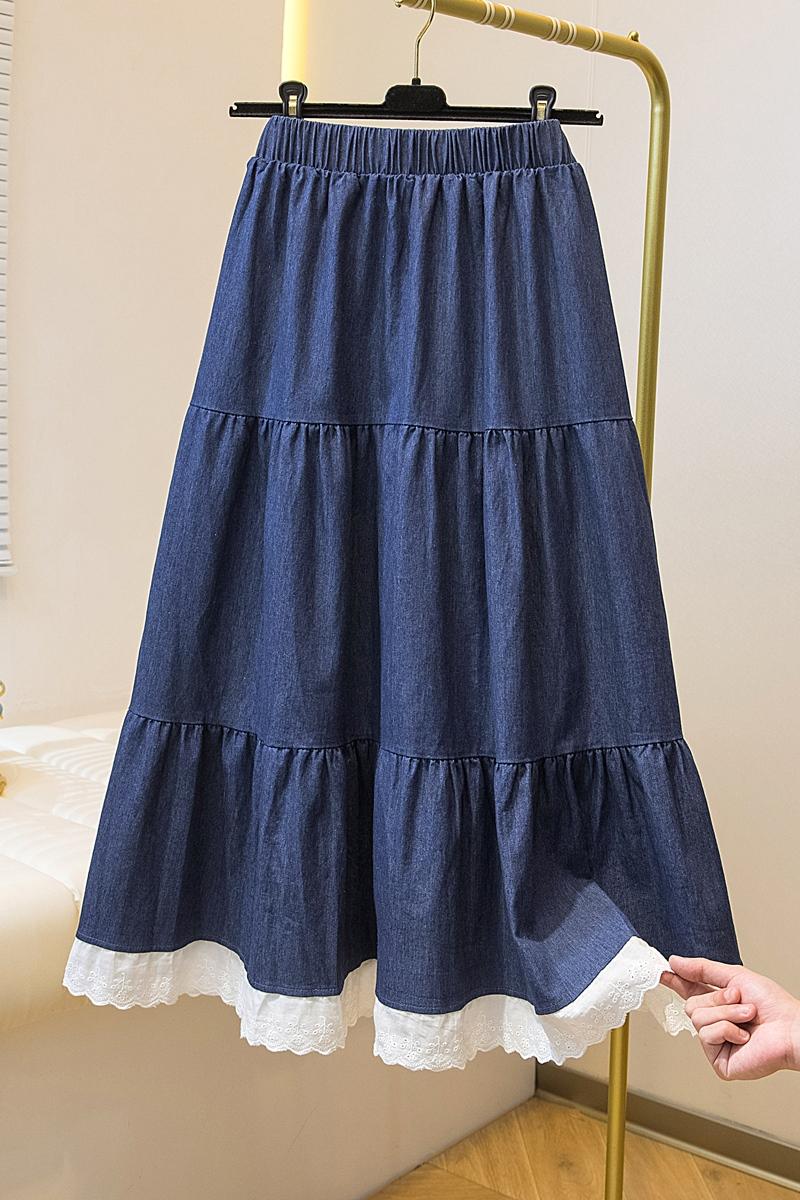 MY16906# 蕾丝拼接牛仔半身裙新款宽松百搭膝盖裙韩版中长款伞裙女裝貨源服裝批發