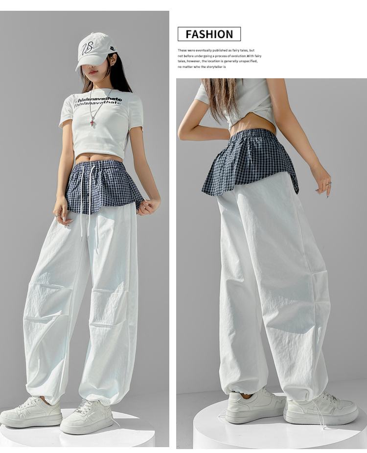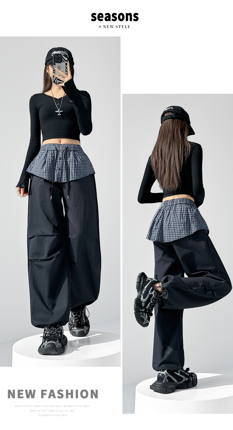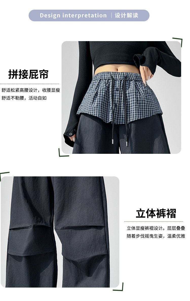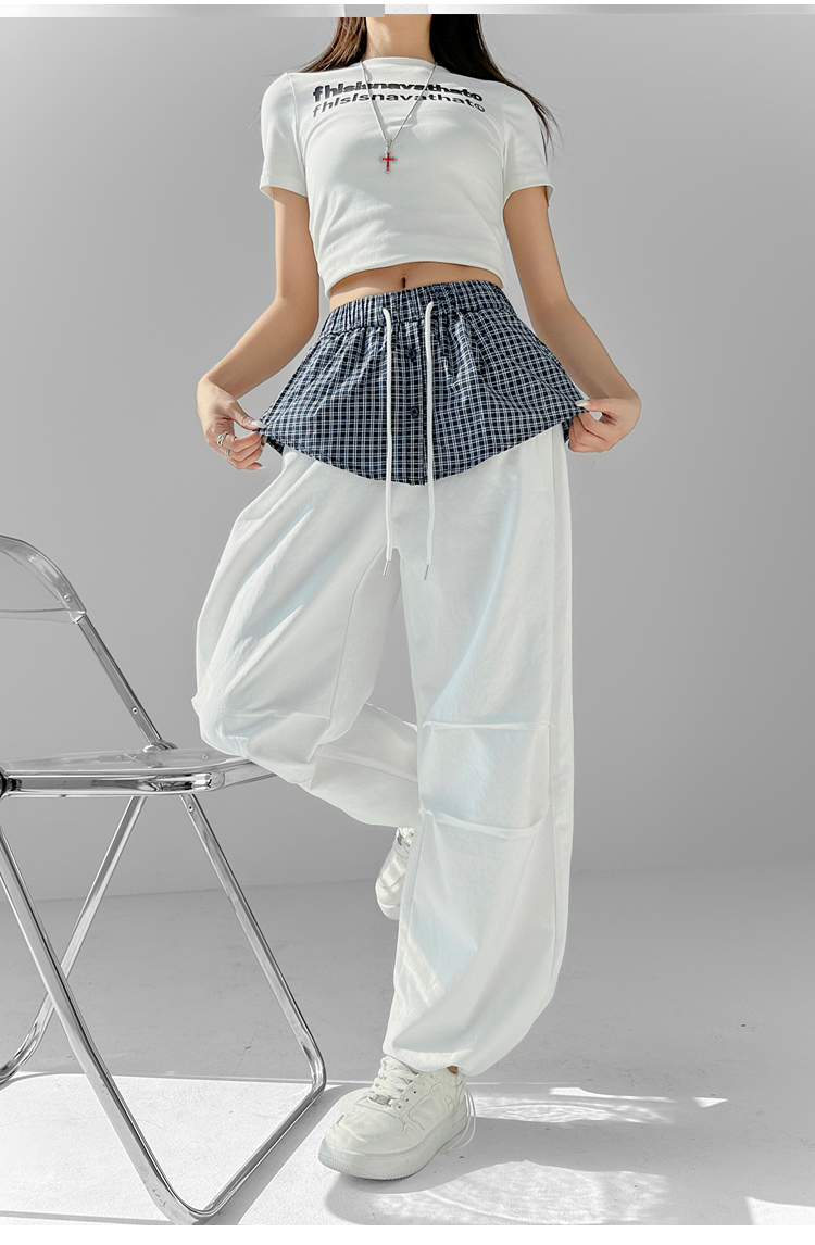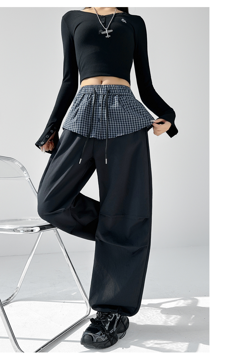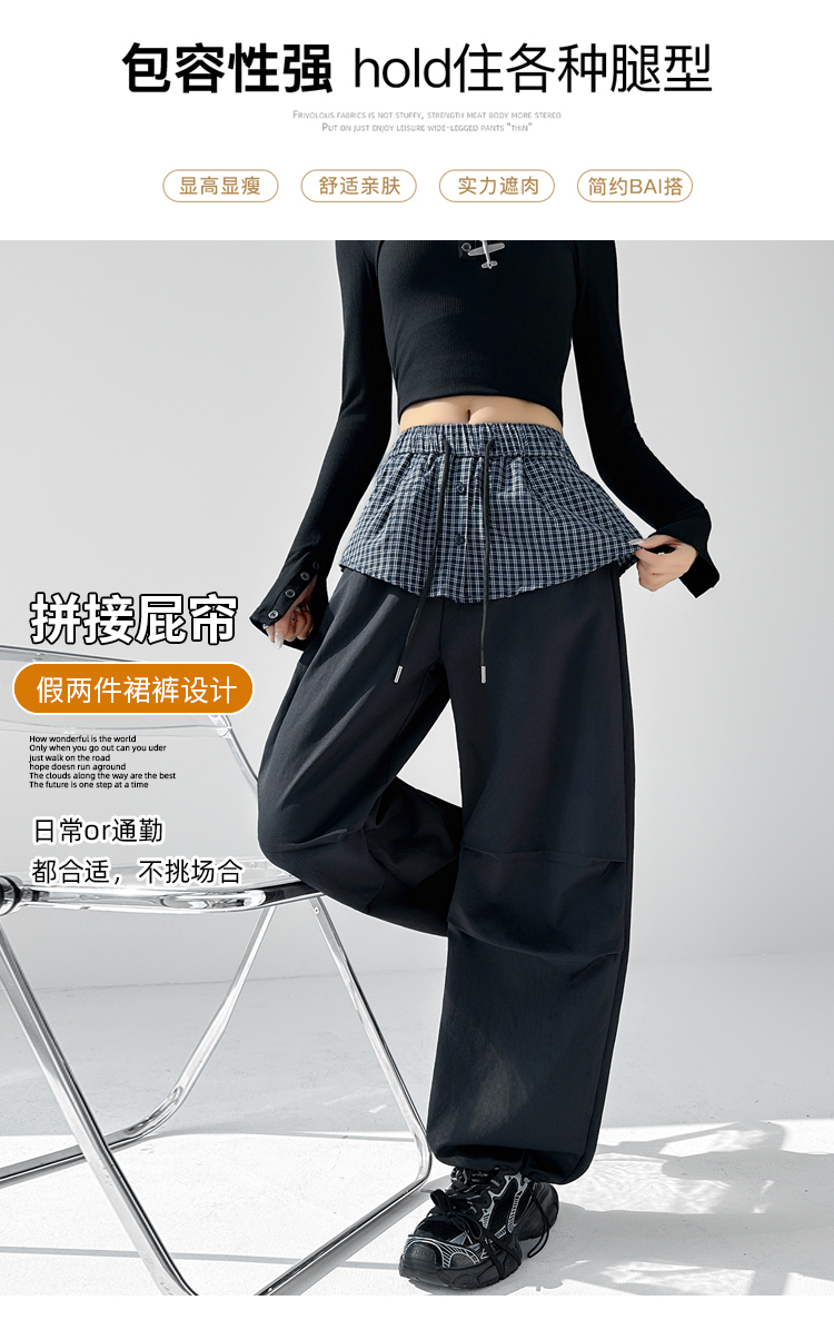MY16921# 格子拼接屁帘休闲裤新款中高腰宽松显瘦抽绳长裤女裝貨源服裝批發