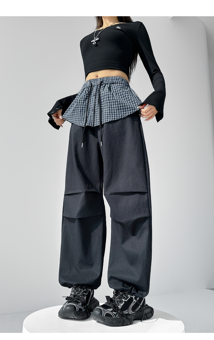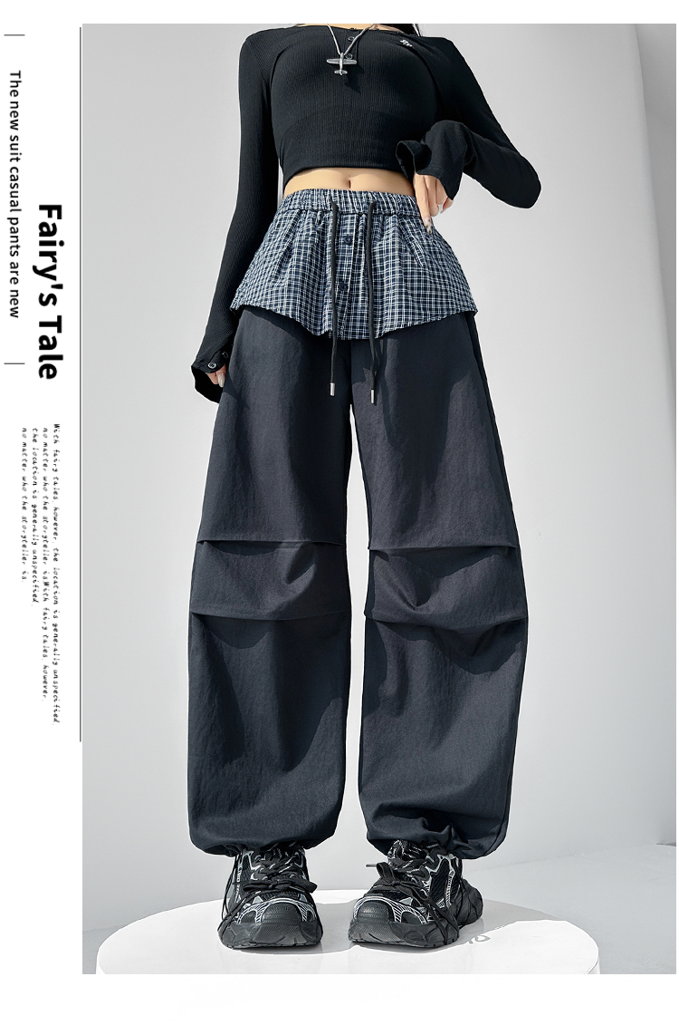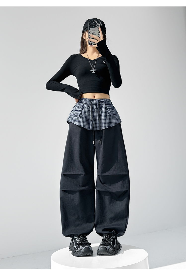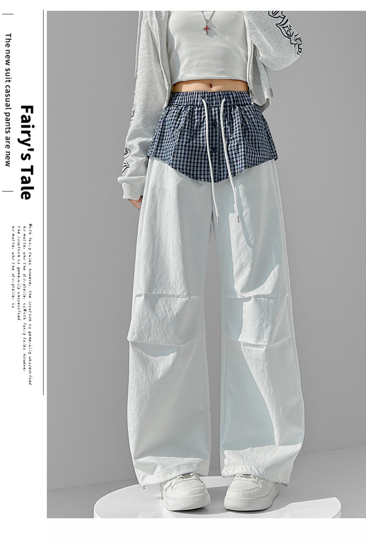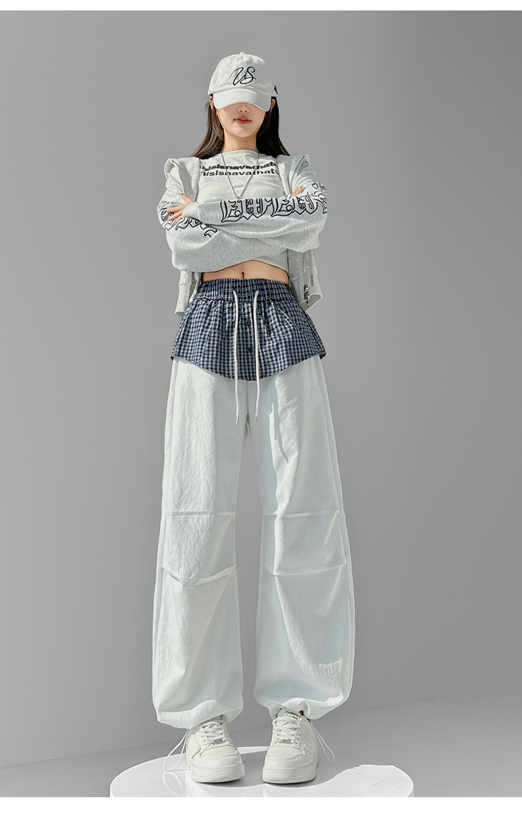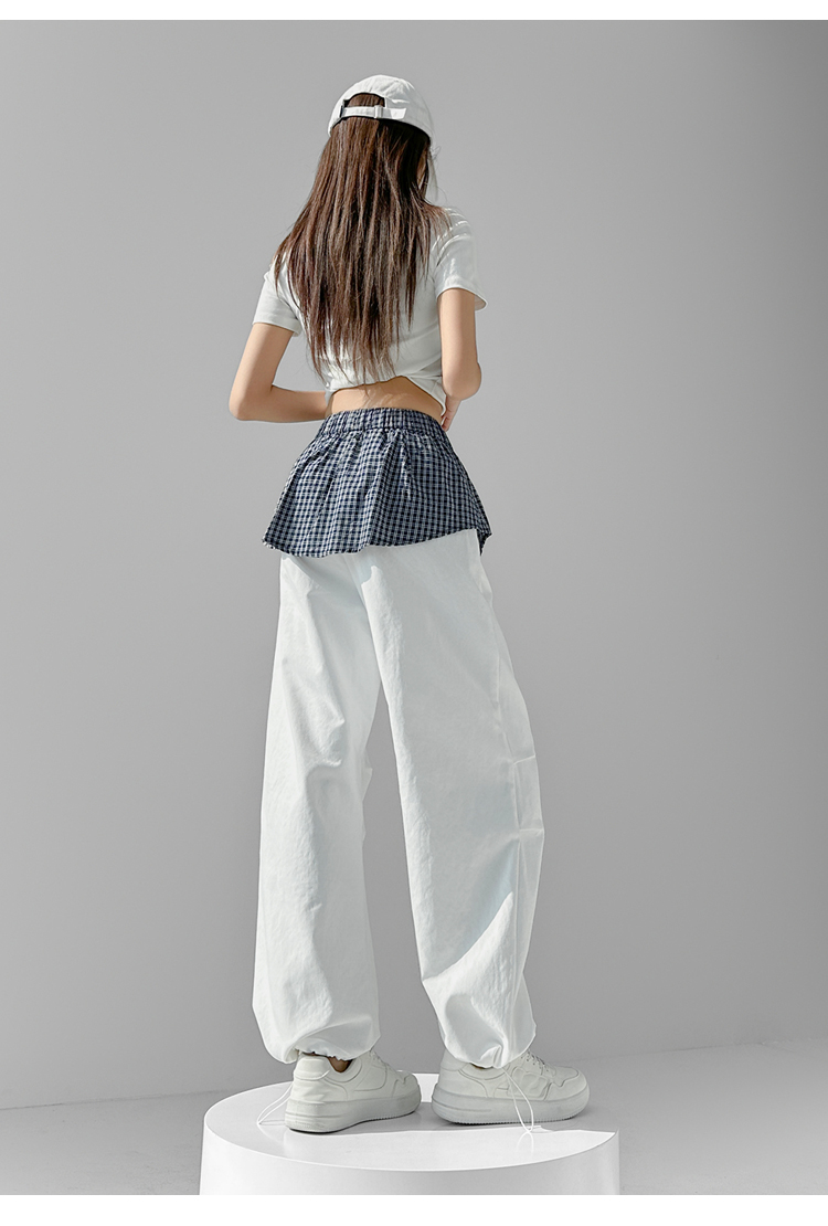 MY16921# 格子拼接屁帘休闲裤新款中高腰宽松显瘦抽绳长裤女裝貨源服裝批發