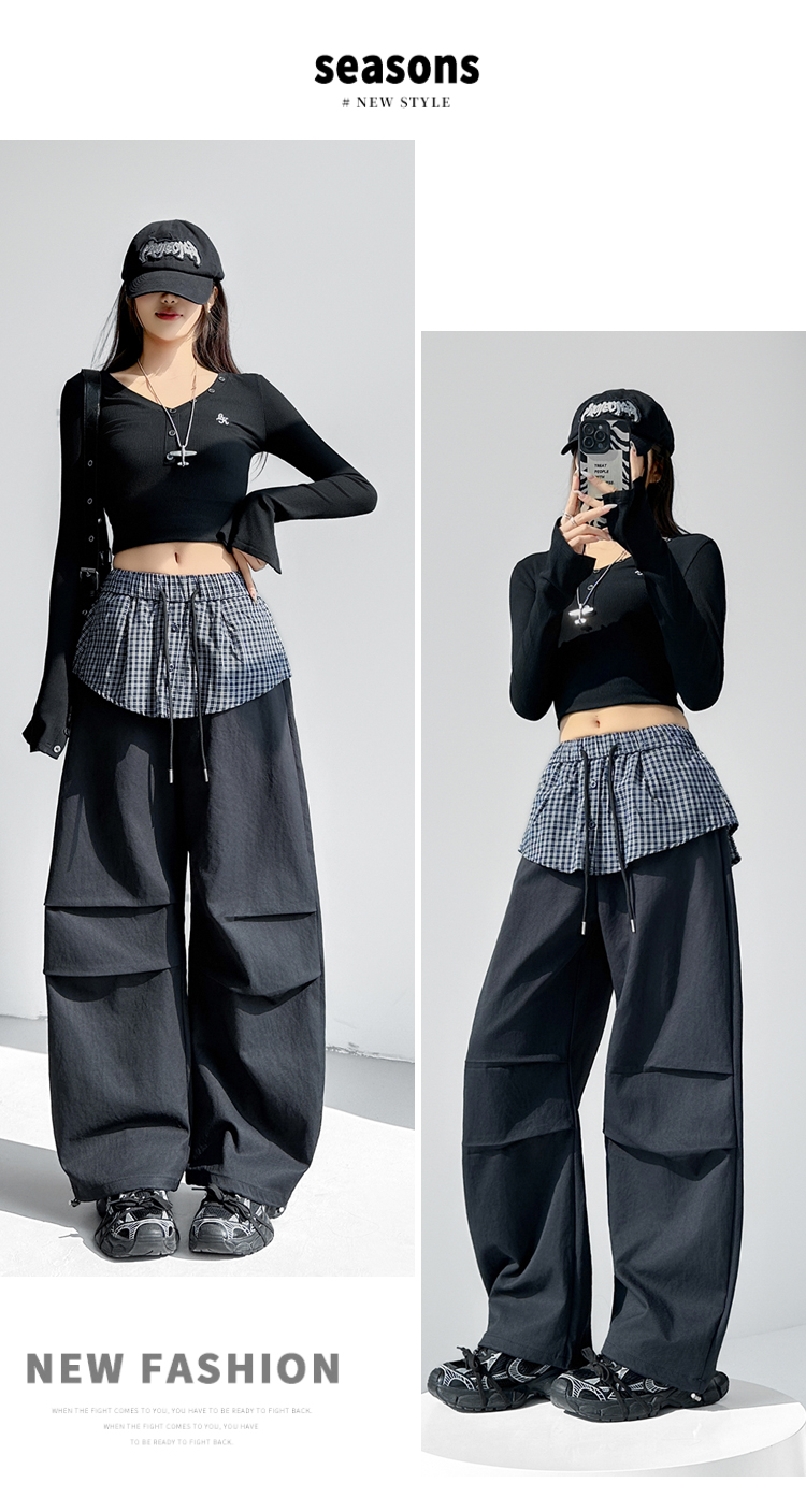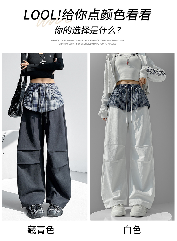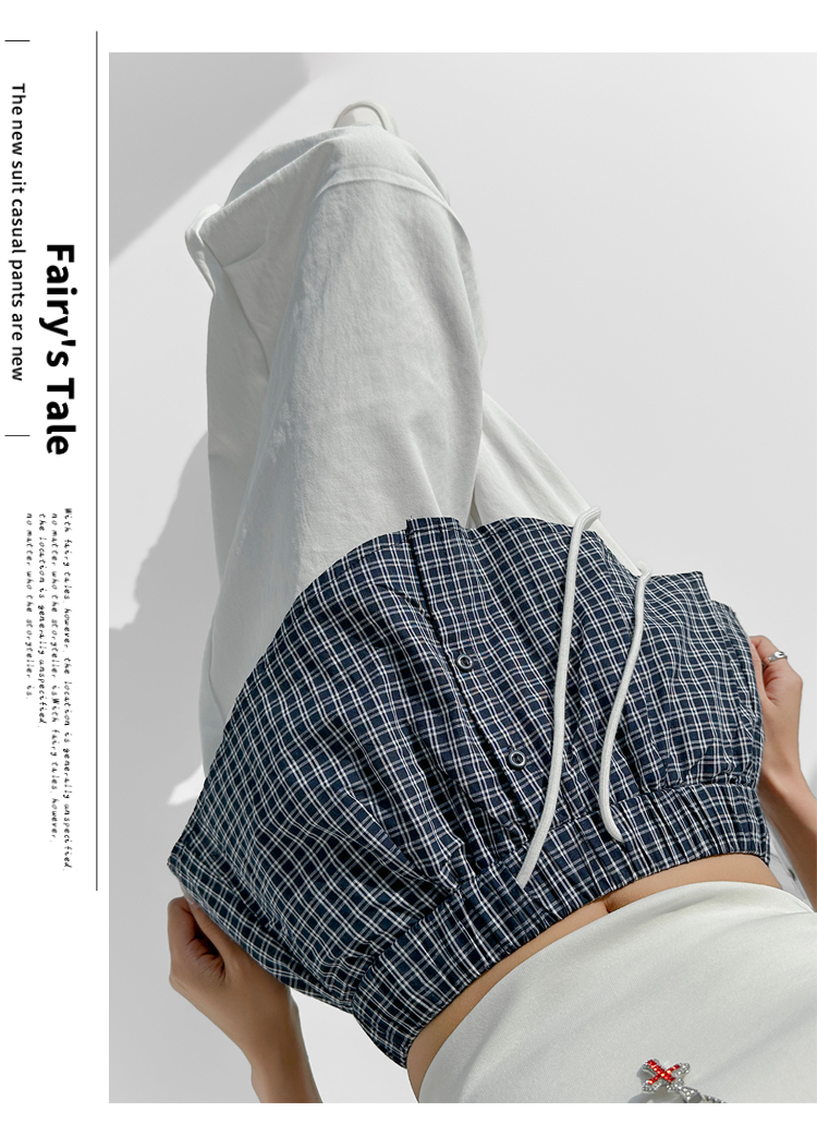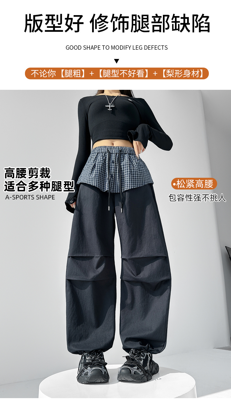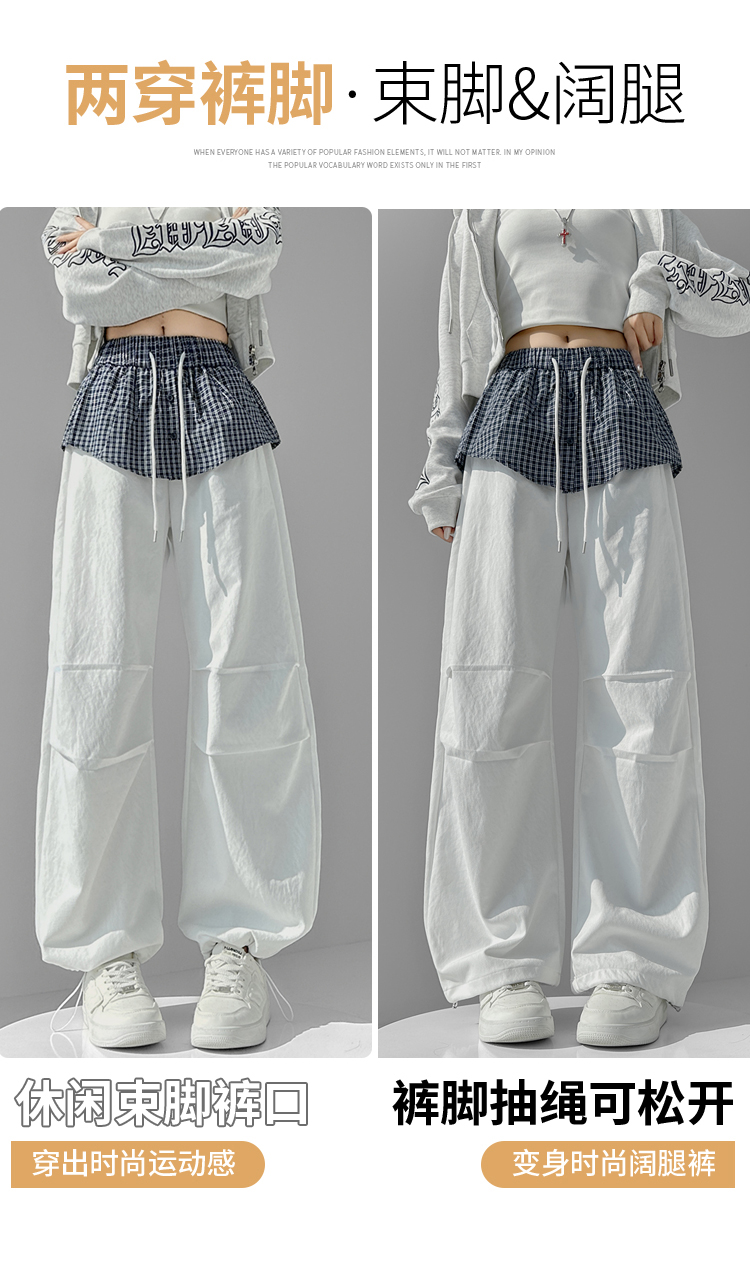 MY16921# 格子拼接屁帘休闲裤新款中高腰宽松显瘦抽绳长裤女裝貨源服裝批發