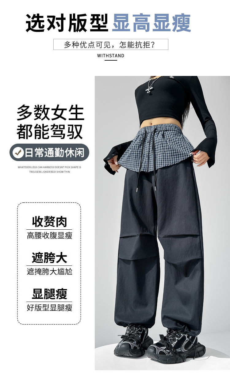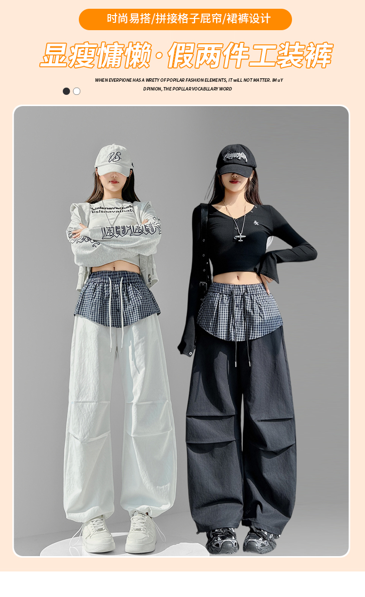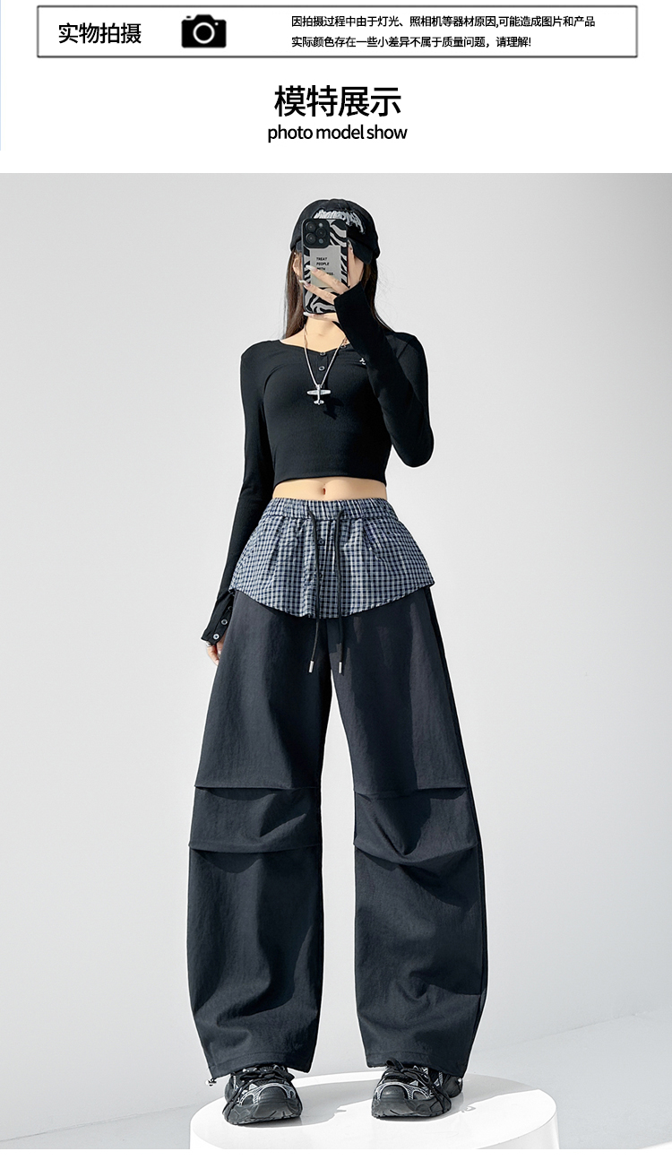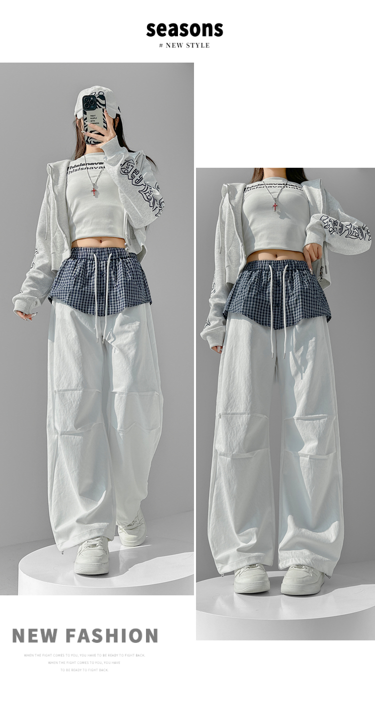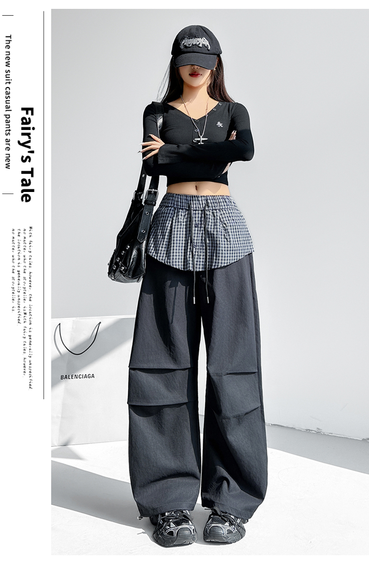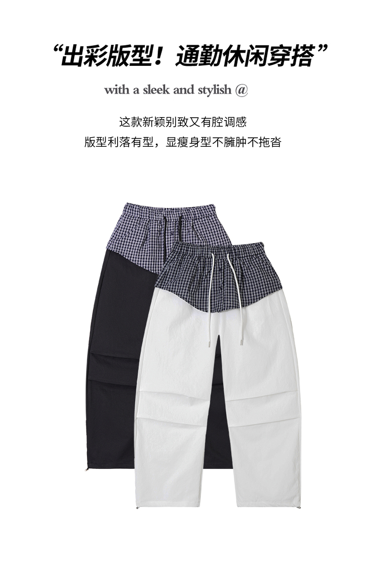 MY16921# 格子拼接屁帘休闲裤新款中高腰宽松显瘦抽绳长裤女裝貨源服裝批發