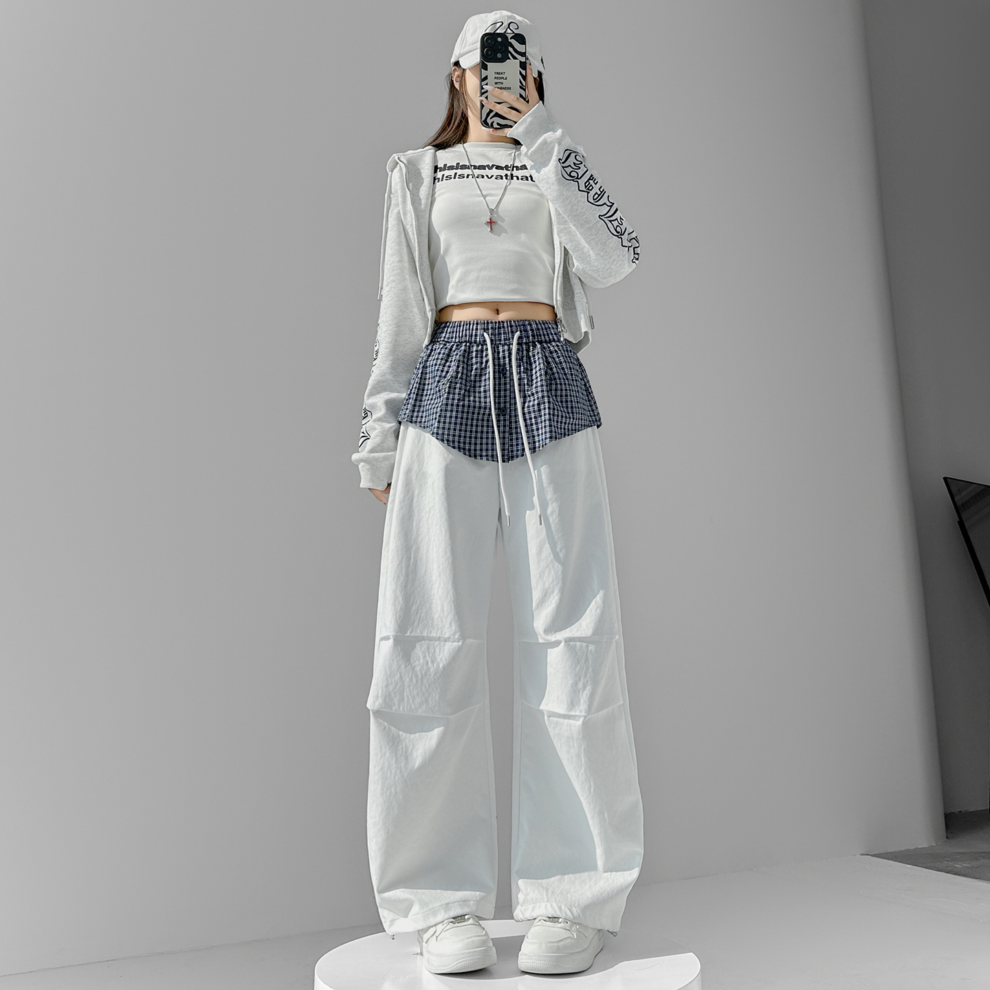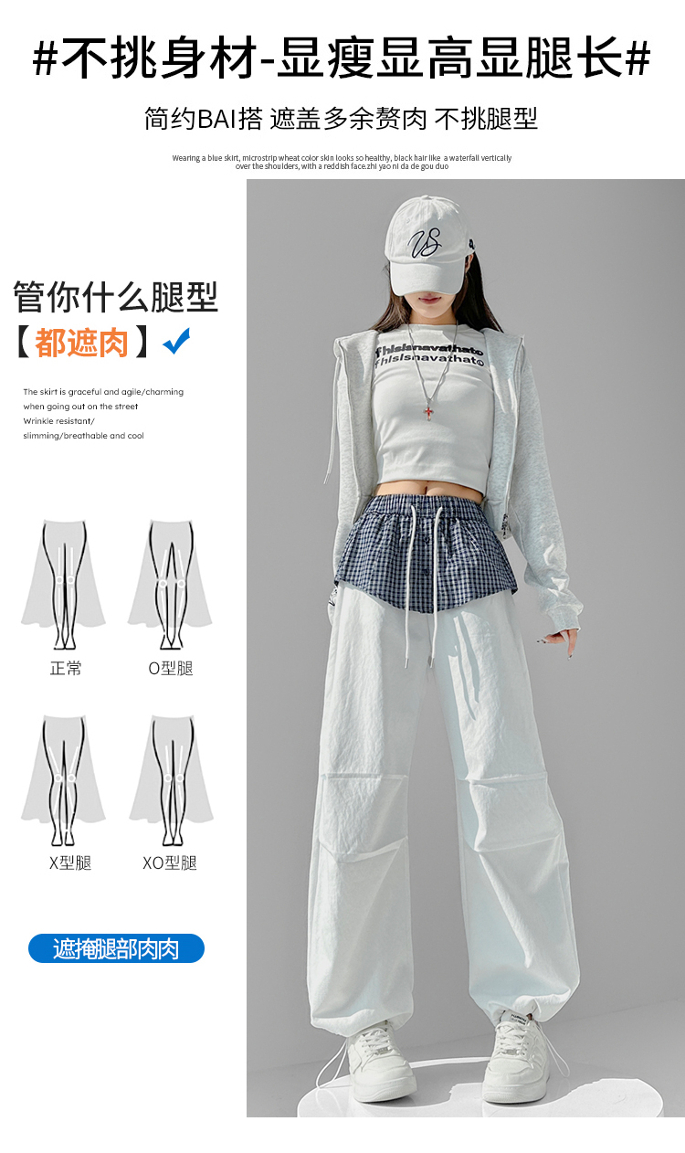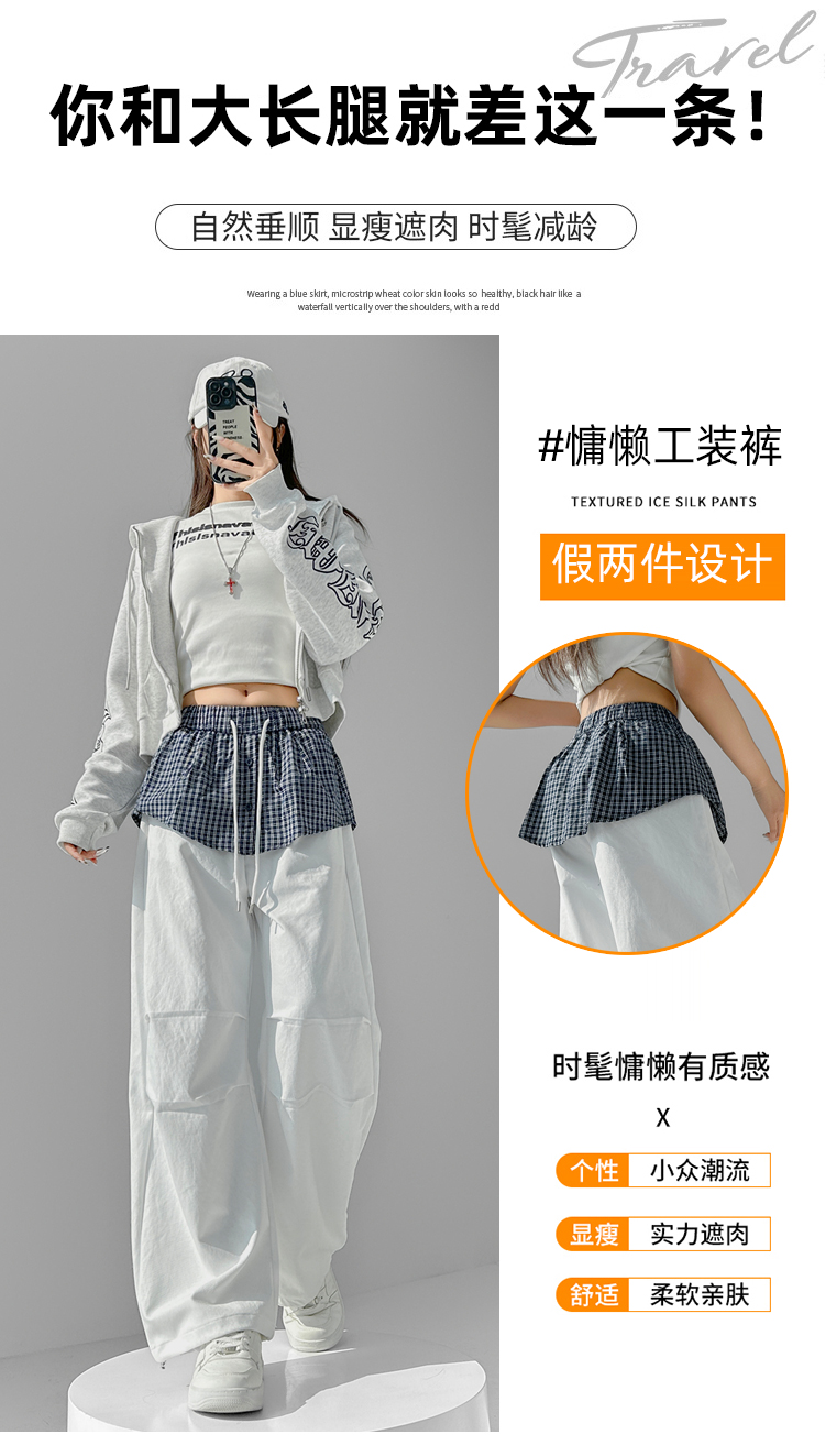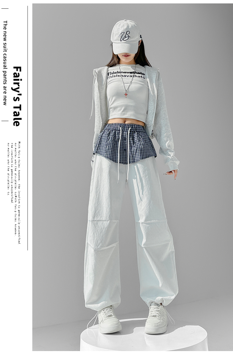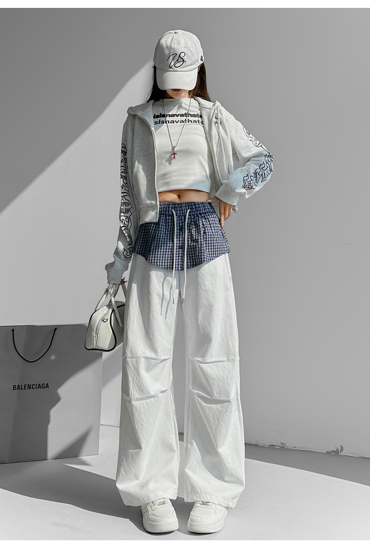 MY16921# 格子拼接屁帘休闲裤新款中高腰宽松显瘦抽绳长裤女裝貨源服裝批發