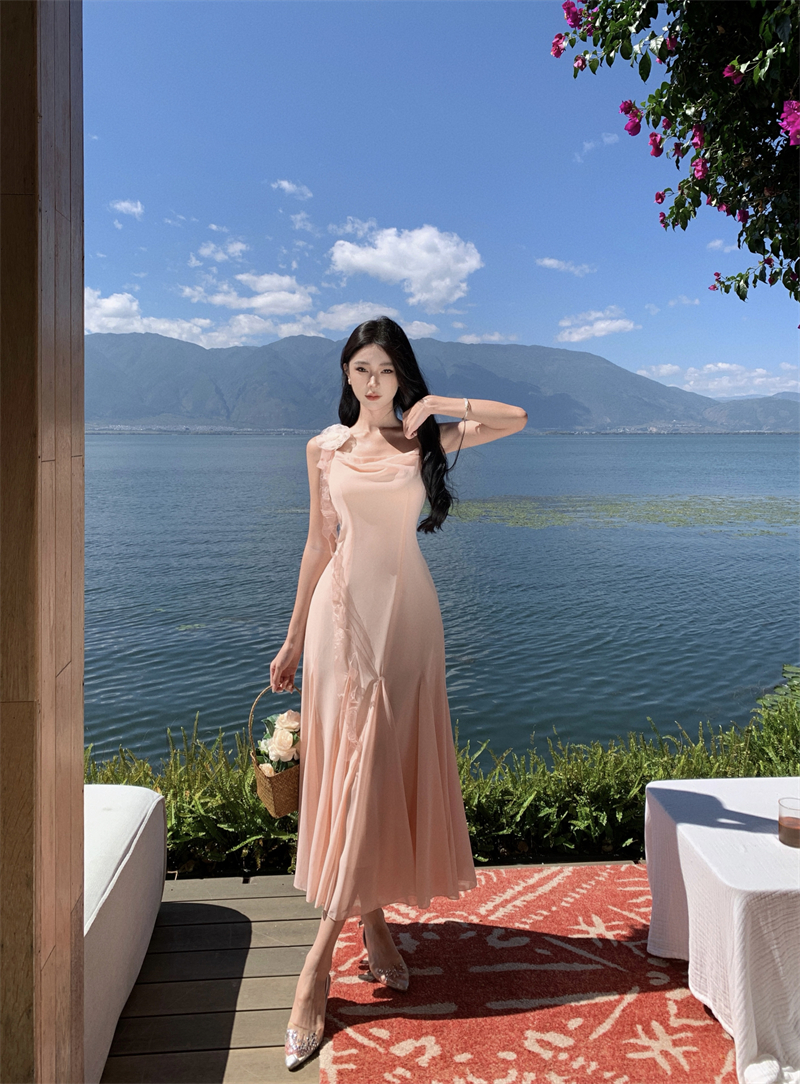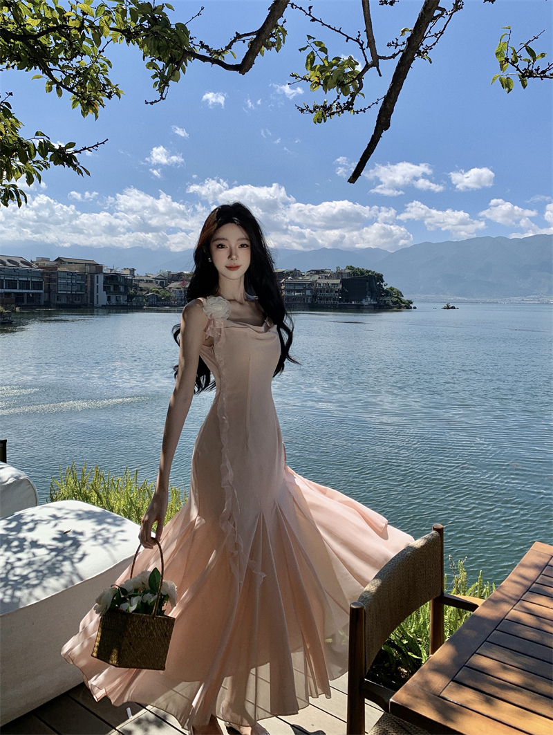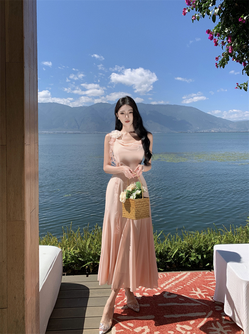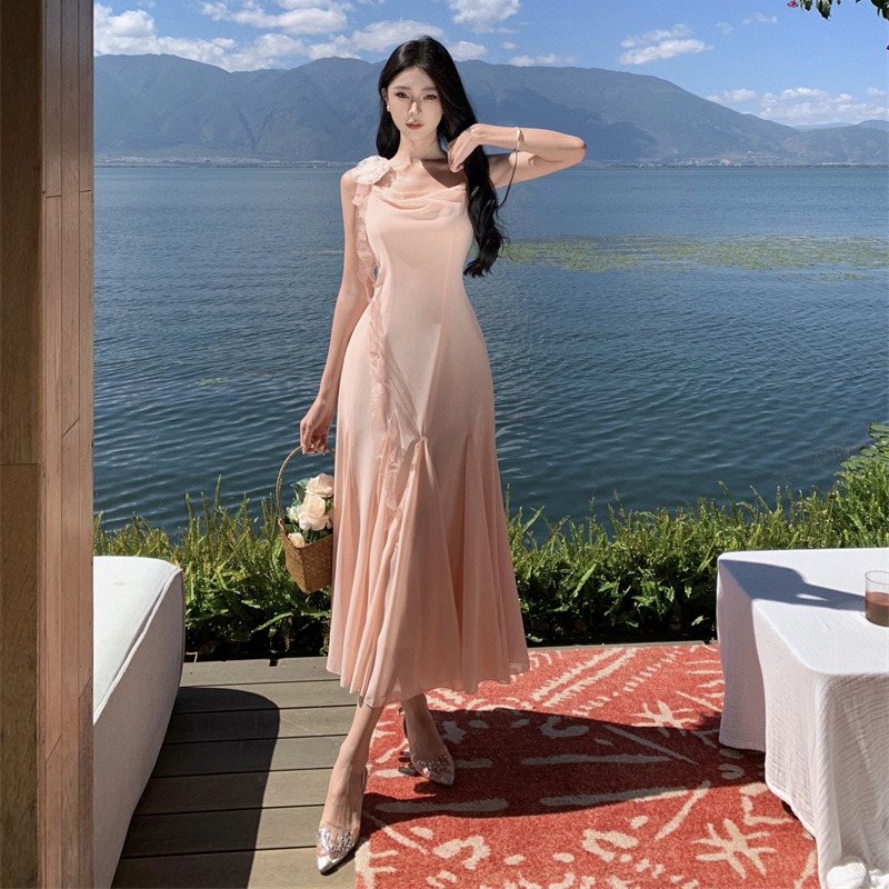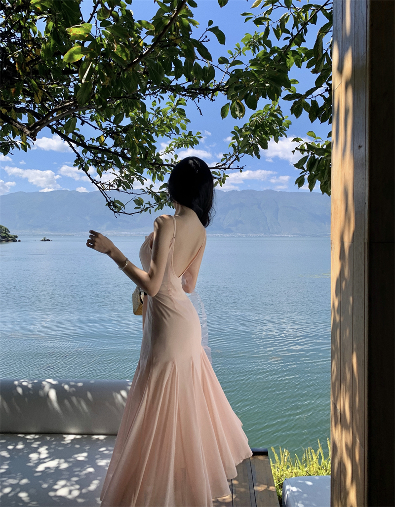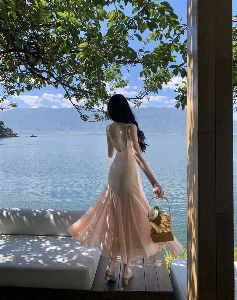 MY16923# 草木葱茏的凉意仙气飘飘气质大露背粉色吊带裙女夏季收腰显瘦长裙女裝貨源服裝批發